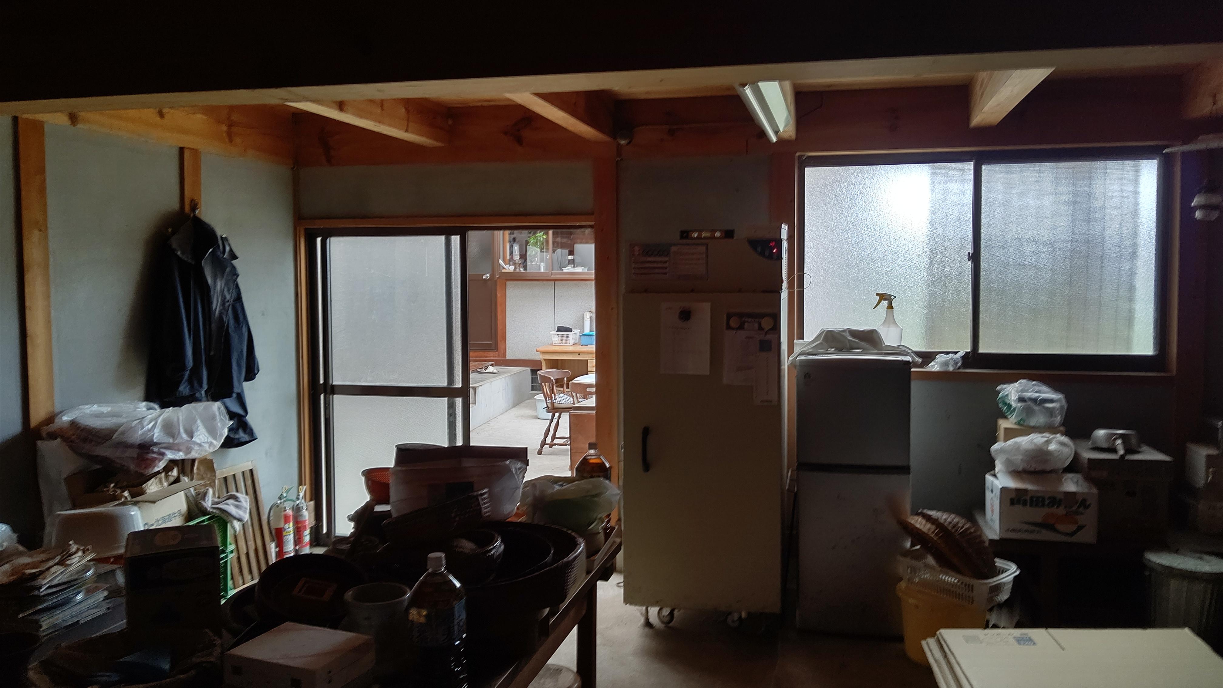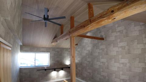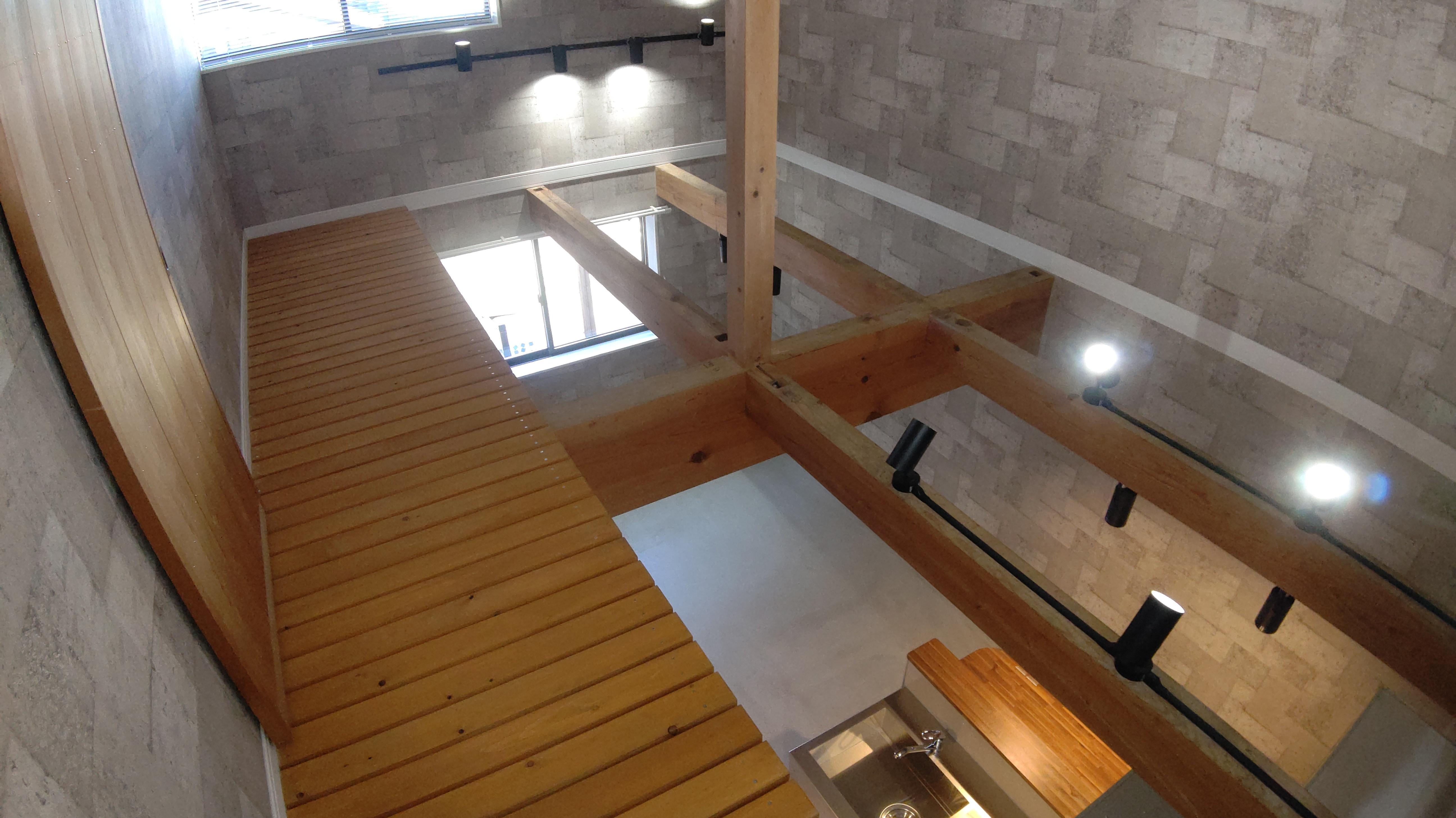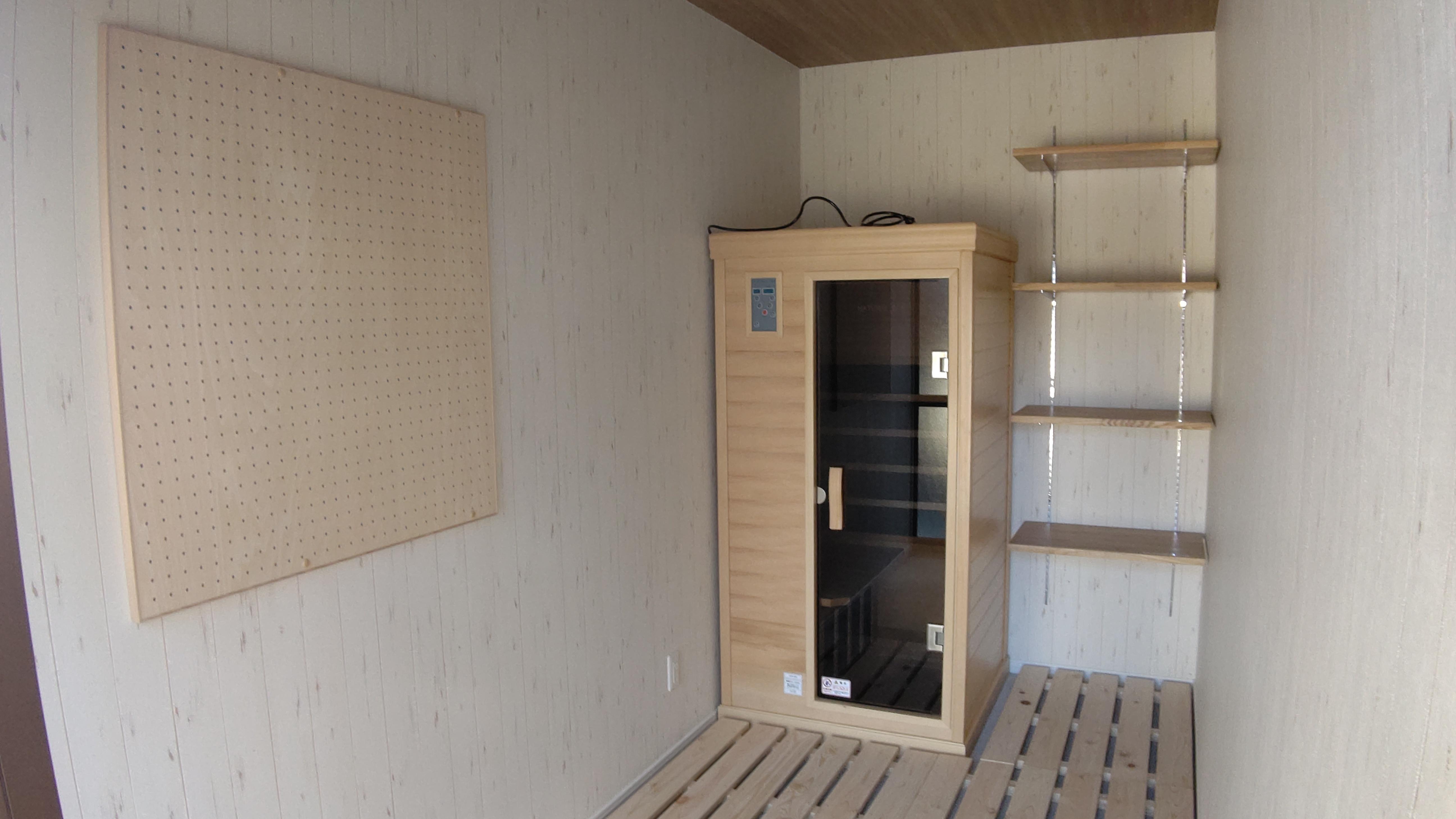 農機具部屋を全面改修しました! 1Fは吹き抜けにして、 元々あった2Fの扉をいかし 吹き抜けスペースで、 上からも下からも見渡せる楽しい空間となっています! そしてお家に手作りサウナスペースを作りました!