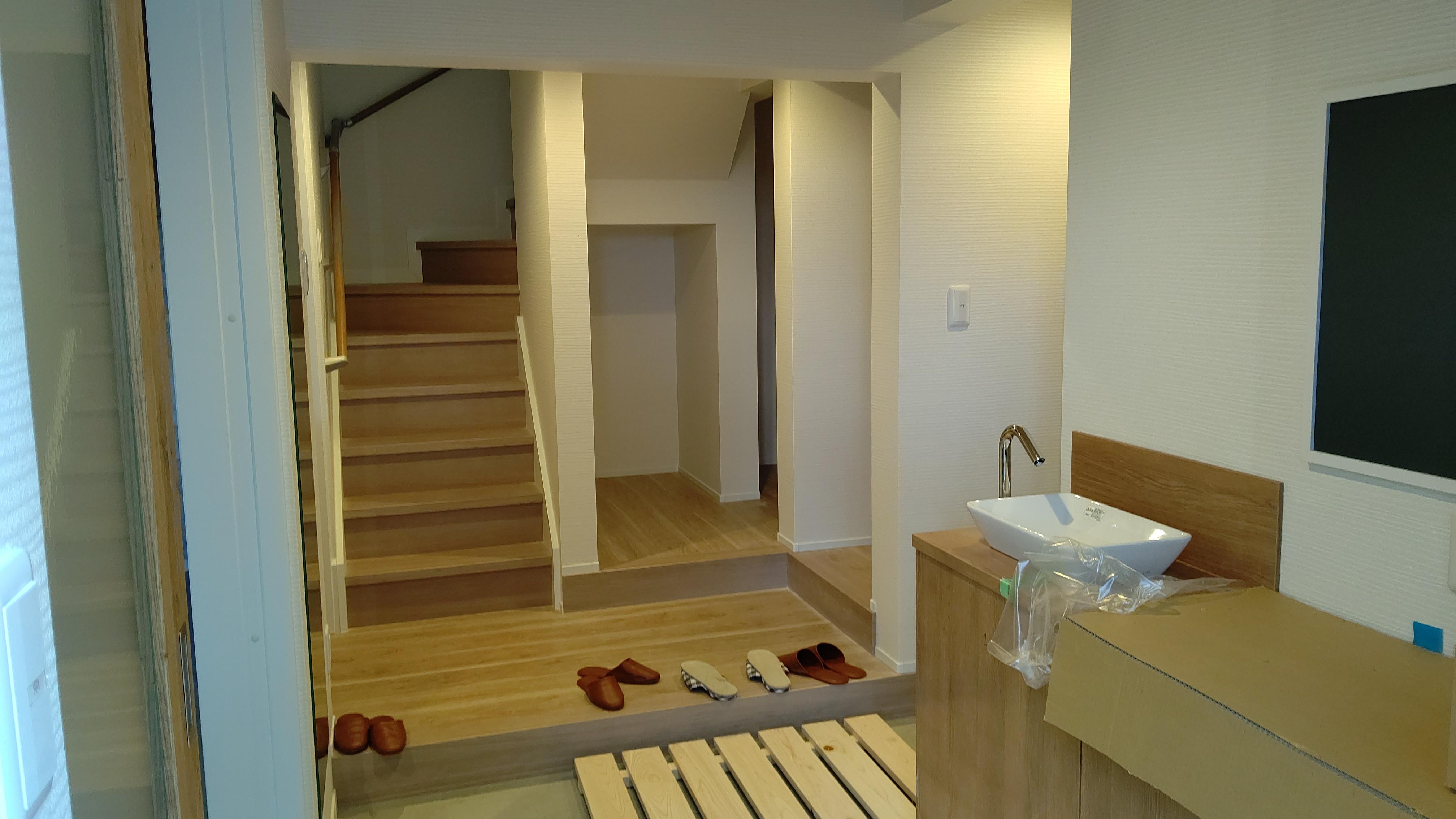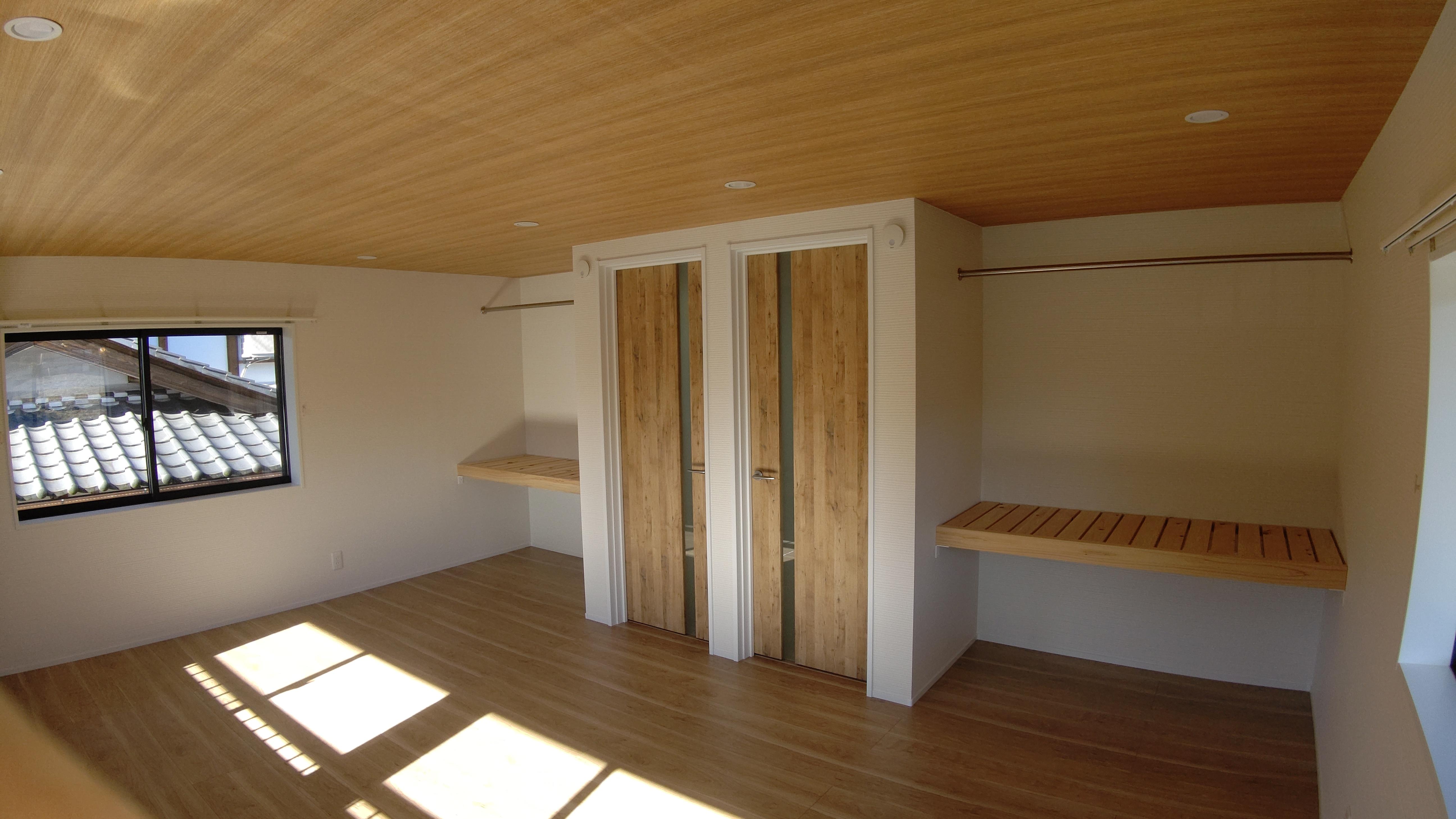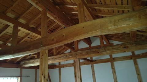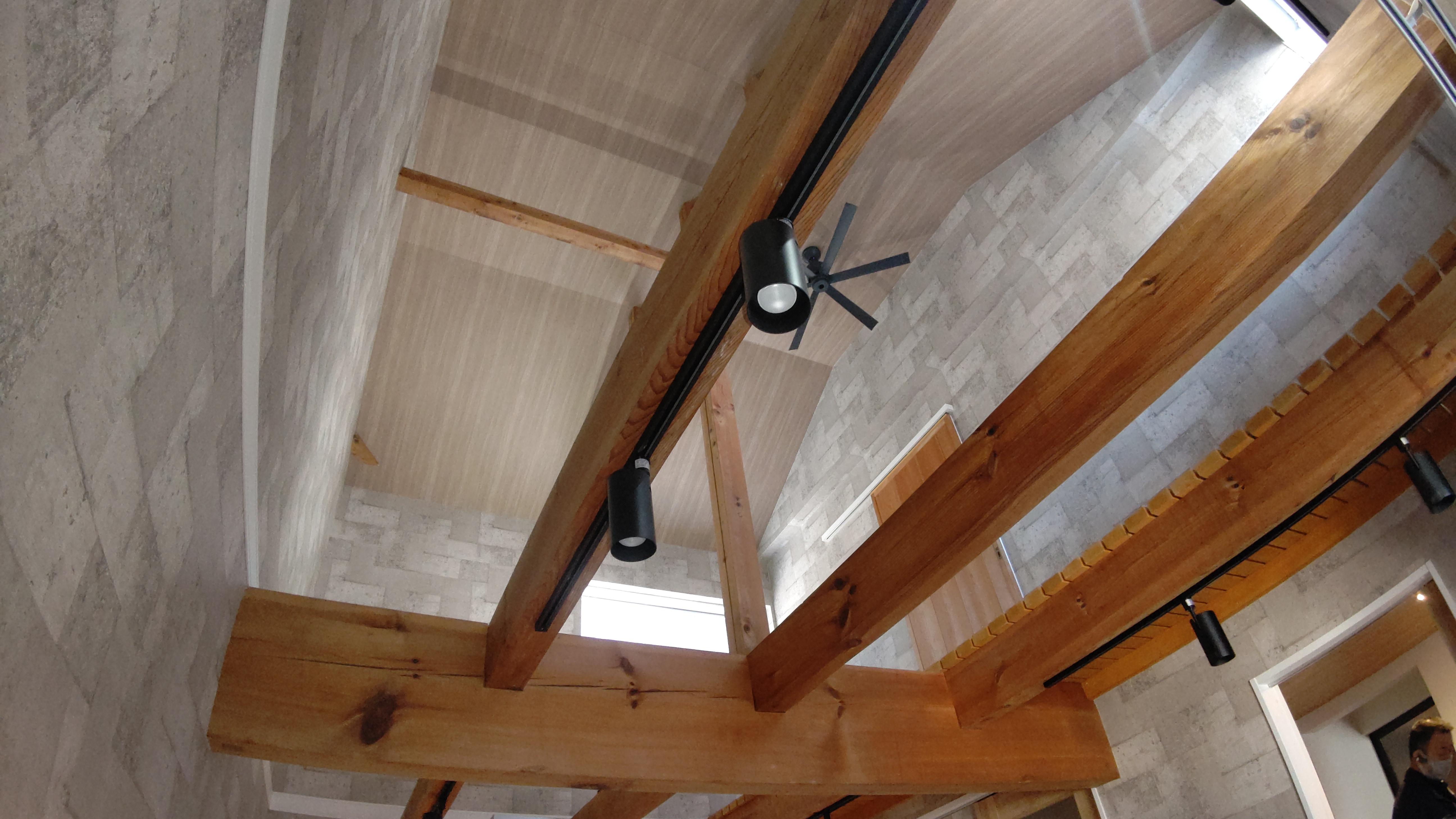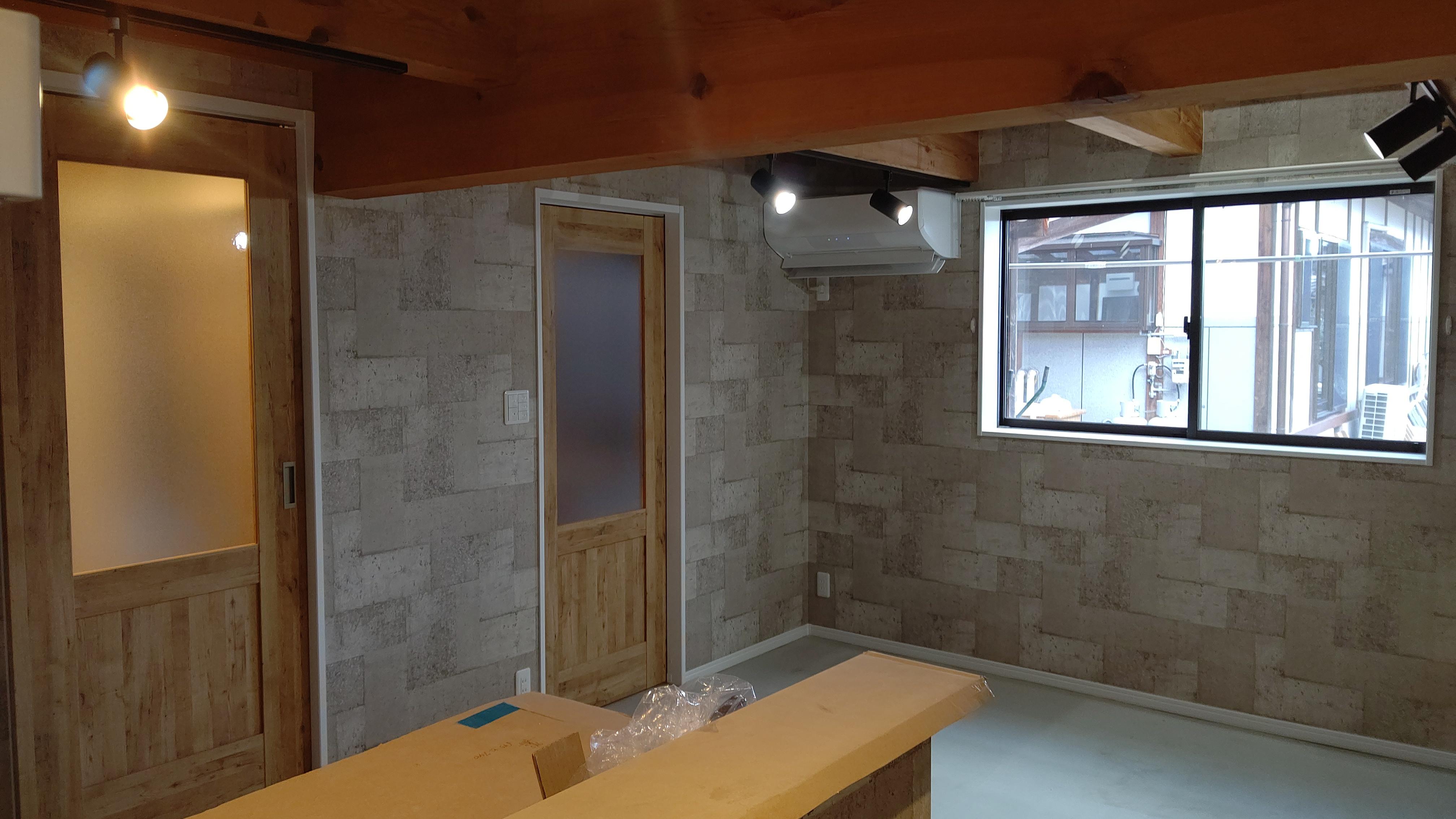 農機具部屋を全面改修しました! 1Fは吹き抜けにして、 元々あった2Fの扉をいかし 吹き抜けスペースで、 上からも下からも見渡せる楽しい空間となっています! そしてお家に手作りサウナスペースを作りました!