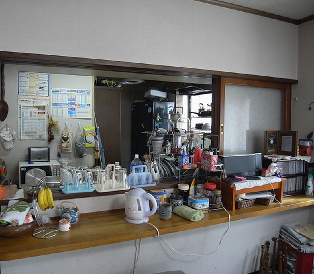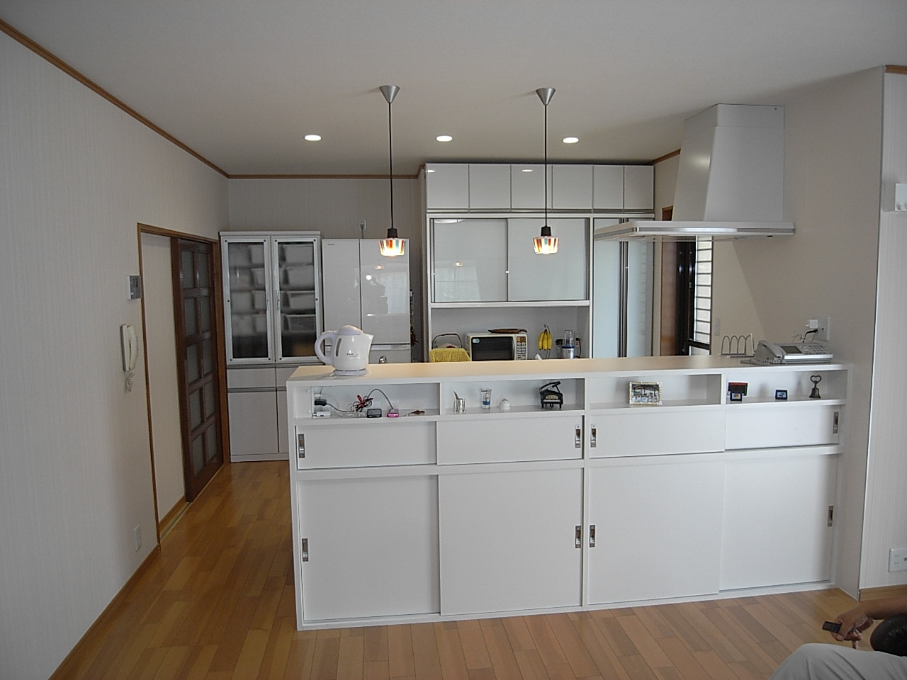 造作カウンター家具は、キッチンの上部がキッチン側からも収納できます。キッチンの間口一杯に収納されているのは、普段使いの食器、お二人分の食器の収納には十分な広さが確保できました。