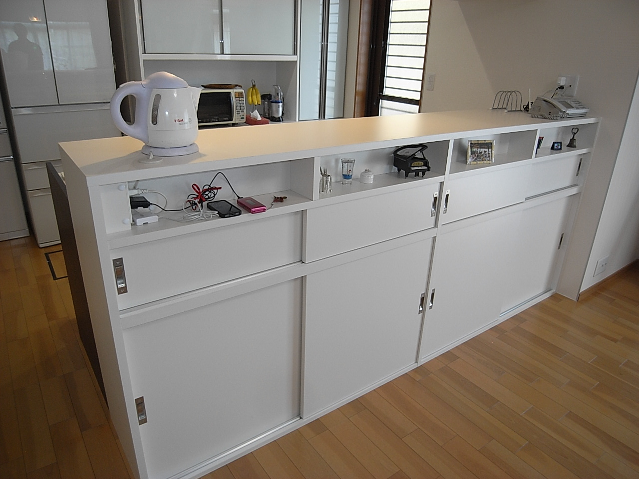 キッチンの対面カウンターは奥行き45cmのオーダー造作家具です。キッチンやリビングに物を置かない生活がしたいと奥様が考え抜かれ、何度も打合せさせていただいて完成しました。内部には引き出し式のボックスが納められ、広い奥行きを有効活用できます。リビング側上部はオープン棚とし、小物を飾って楽しんでいただける他、コンセントを設置し携帯電話の充電も湯沸しポットの使用もできます。(天板に孔を空け、湯沸かしポットのコードも通して置けます)。この家具のおかげでリビングに物が置かれなくなって、とてもスッキリしたと奥様。ご主人様が片付け上手になられたとか・・・。