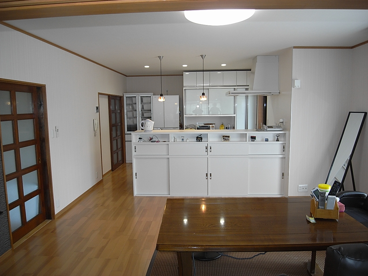 DKとリビングの間仕切り建具はリフォーム前の建具を再利用しています。4本建ての引違い建具でしたが、4本全てを壁に引き込むことができる建具に変更しました。引き込み壁もアクリル板を使ったスクリーンとし、採光を妨げないようにしたため、建具を開放すると広々としたLDKとなります。