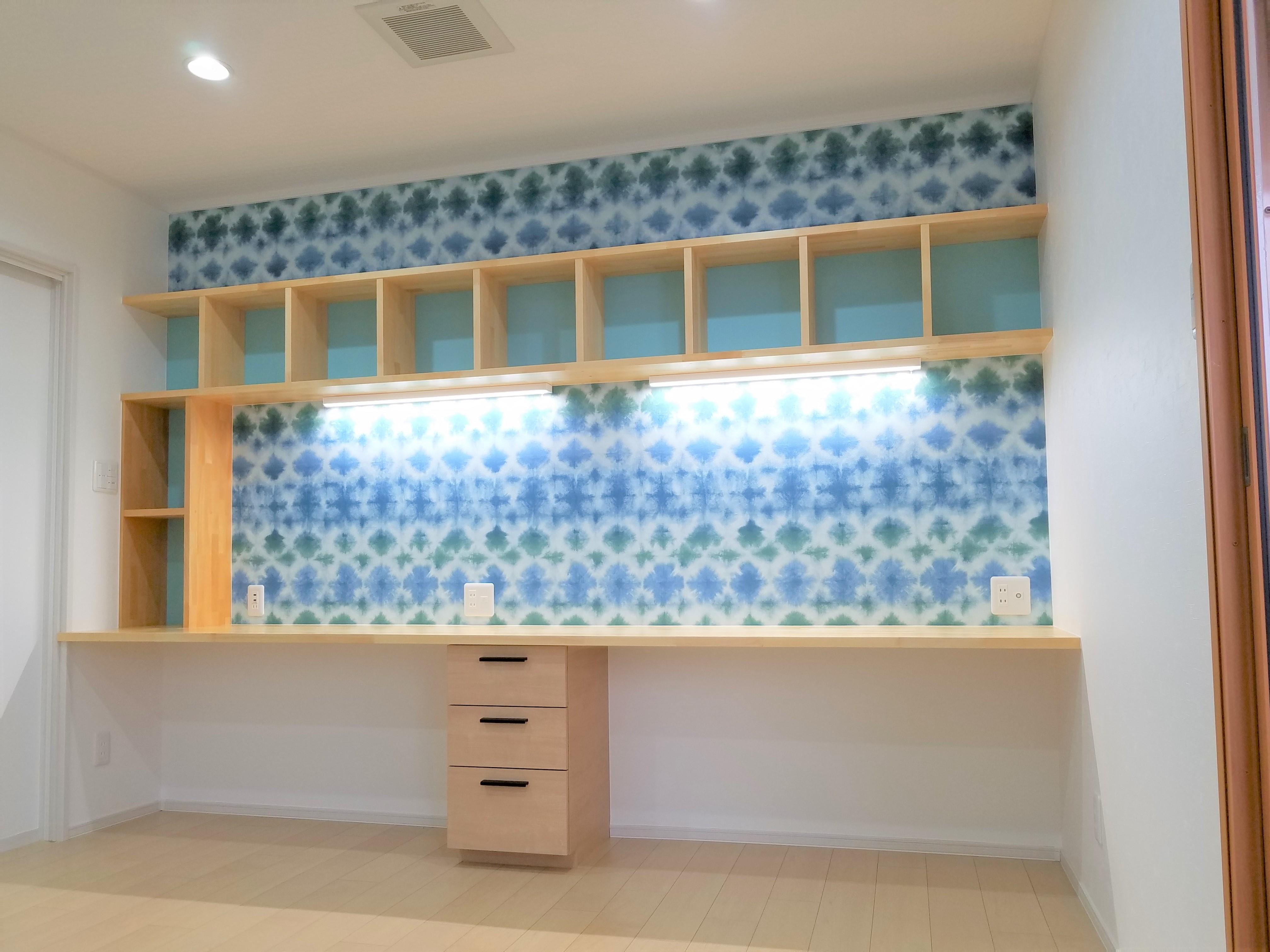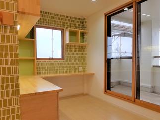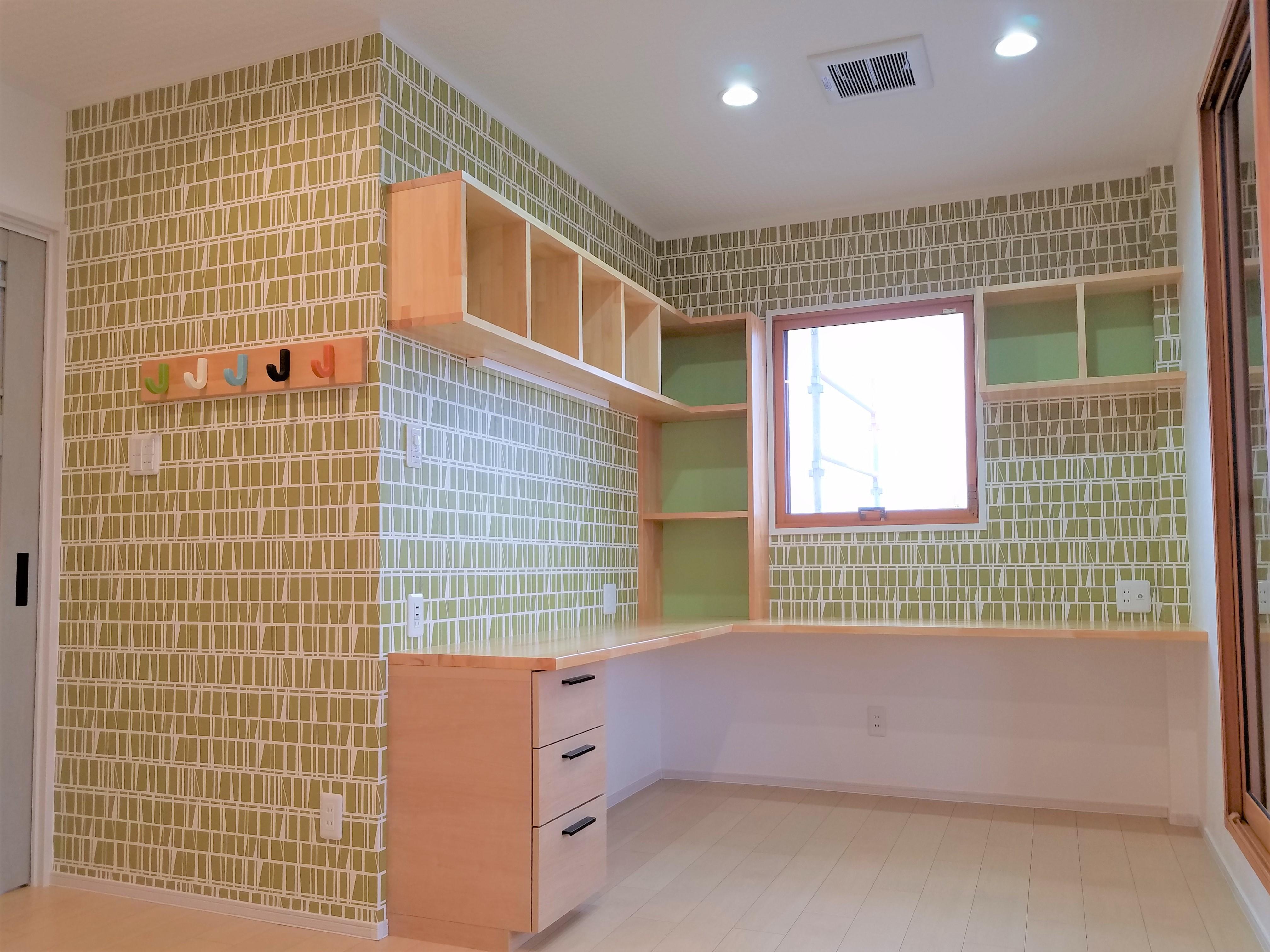 3室あった子供部屋を 2室に。 部屋は明るく 楽しい雰囲気で仕上がりました。 勉強机は カウンターにして、 本は、片付けられるように本棚をたくさん設けました。 大事なプリントは 目の前の壁に マグネットで貼ってくださいね。