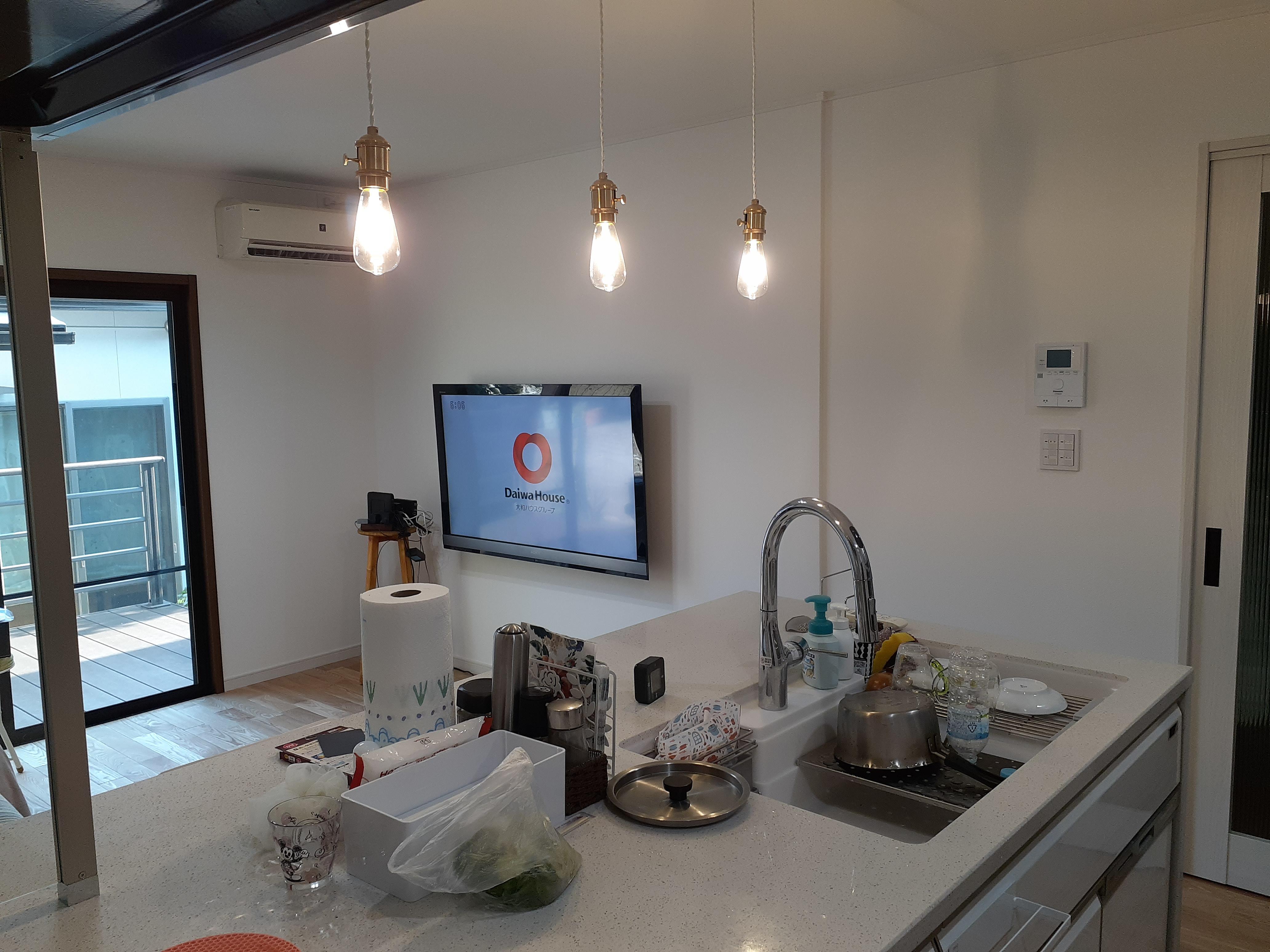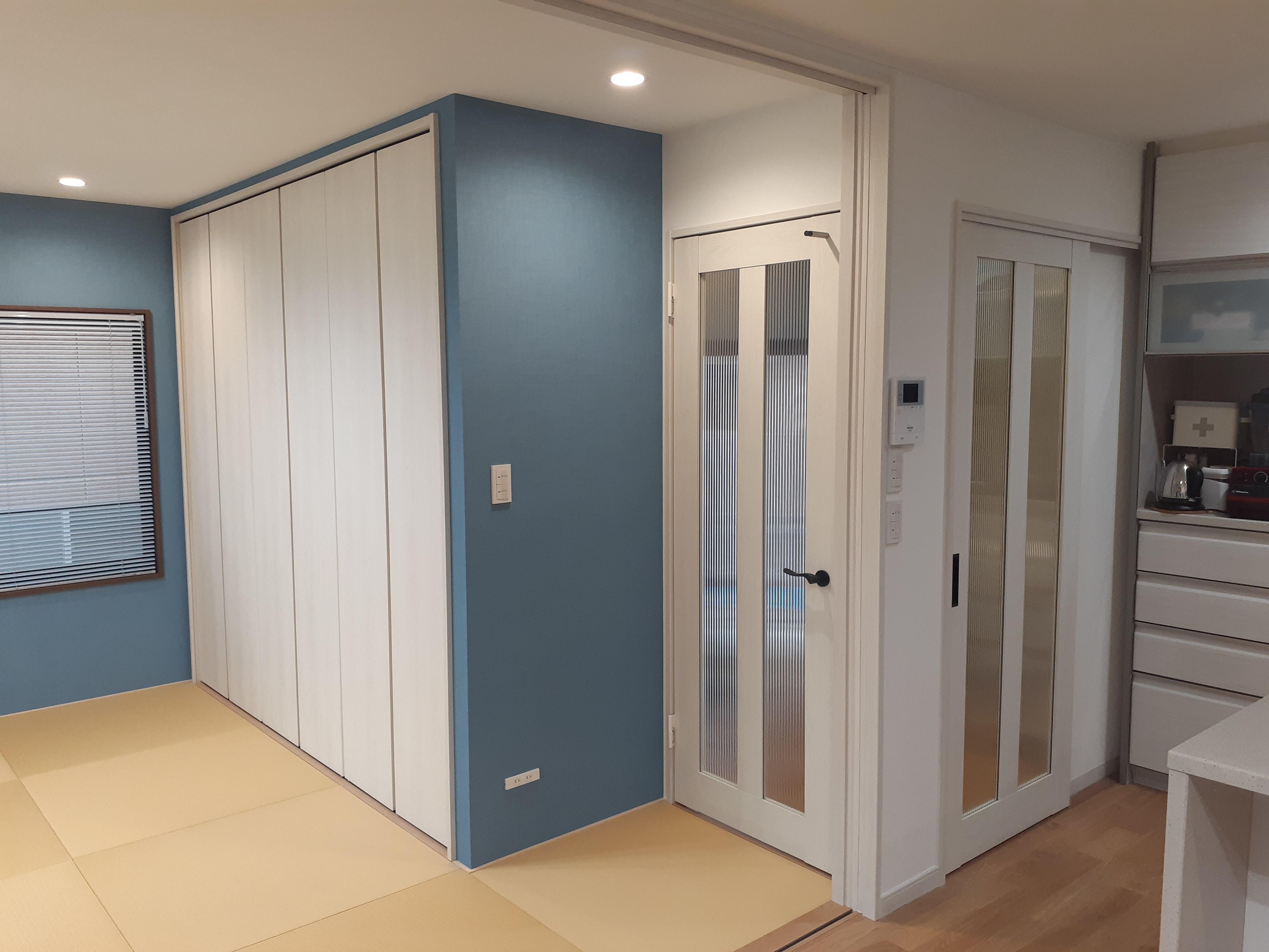 センスのいい奥様。 なるべく、要望に沿うよう、工事をさせて頂きました ブルーの壁紙が アクセントになって とても素敵です。