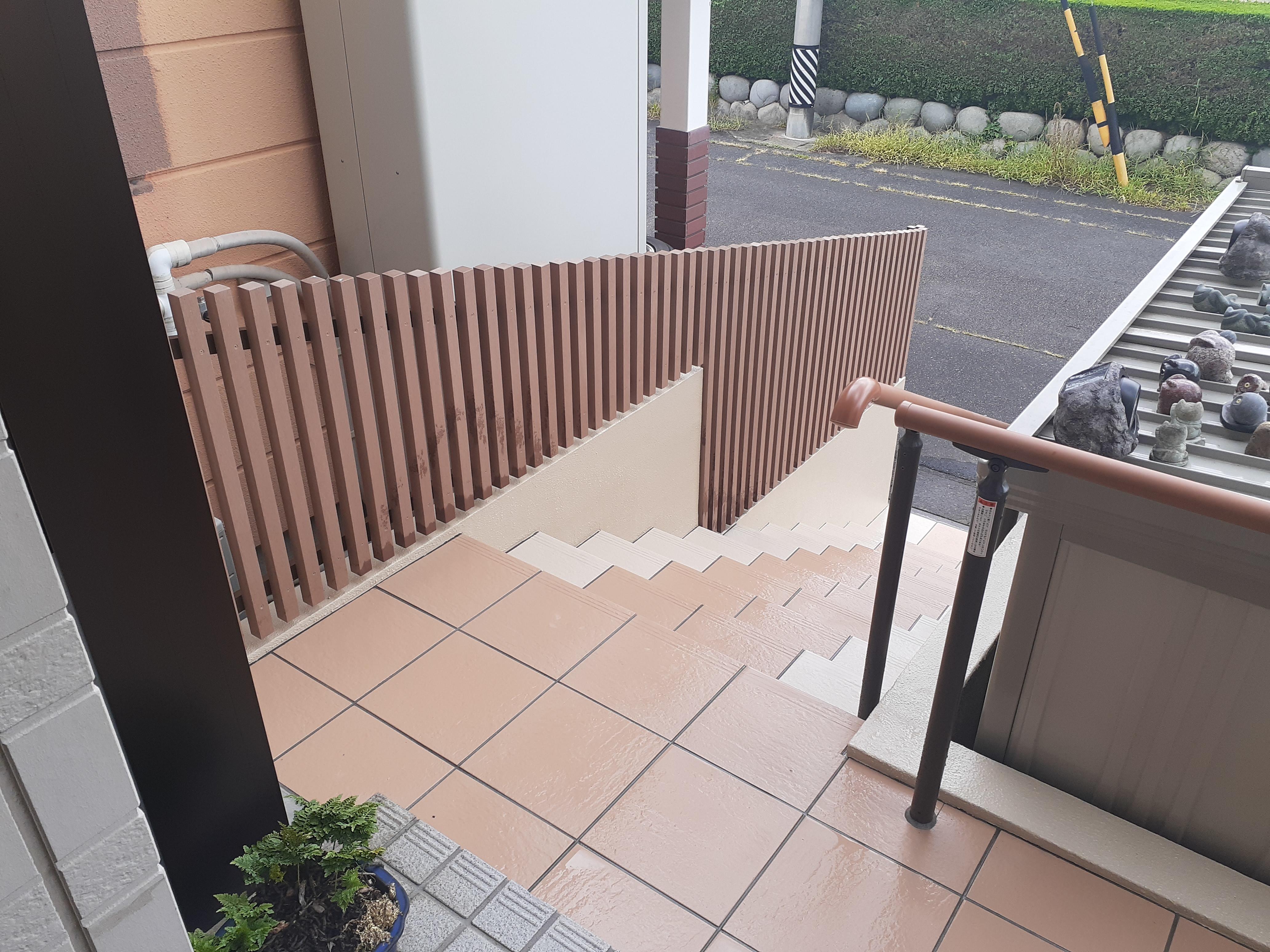 古いアルミのフェンスも 人口木材の格子に取替え。 手すりも付けて 安全に上り下りできます。