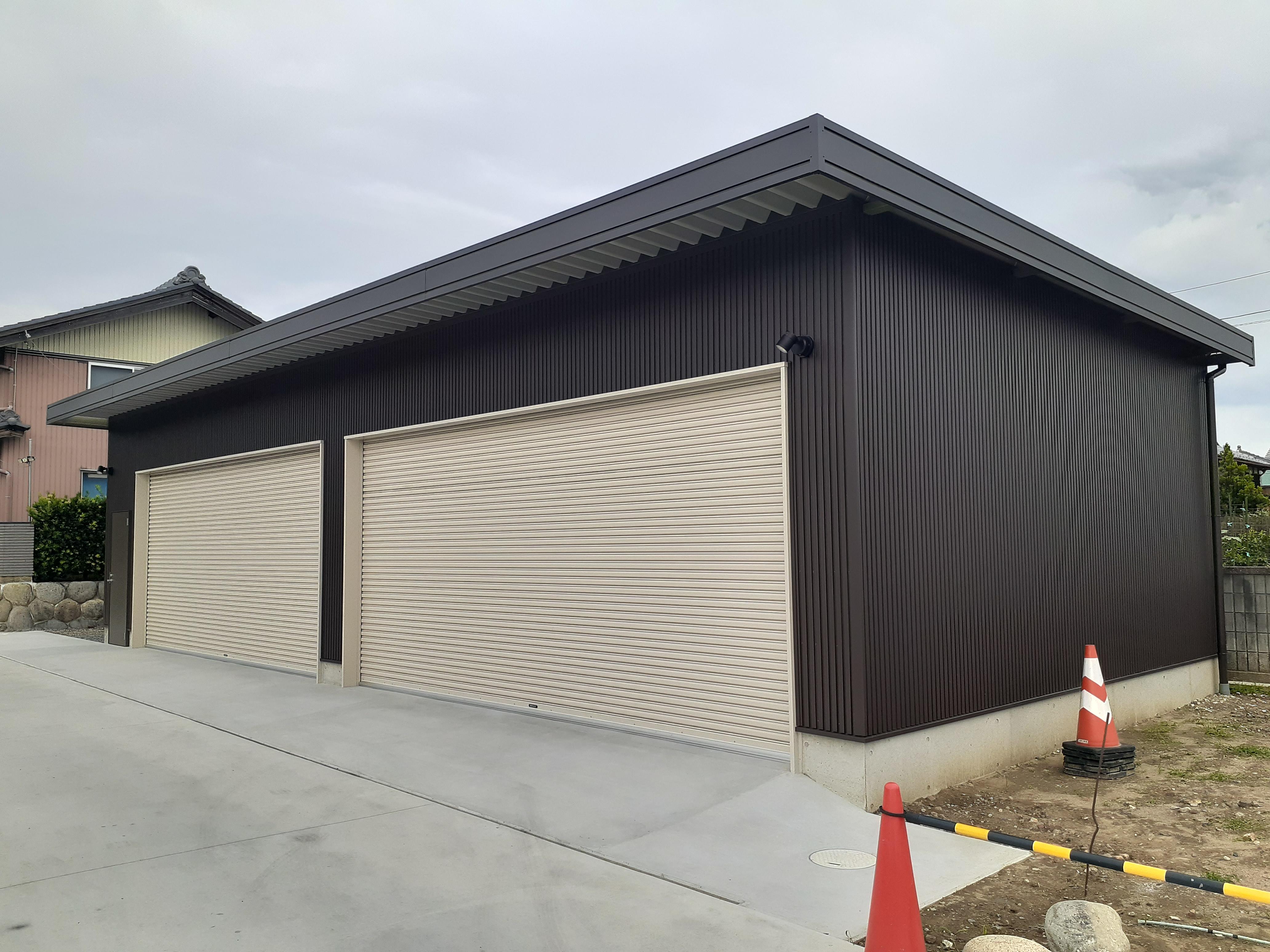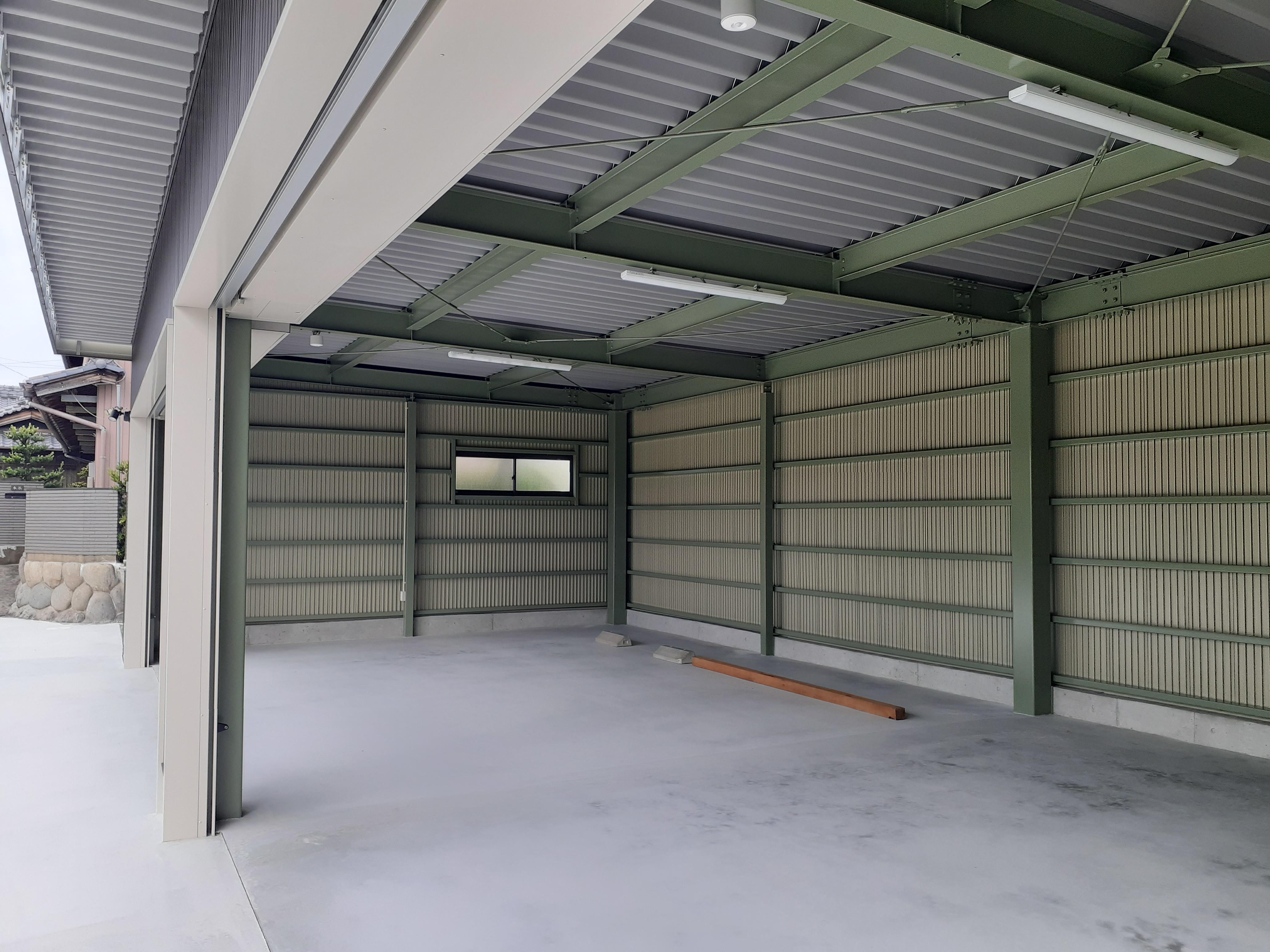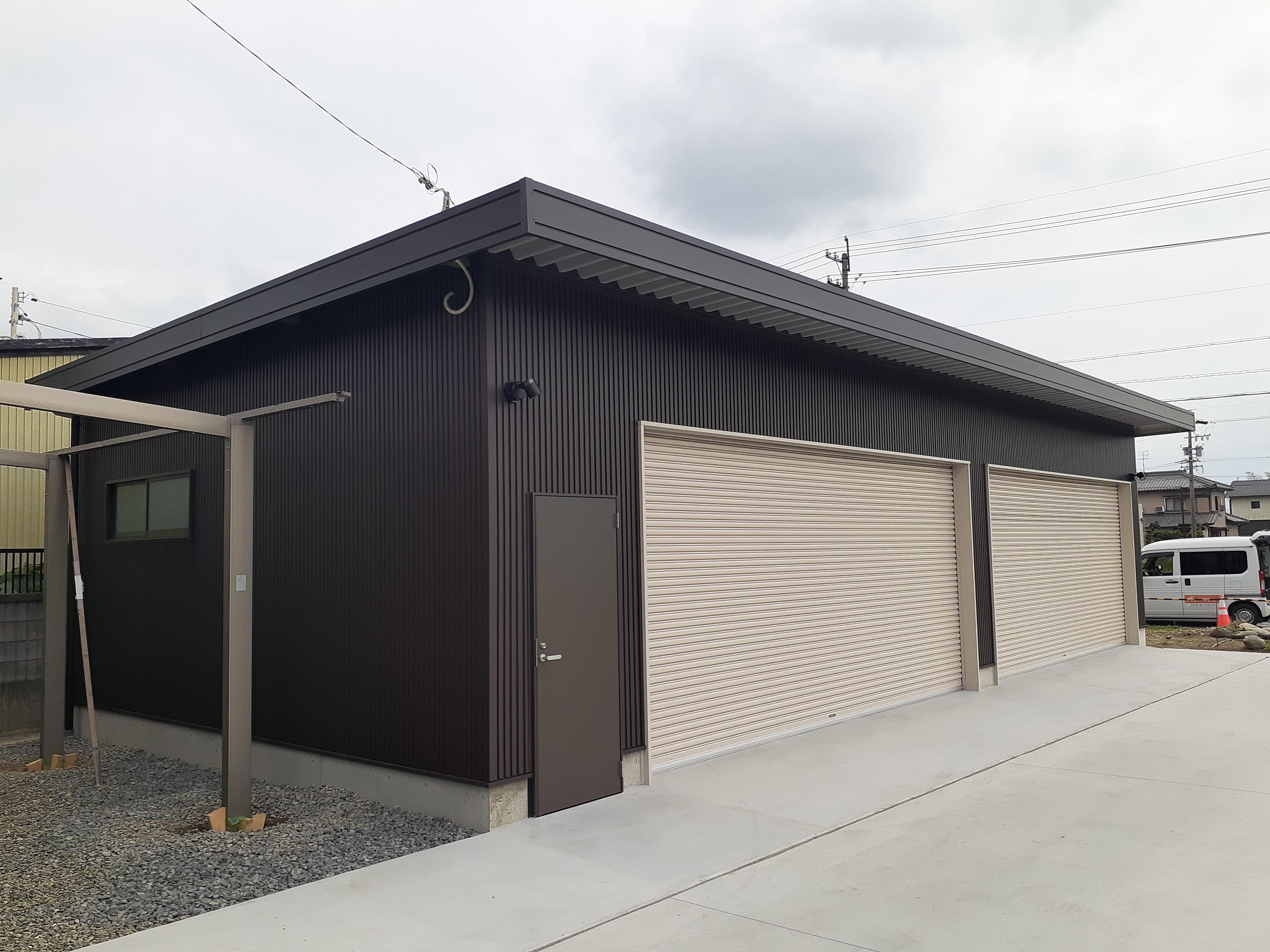 重量鉄骨の倉庫の新築をしました。 シャッターは電動で 無線リモコンで開閉。 中に入れば センサーで自動に照明がつきます。 羨ましいです。 外壁、シャッターの色は、お客様に選んで頂き、いい感じになりました。