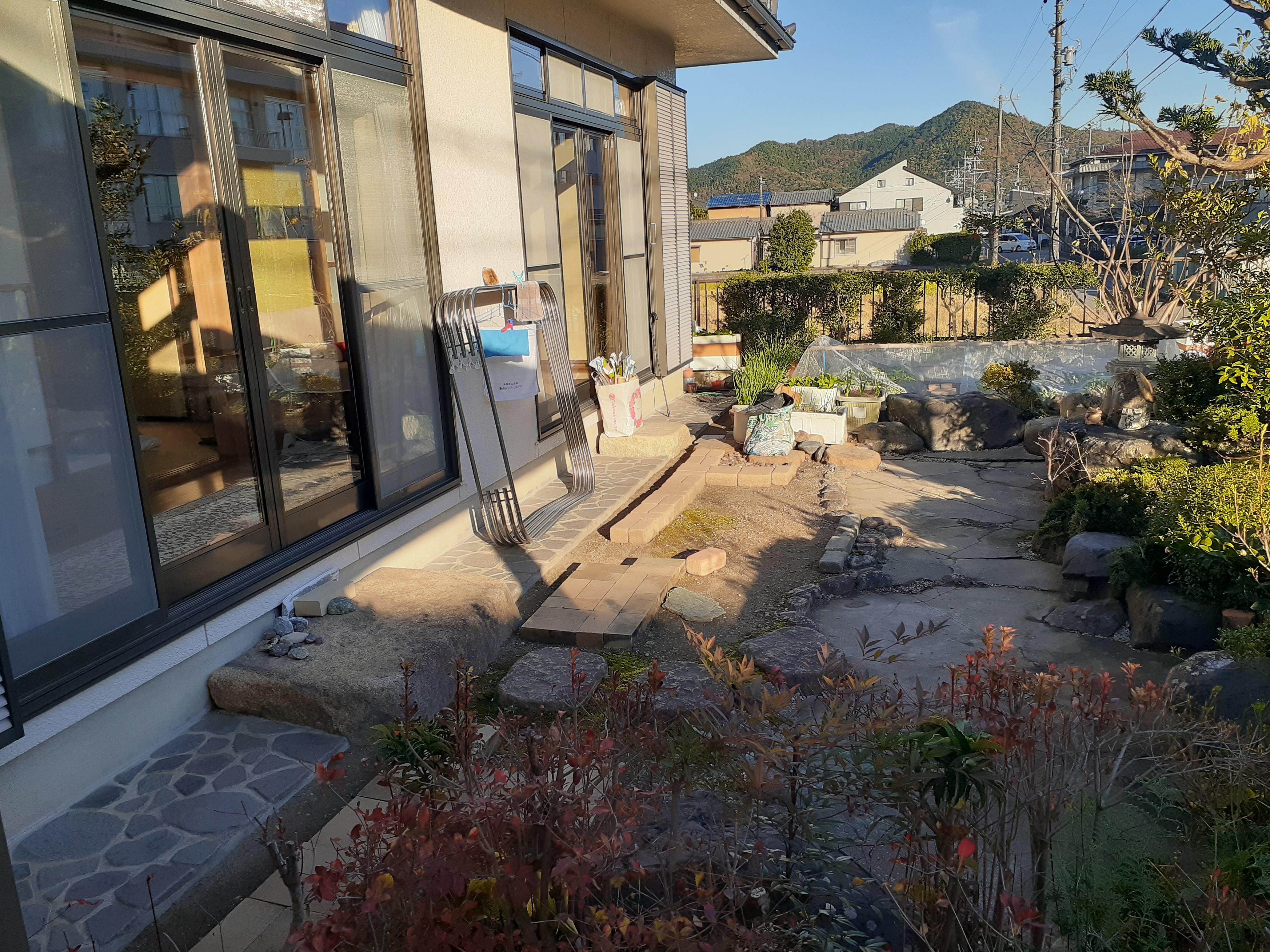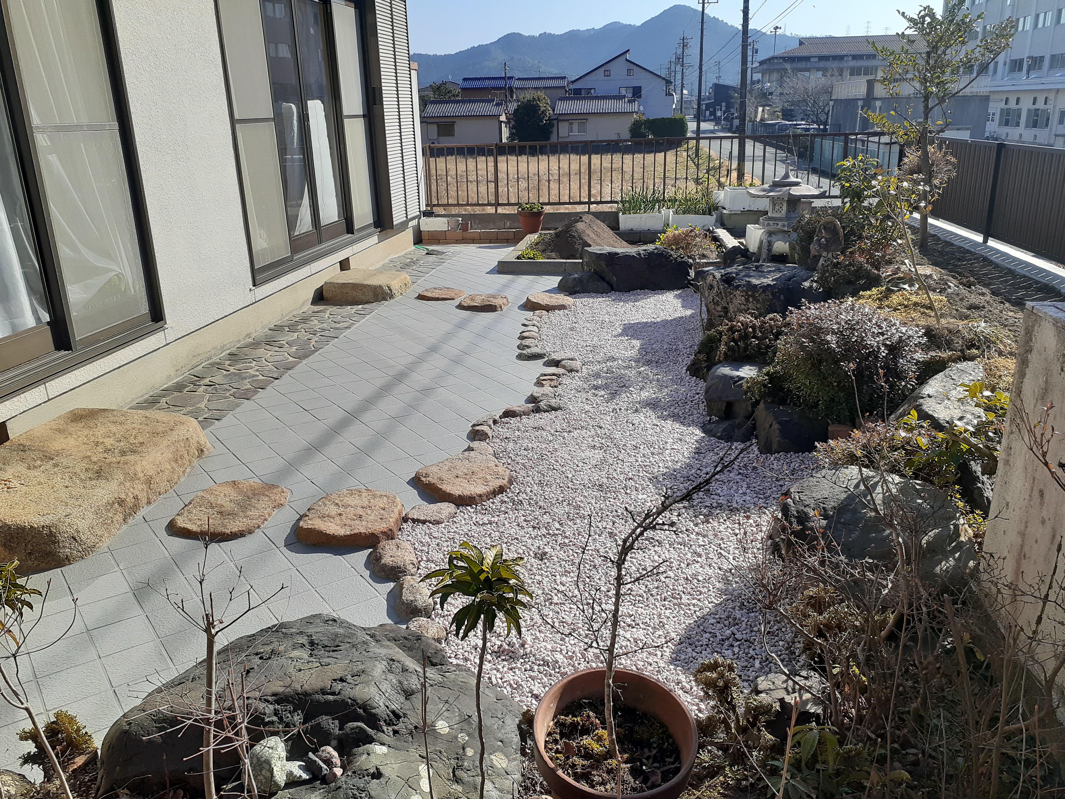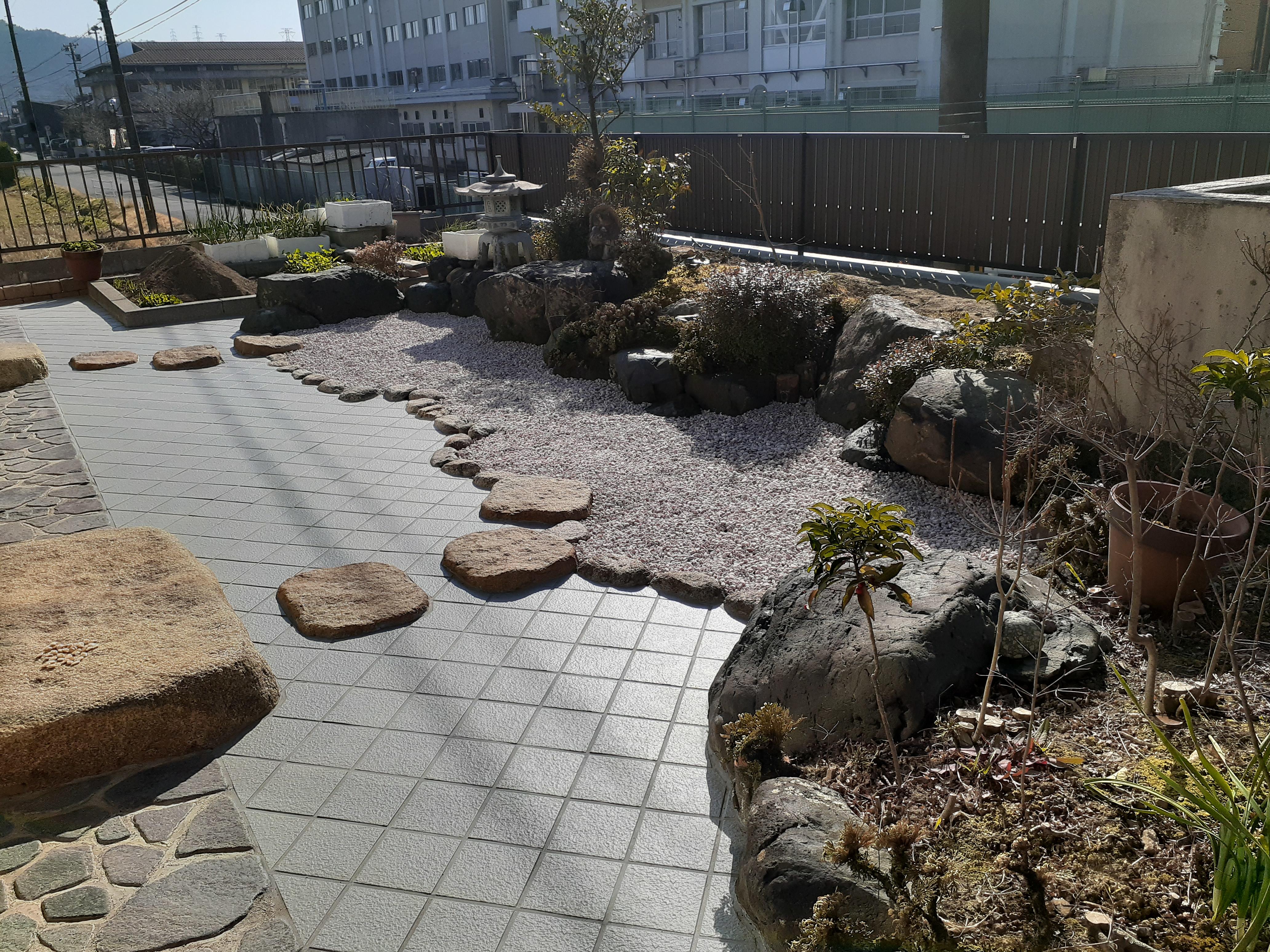 何度か 工事をさせて頂いているお客様。 庭の土の部分に 毎年草が生えて、草取りが大変なので 草が生えない庭にしたいと ご相談がありました。 池には バブルピンク化粧砂利を敷き、廻りには タイルを貼りましたが 枯山水の庭に 違和感なく、仕上がり、喜んで頂きました。 ありがとう、ございました。