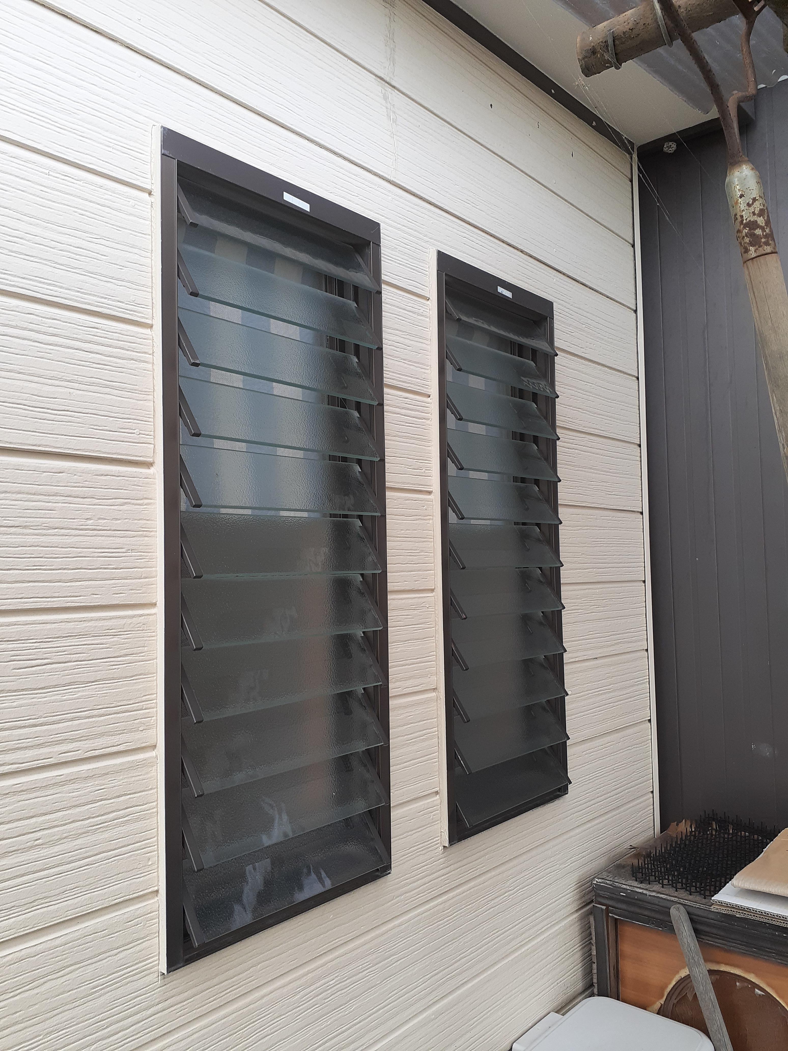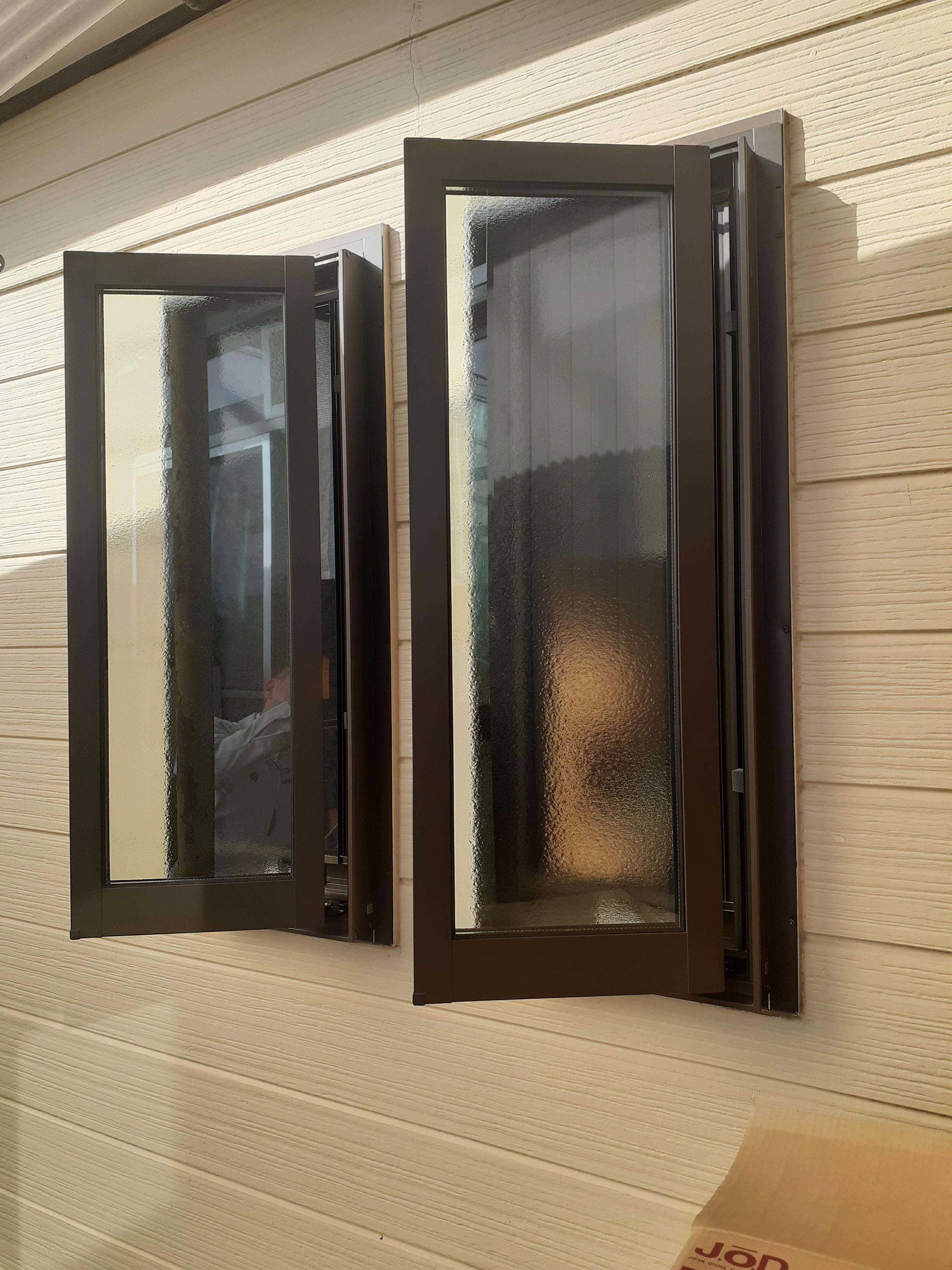 ハウスメーカーの古い感じの玄関ドアを リクシルのリシェントにて交換。ドアは断熱仕様で高さも高くなり、立派な玄関となりました。玄関に付いていた ルーバーガラスの窓から 冬冷たい風が入って来るので滑り出し窓に交換、もちろんペアガラス。玄関の断熱は完璧です。今年の冬は寒さが 和らぎます。