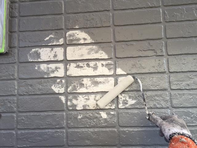 外壁の色柄については、既存の外壁で2~3種類の色がついてたりするものも多いです。また、タイル調のサイディングなどは、塗替えの際に目地も含めて1色で塗ってしまうと、タイル目地部分が無くなってしまったように見えてしまうので、せっかくの外壁イメージが壊れてしまうということにもなりかねません。 今回はレンガ調のサイディングでしたので、一工程余分にかかりますが、塗り分けを行い、サイディングの凹凸部分や目地部分を塗り分けることにしました。