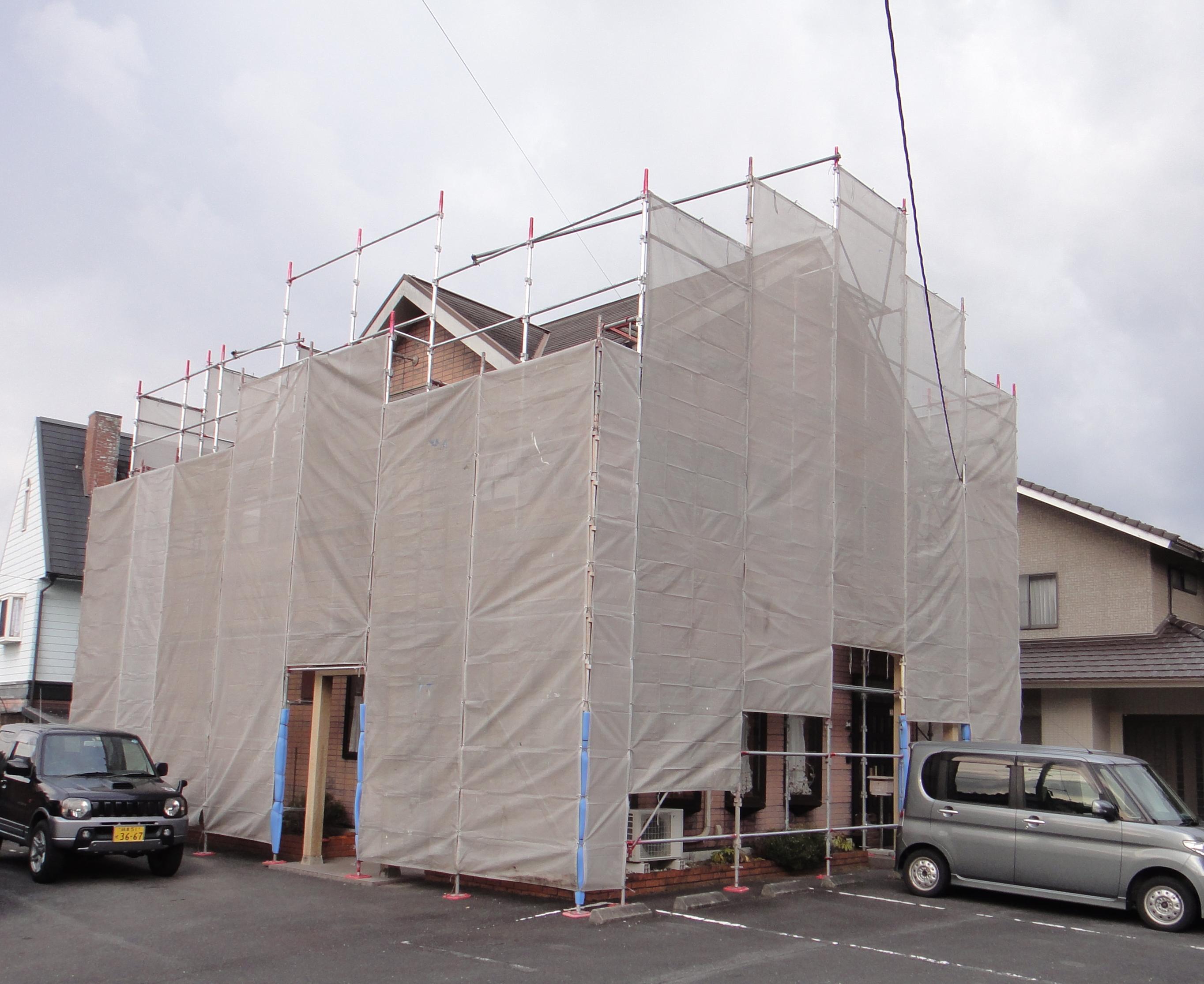 色が決まったら足場を組立てます。高圧洗浄の工程や、塗装工程での飛散物の防止目的や、作業の安全確保目的のために足場は必要となります。
