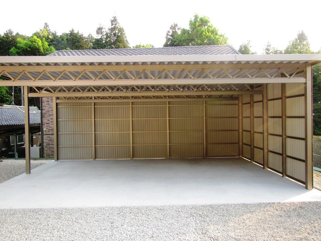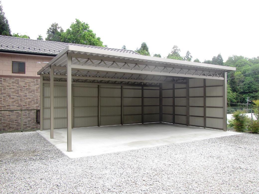 車や季節ものの収納は、屋根があると安心ですね。広い間口で駐車もしやすい車庫の完成です。