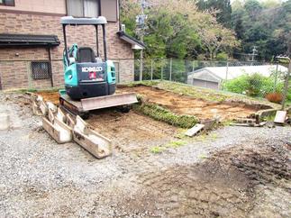進入路の削り取りや、車庫の土間を削り取るために、小型の重機を使います。