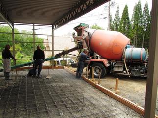 車庫を組み立ててから、土間のコンクリートを流し込みます。生コン車は大きな車が多いのですけれど、小型指定をお願いして、土間の近くまで寄せてもらい、あとは人力で頑張ります。