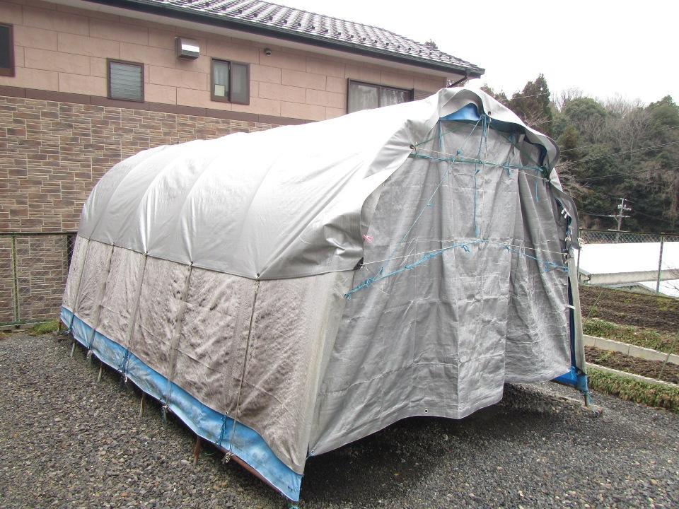 既設の車庫はパイプフレームとシートで作られたものでした。庭は広くスペースはあるので、大きな車庫を望まれていたのと、手入れが間に合わない畑も縮小しての計画。