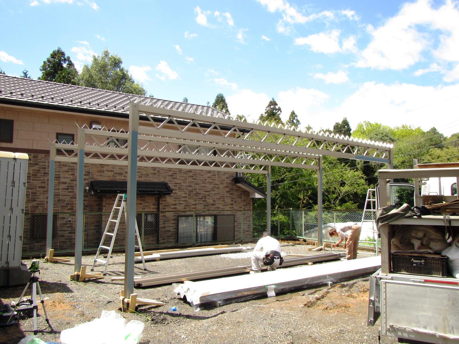 今回はアルミフレームの車庫を選定しました。フレームを組み立てて屋根を葺いていきます。