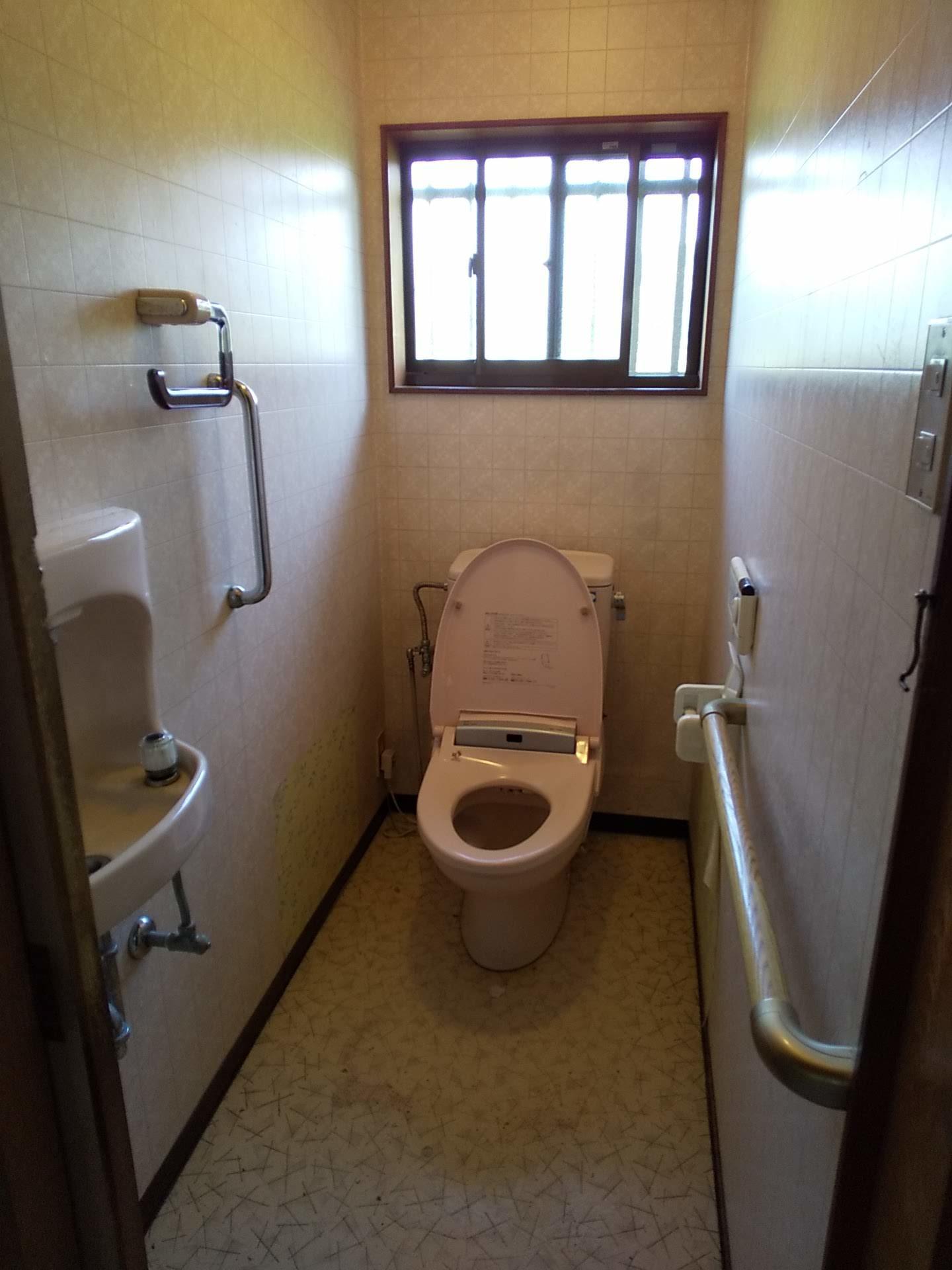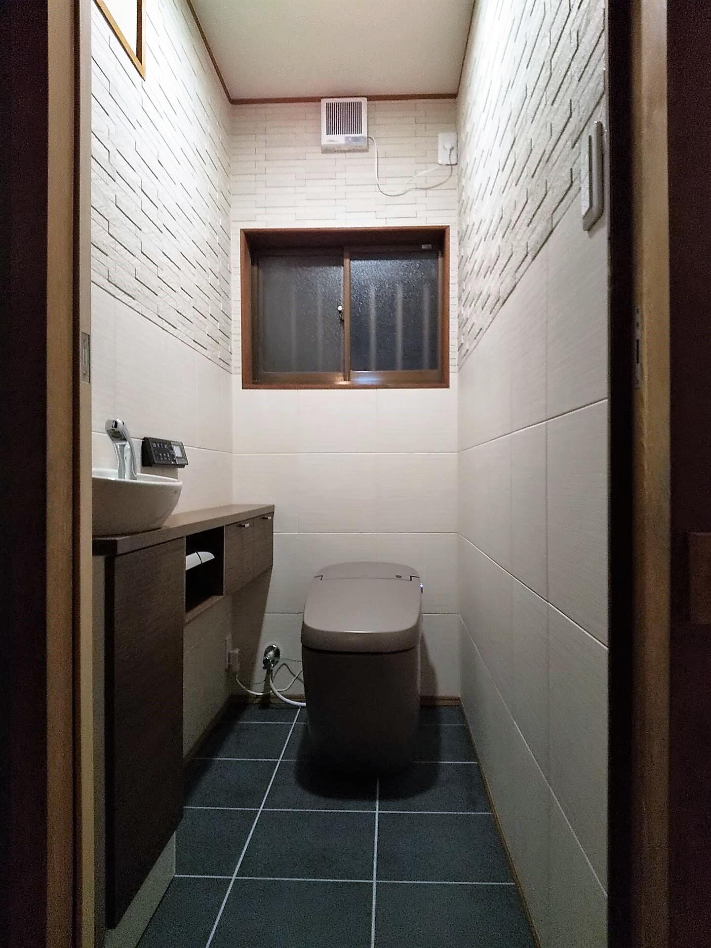 壁全面→エコカラットプラス貼り・トイレ→サティスG(色:ノーブルトープ)・手洗い→キャパシア・床→レストールキラミック(タイル) お施主様こだわりの高級感あるトイレ空間に仕上がりました。エコカラットプラスは調湿・消臭・有害物質の吸着低減・お手入れ簡単という特徴のあるタイルでトイレにはとってもよいタイルになります。施工も簡単。便器も高級感のあるブラウン色のトイレ。もちろん節水・お手入れ簡単です。