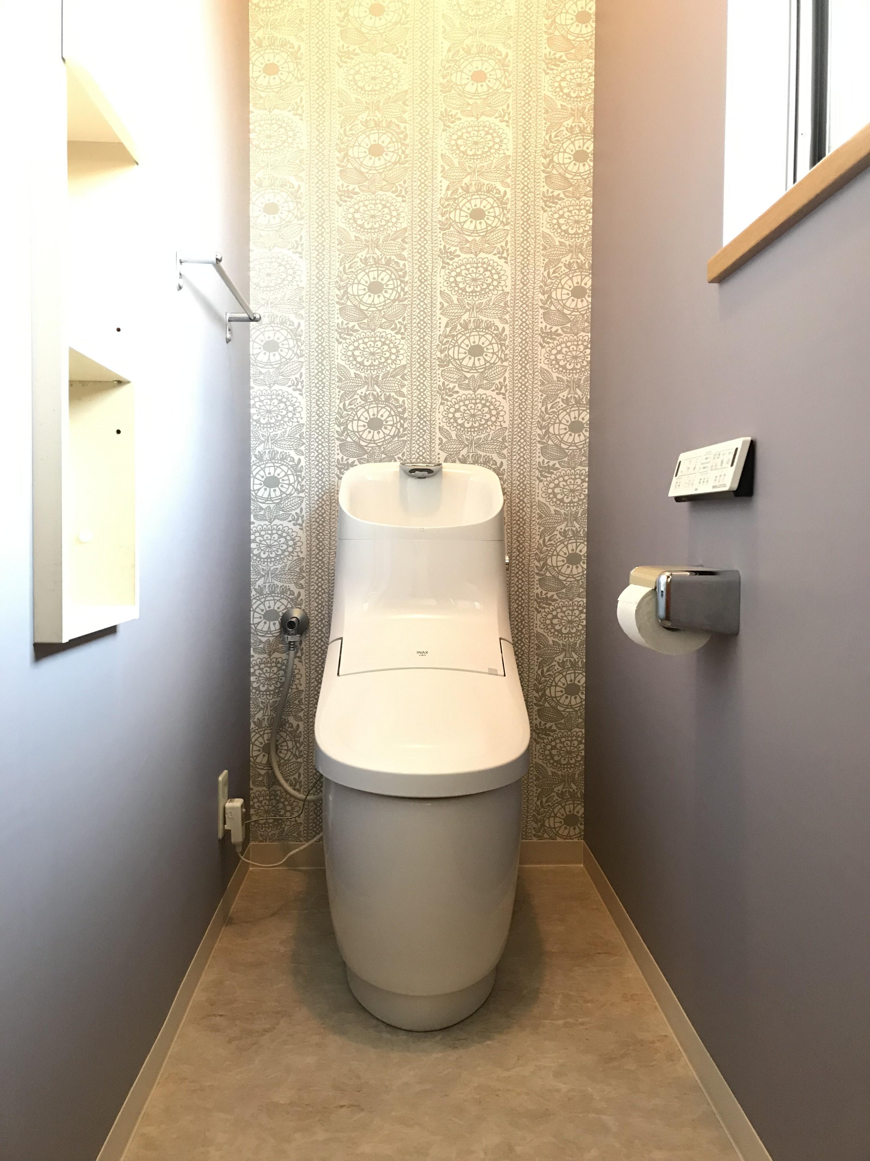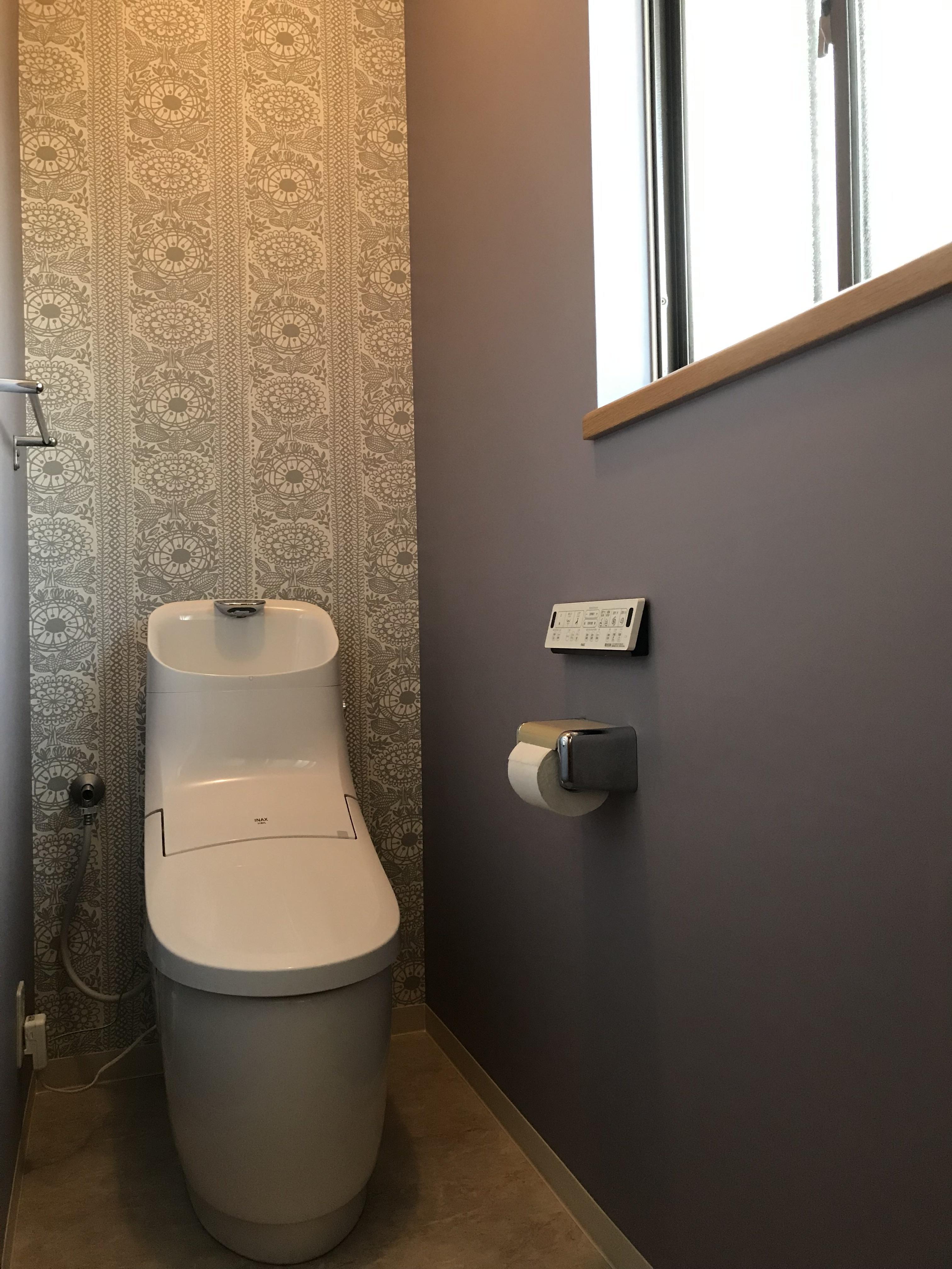 トイレ交換&クロス・クッションフロア貼替です。 トイレ正面の壁をクロスをアクセント貼りとし内装をガラッとかえました。 一日で終わる工事で負担も少なく、毎日使うトイレが綺麗になり嬉しいですね。