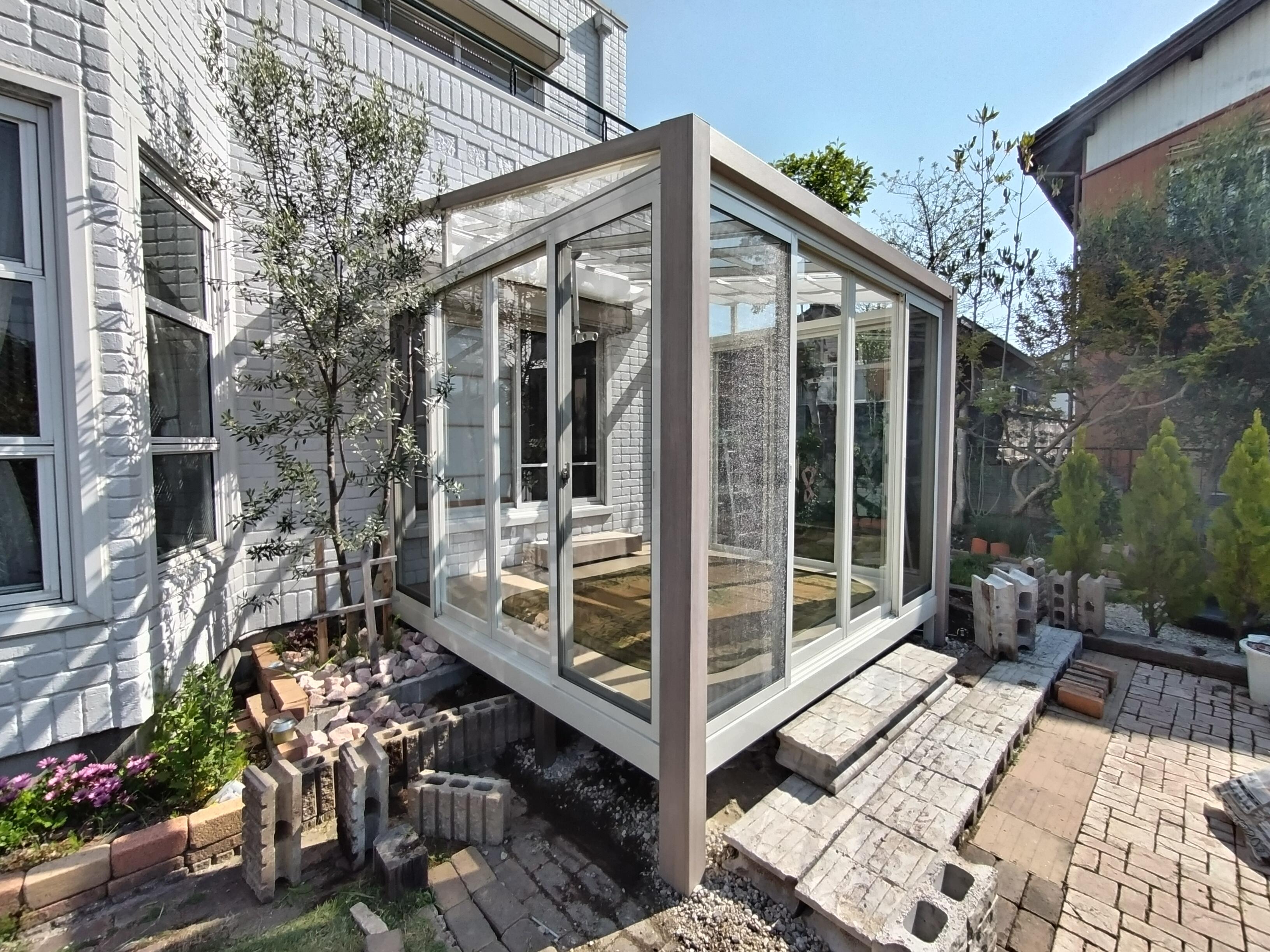 サイズ大きめ、内部日除け付き、床人工木のデッキ材、どの方向からでもお庭へ出入りできる等こだわりました。外観やお庭に合った色を選ばれ違和感なく素敵に完成です♪