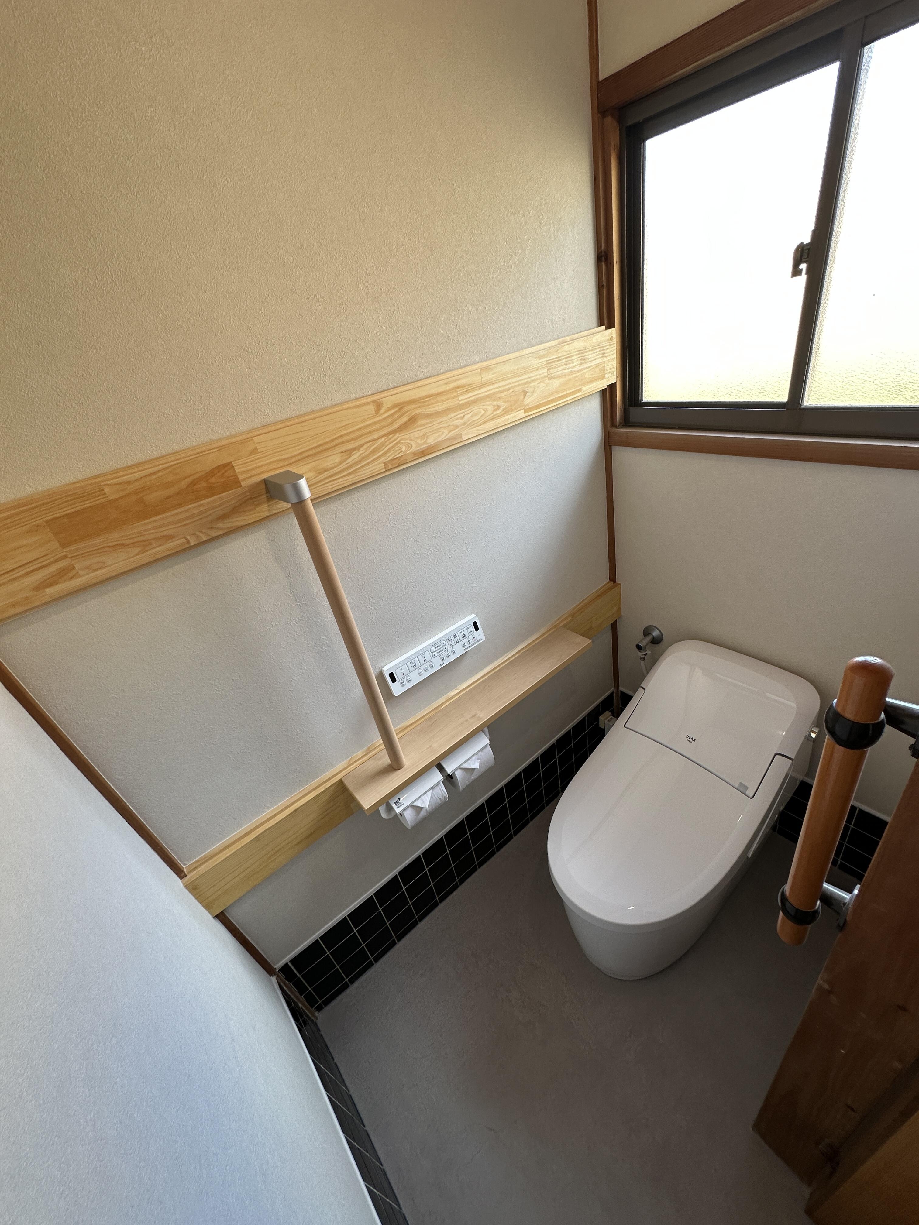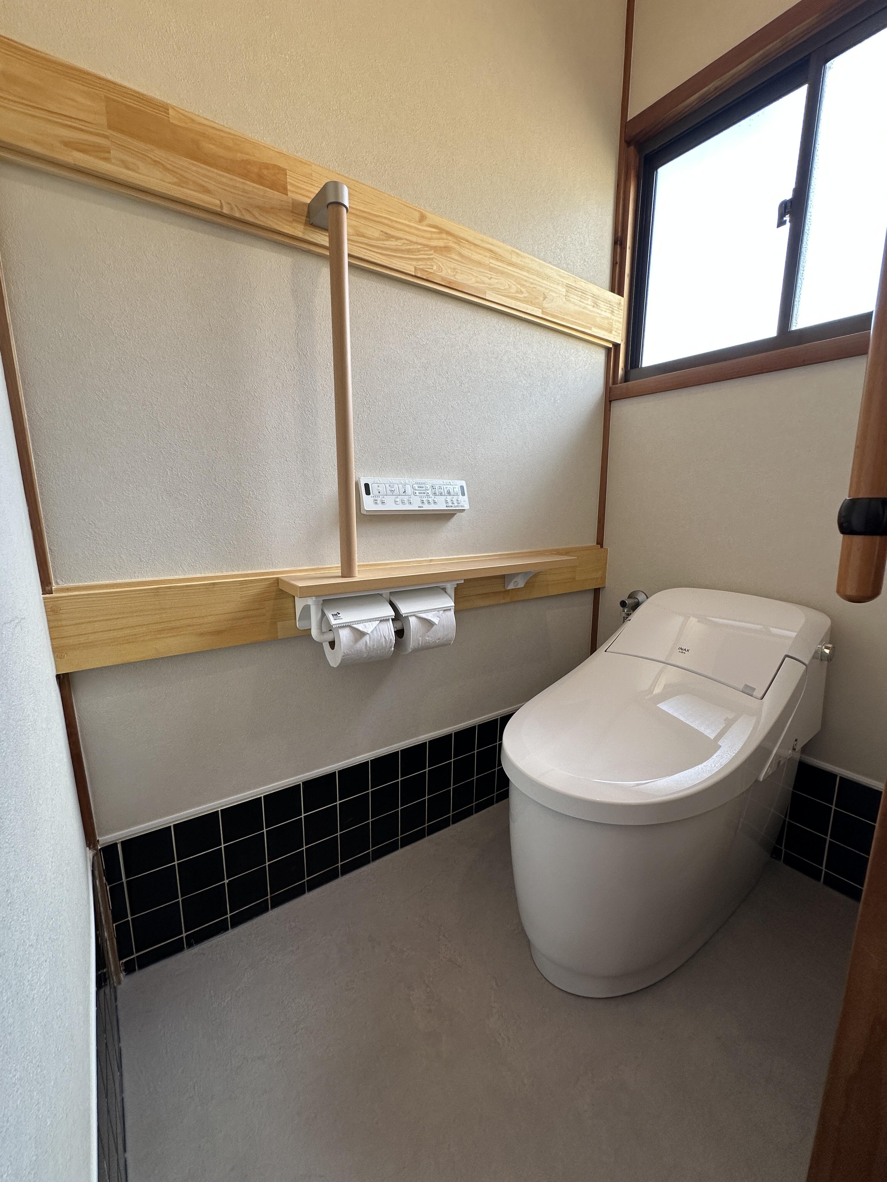 トイレ内の壁を真壁のまま施工し室内が狭くならないようにしました。また老後のためにも手すりを設け安心安全なトイレへ。手洗いも交換し使い勝手もよくなりました。
