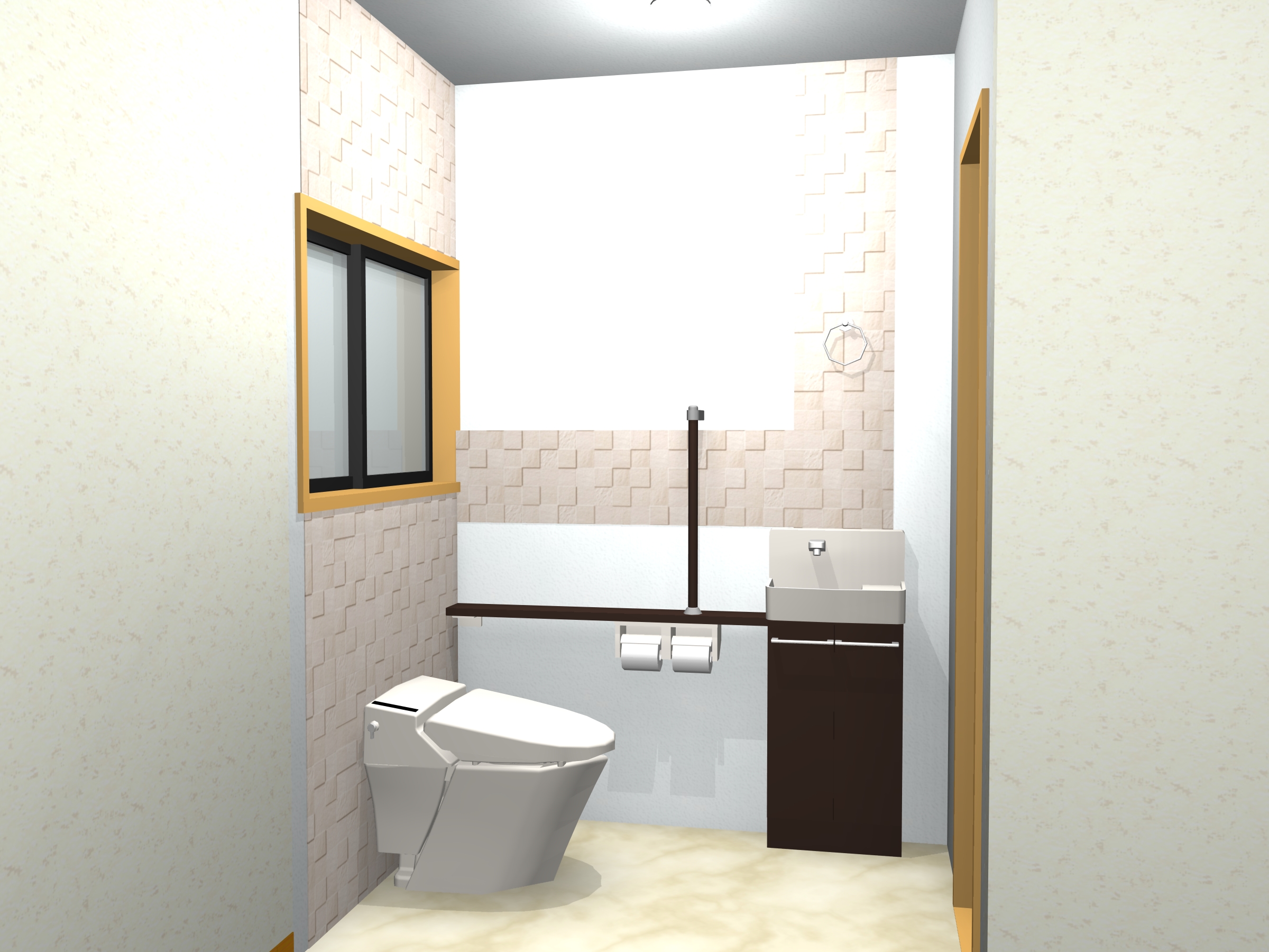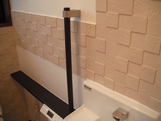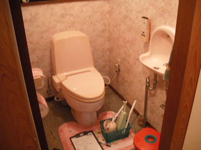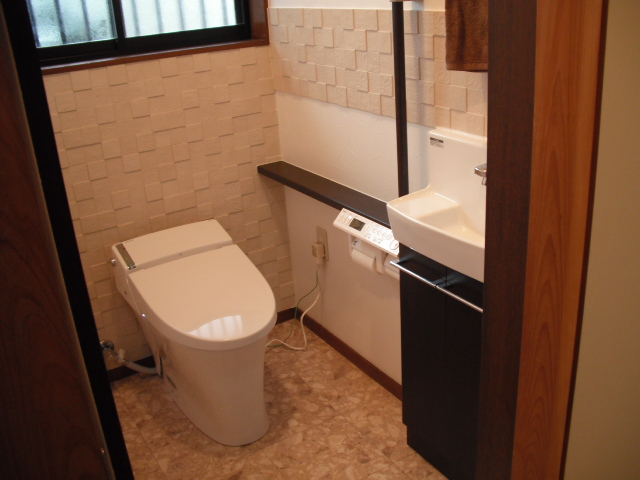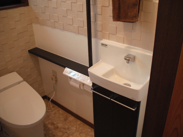 今までご使用になっていたタンク付の洋便器から、タンクレスの洋便器に取替え、手洗い器も新しいものに取替えました。掃除道具やトイレットペーパーなどを収納できるオシャレな手洗い器ですっきり収納。