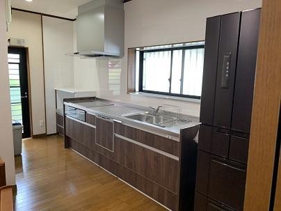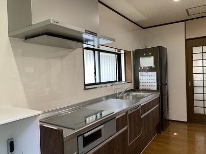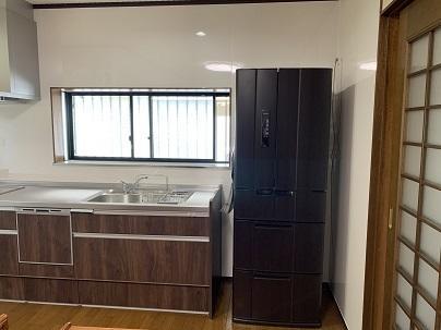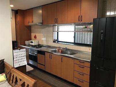 今回、キッチンの長さが150㎜短くなり、吊戸棚も無くしましたが、元々使わない物置き状態になっていました。オーブンの有った所を引き出し収納に変更したのと、2人住まいのためOKとの事。壁のタイルは、捲りキッチンパネルに張り替えた事で、お掃除楽々、吊戸棚も無くなりスッキリ広々明るく仕上がりました。