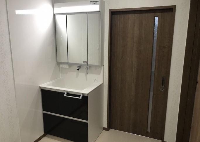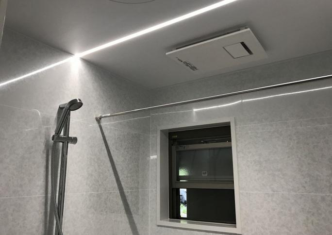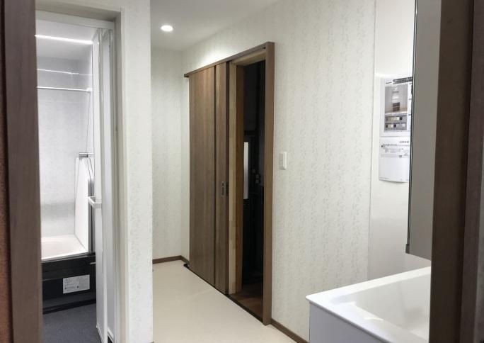 キッチン、浴室、洗面を新しくするとともに、間取りも変更しました。もともと納戸だったところに、浴室洗面室を作りました。また、キッチンとダイニングの段差をなくし、玄関ホールとキッチンの床を新しく張り替えました。一番のこだわりである浴室は、パナソニック最上位シリーズの「L-CLASS」を採用させていただきました。ライン照明でよりスタイリッシュな浴室になりました。