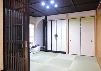 ご主人こだわりの「和空間」。天井は板張りを塗装し、建具は天井までの高さがある特注品。和室から続く庭は一番のこだわりで、日本庭園風に仕上がりました。「ししおどし」を設置して、とても雰囲気のある和空間になりました。