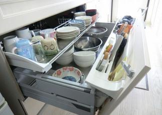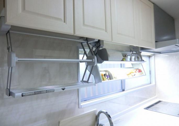 使わないときは隠せる家電収納や、吊戸の下に調味料や、洗った鍋や食器などを置けるスペースを取り付けました。水栓はとっても便利なタッチレス。