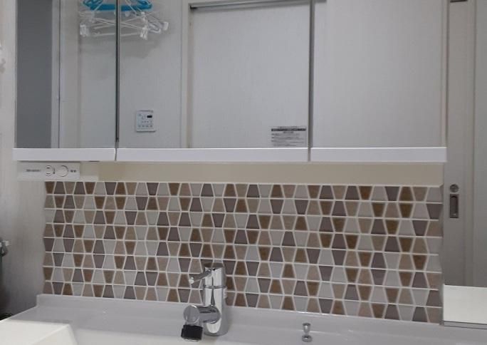 ・洗面化粧台のバックパネル部分にガラスモザイクタイル