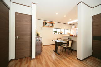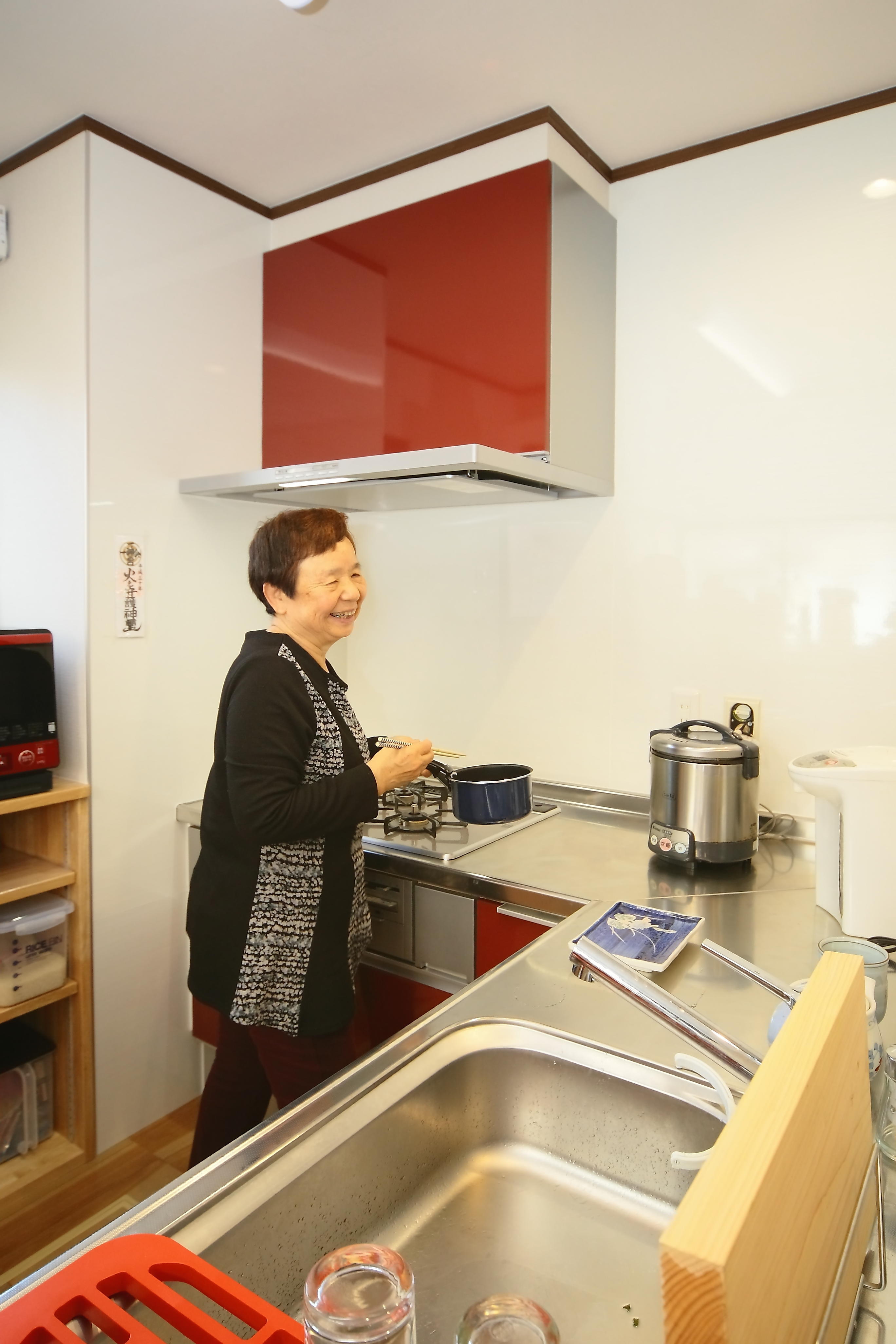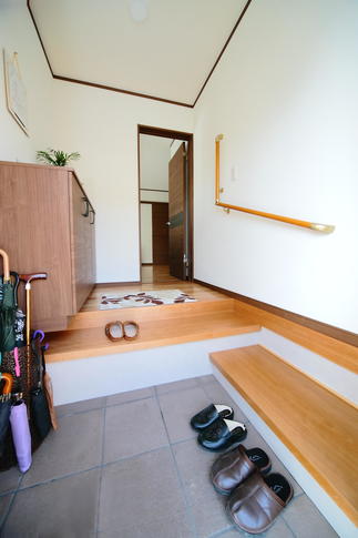 収納スペースが少なかったので棚をいくつかリクエストし、希望通りのものを造ってもらいました。うちのが膝が悪い、という話をしていたら塩澤さんたちが気にしてくれて、玄関の式台を2段にしたり、手摺を付けることを提案してくれ、楽になったと喜んでいます。