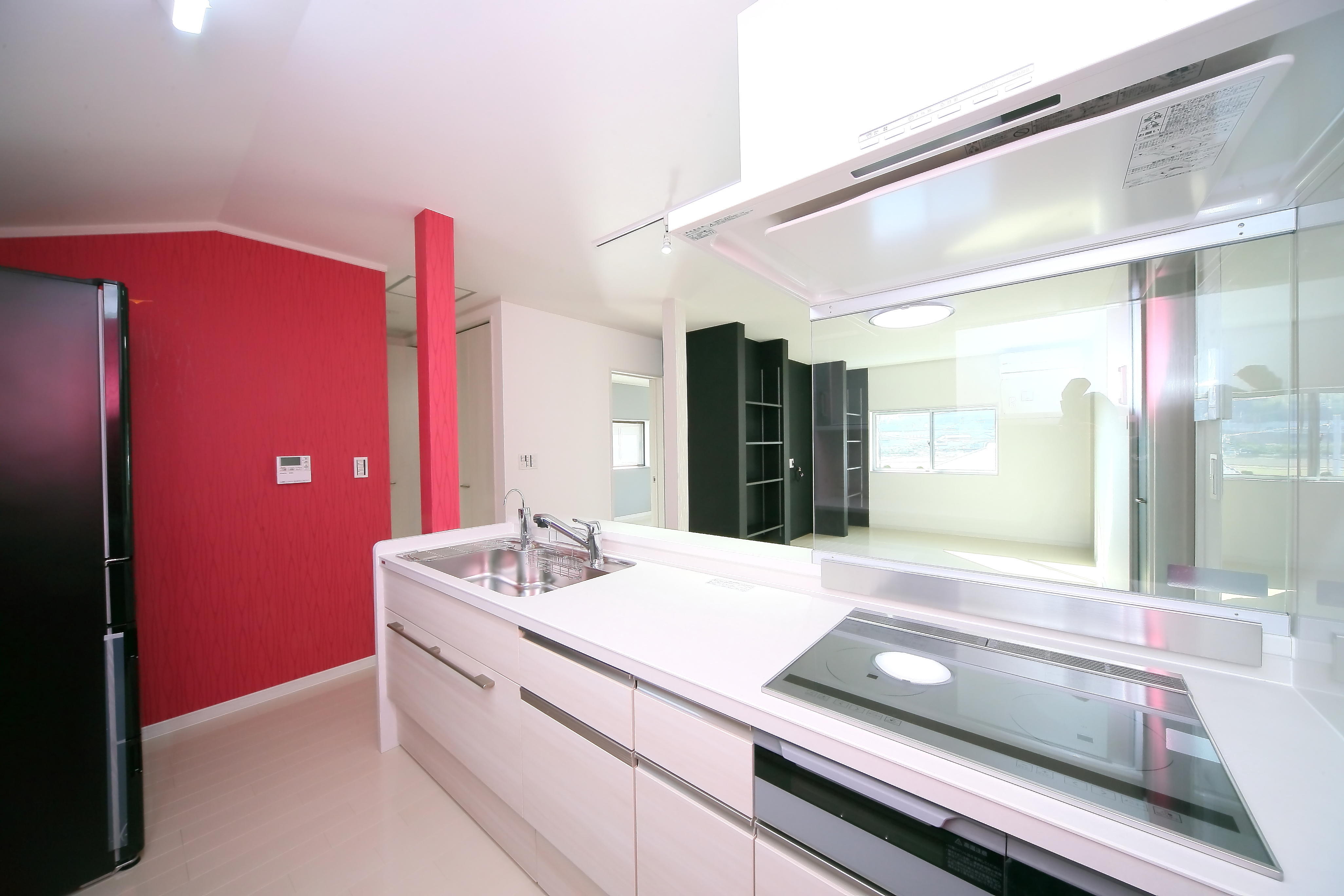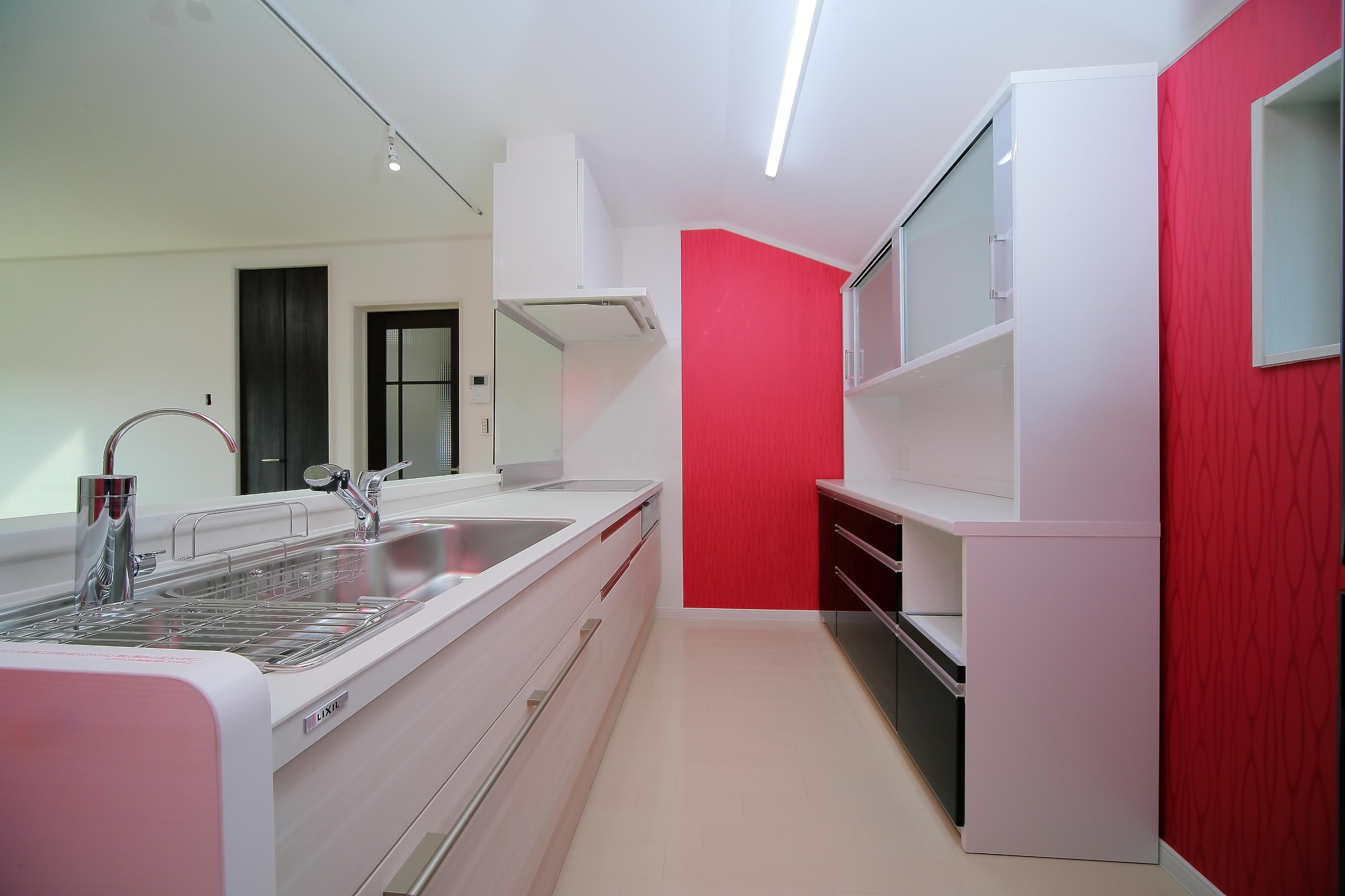 ビビットな赤いアクセント壁と、キッチンを含めてほかは全て白。ここに立つだけで気分アゲアゲなキッチン空間になりました。キッチンは最高級〝リシェル〟セラミックトップ。レンジフードはお手入れカンタンな〝よごれんフード〟に。洗い物に使うハンドシャワー水栓に加えて浄水専用水栓も設置。ガラストップのIHクッキングヒーター。家事とお仕事を両立させる奥様の「お手入れカンタン」をテーマにプランニングしました。奥様が家具店で購入された家電収納家具も、電源を埋め込むなどの細工をして設置しました。