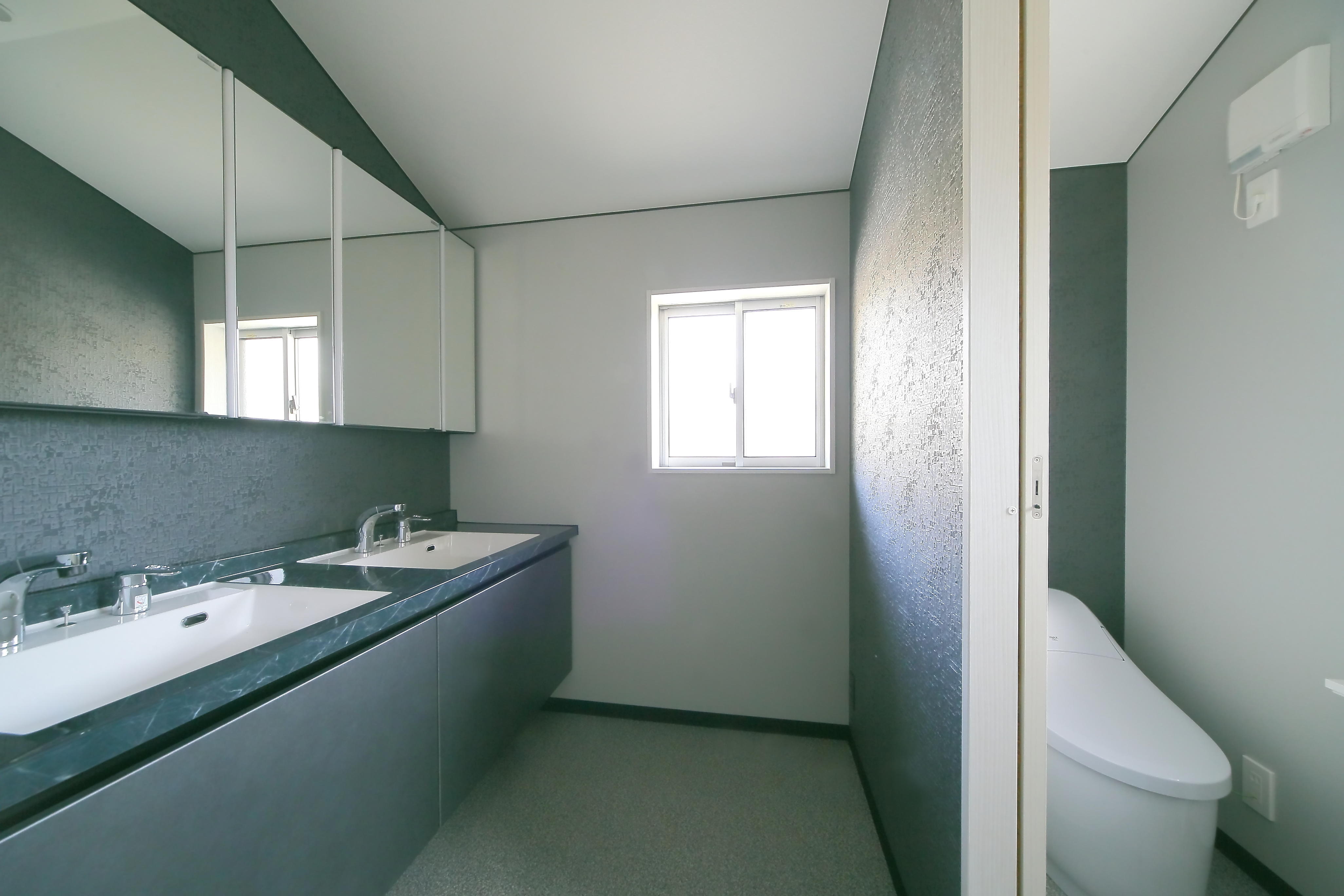 朝は家族全員でドタバタ。なので洗面は2ボウル。ホテルのようなおしゃれな高級洗面カウンター〝ルミシス〟を設置。ミラーのまわりから照らす明かりでのメイクはまるで女優気分です。年頃のお嬢さんも大喜び。ブラックの人造大理石カウンターは、超きれい好きのご主人が毎日お掃除してるとか。WCは2階だけで2つ、1階と合せて計3つあります。それぞれよく使うひとが意匠を決定。ということで3つともそれぞれの個性が現れた素敵な空間になりました。写真のトイレは「トイレにいる時がいちばん落ち着くんだよ」というご主人様の好みでモノトーン。