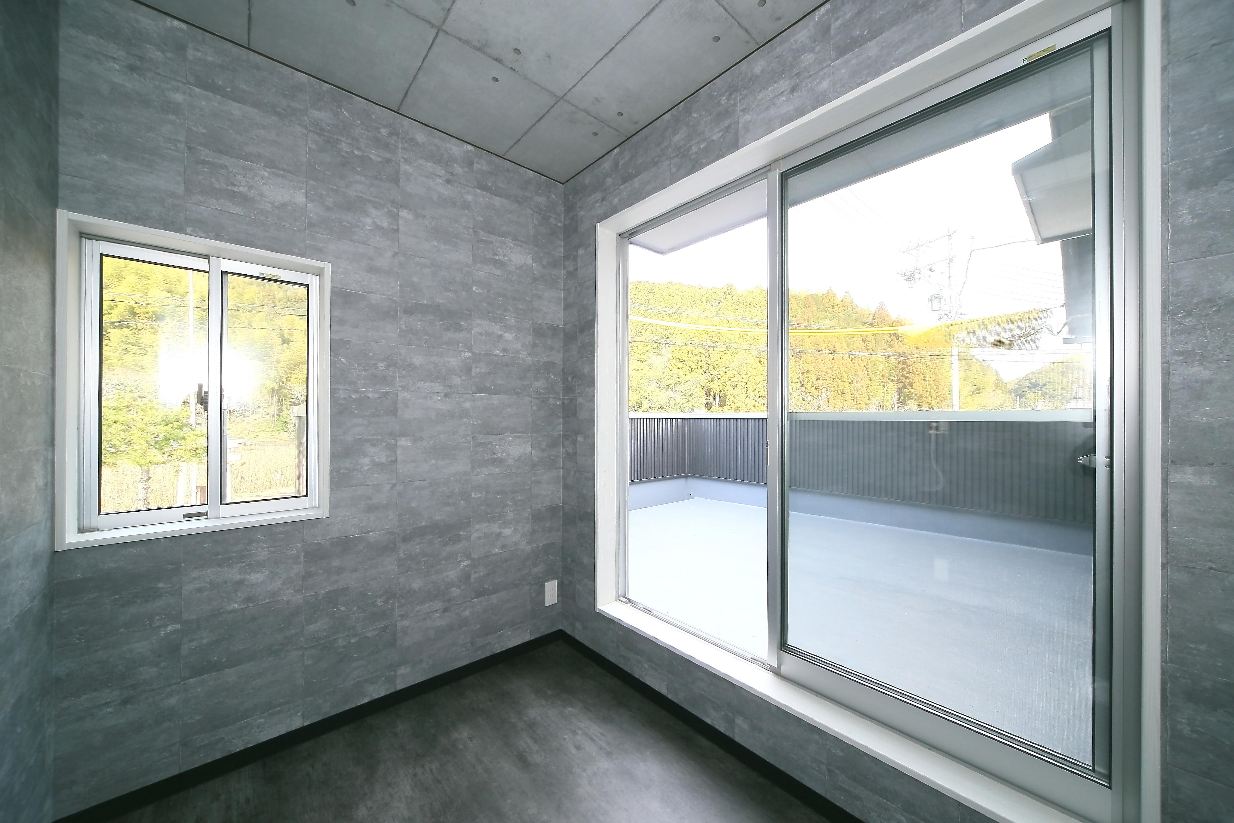 バルコニー越しに緑の借景が気持ちいい空間。ご主人がひとりになりたい時に籠る部屋です。お好みのコンクリート柄で床壁天井すべてを仕上げました。籠るとは言っても光と風は入るし、広~いバルコニーに出てストレッチもできます。窓から見える山の緑が心を癒してくれる、とびきりのリフレッシュ空間です。
