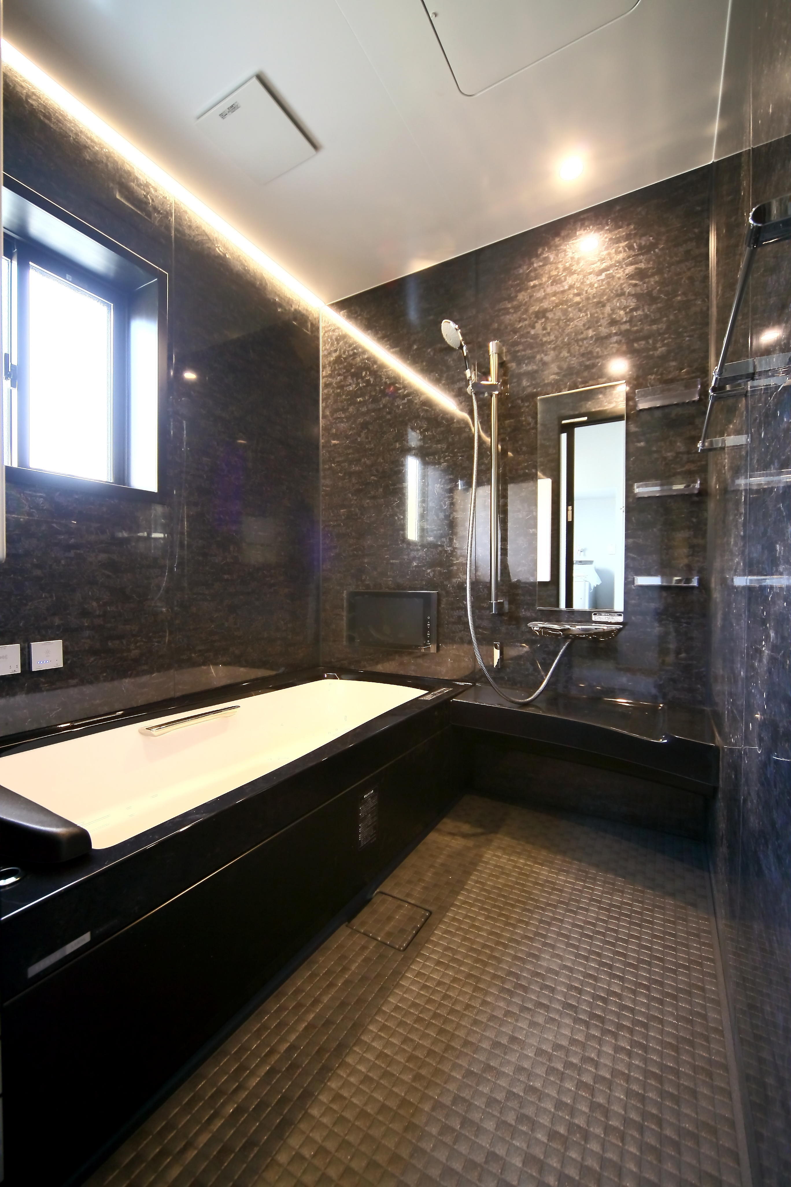 最高級システムバス“スパージュ” ジェットバスに入りながらテレビを見てリラーックス!昼間に入浴されることもあるご主人。 日々の疲れを癒やす浴室にはこだわりました。高級感あるブラックとパールホワイトの人造大理石浴槽に黒い石積みの壁。「この色合いが落ち着くんだよ」と。ご自分で選んだお風呂、やはりご主人様が毎日みがいているとの事。「いまのとこ水垢ひとつなくピカピカに保っているよ」ということです。