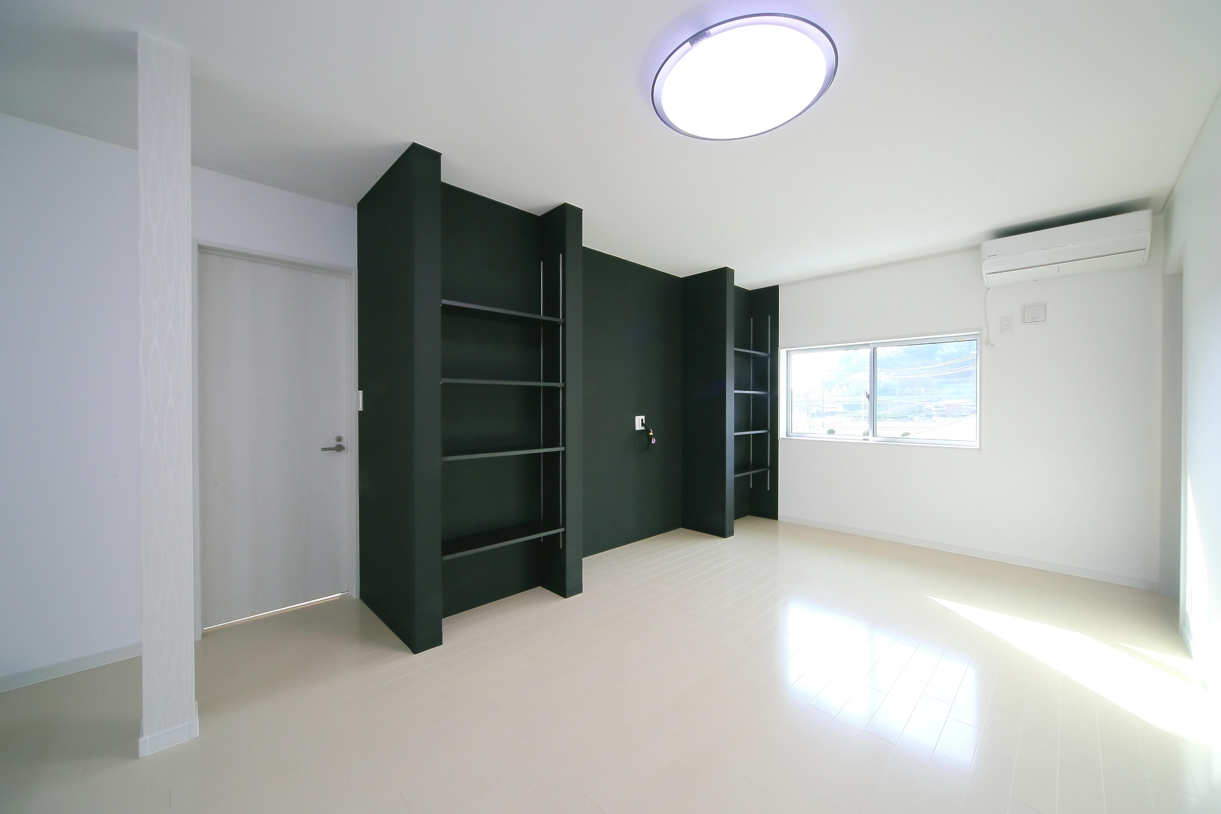 ダイニングキッチンとつながるリビングスペース。壁掛けの大画面テレビを中心にオーディオ機器、インテリア小物などをおしゃれにレイアウトできるよう、真っ白な空間に艶消しブラックの棚を造り付けました。アンテナ線や電源、インターネット配線など、詳細に位置を検討したうえで取付け。生活スタイルの変化にも対応できるよう各部は可動式にしました。訪問するたびに景色が変わっていたりして。見に伺うのが楽しみです。