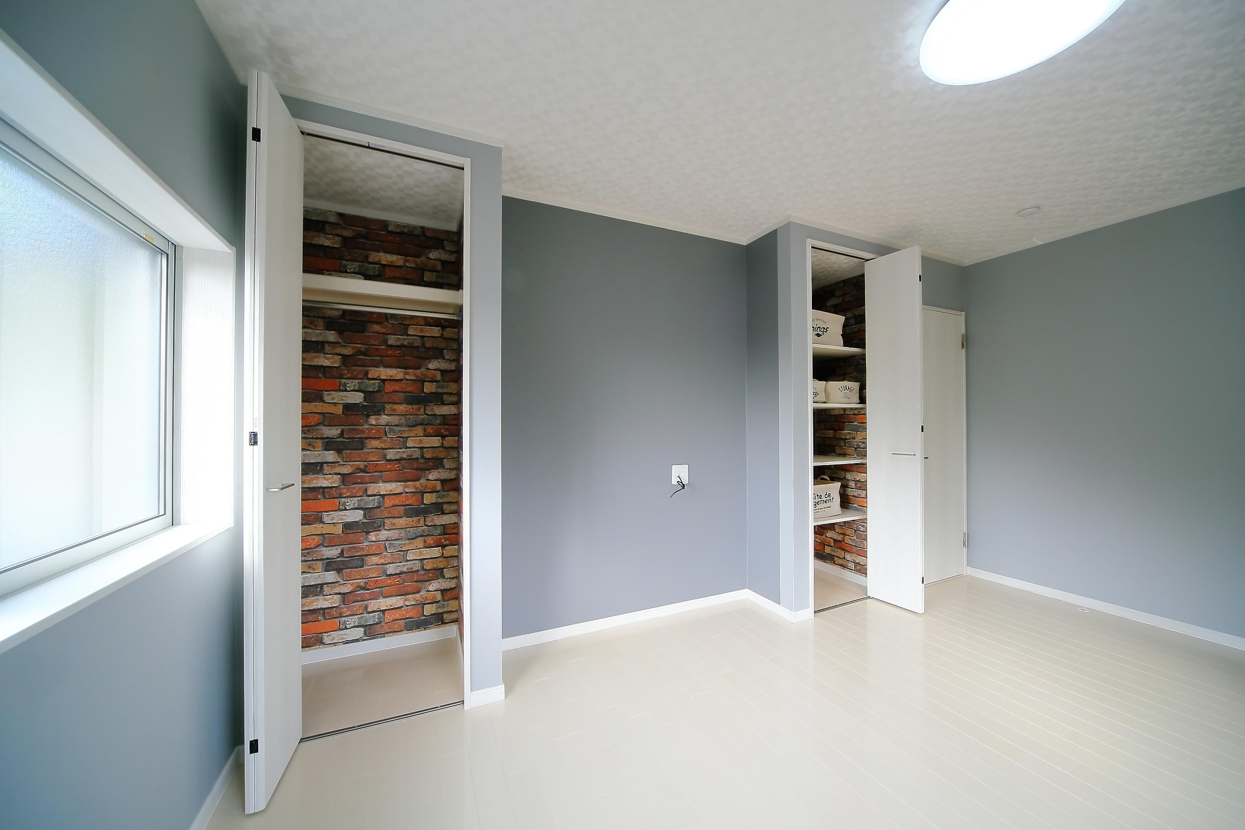 やわらかい色使いの部屋だが、クローゼットを開けると、ほら、楽しい!お年頃のお嬢様の部屋。 壁・天井のクロスと床や建具の白が、さすがの若いセンスです。クローゼットの中だけがカラフルなレンガ積みの柄になっています。「開けるたびになんかうれしい」んだとか。収納を別にして7.5帖のお部屋を有効に使いたいので、収納に挟まれた真ん中の部分を窪ませてTVなどを置けるスペースに。