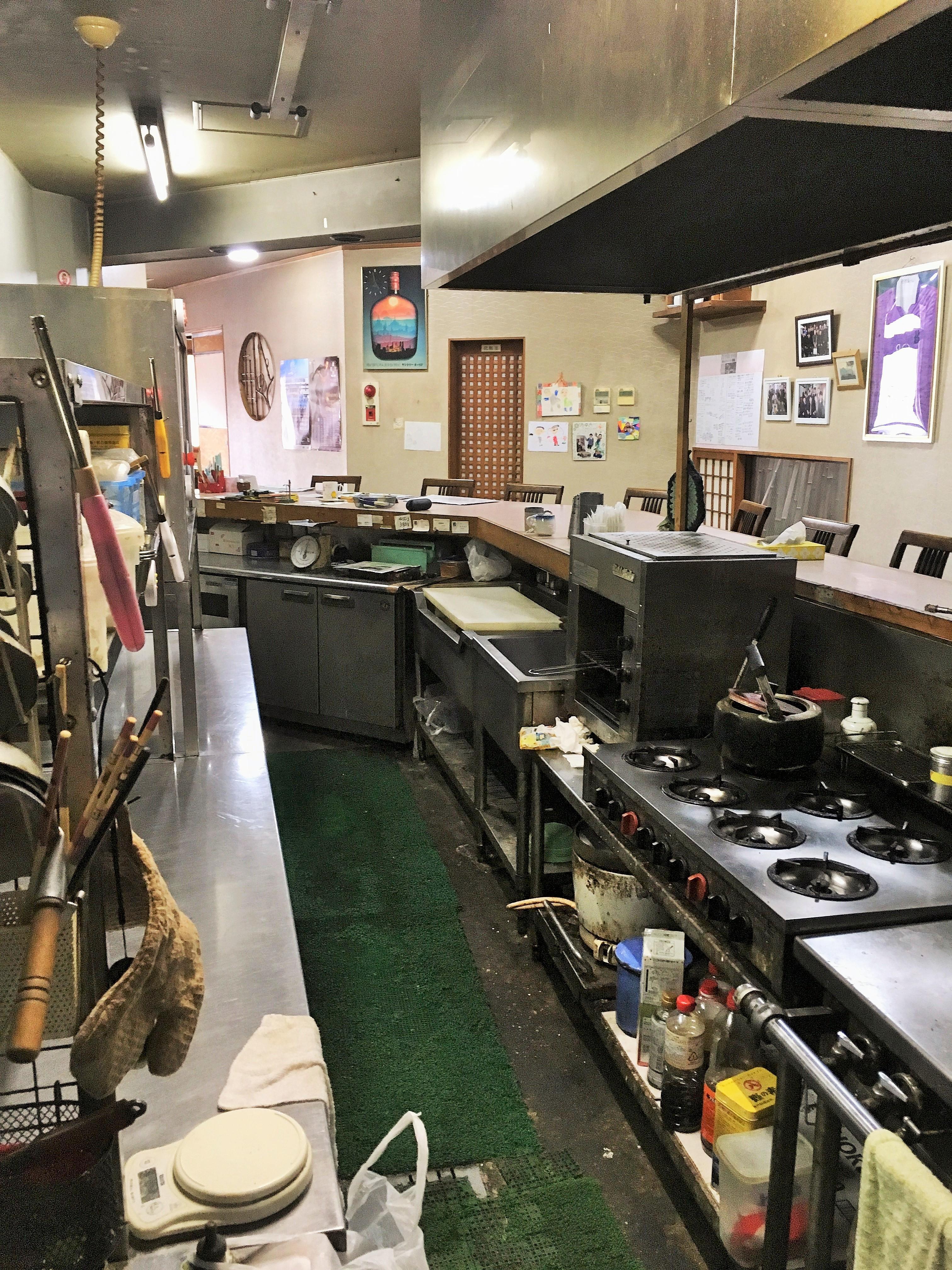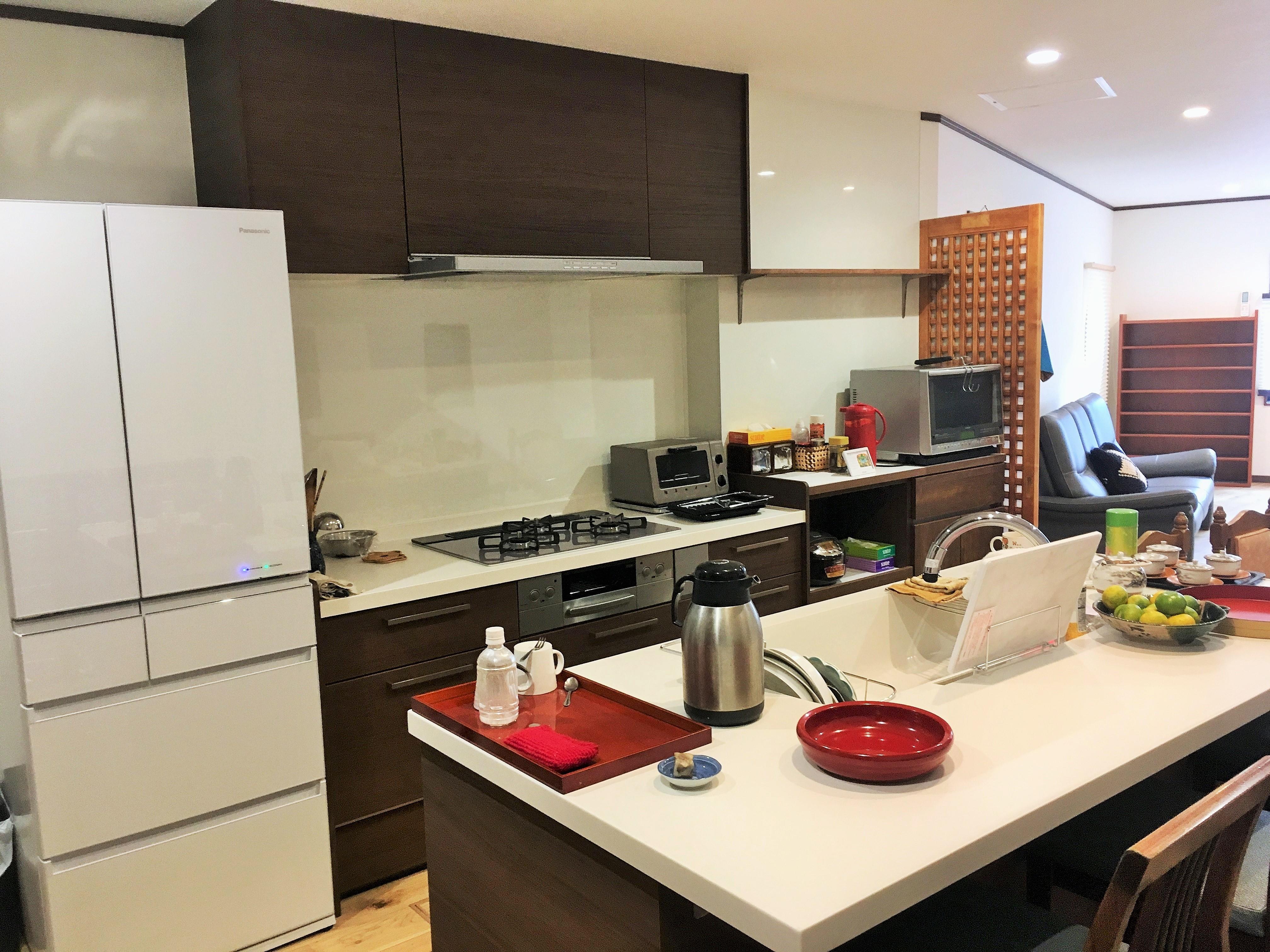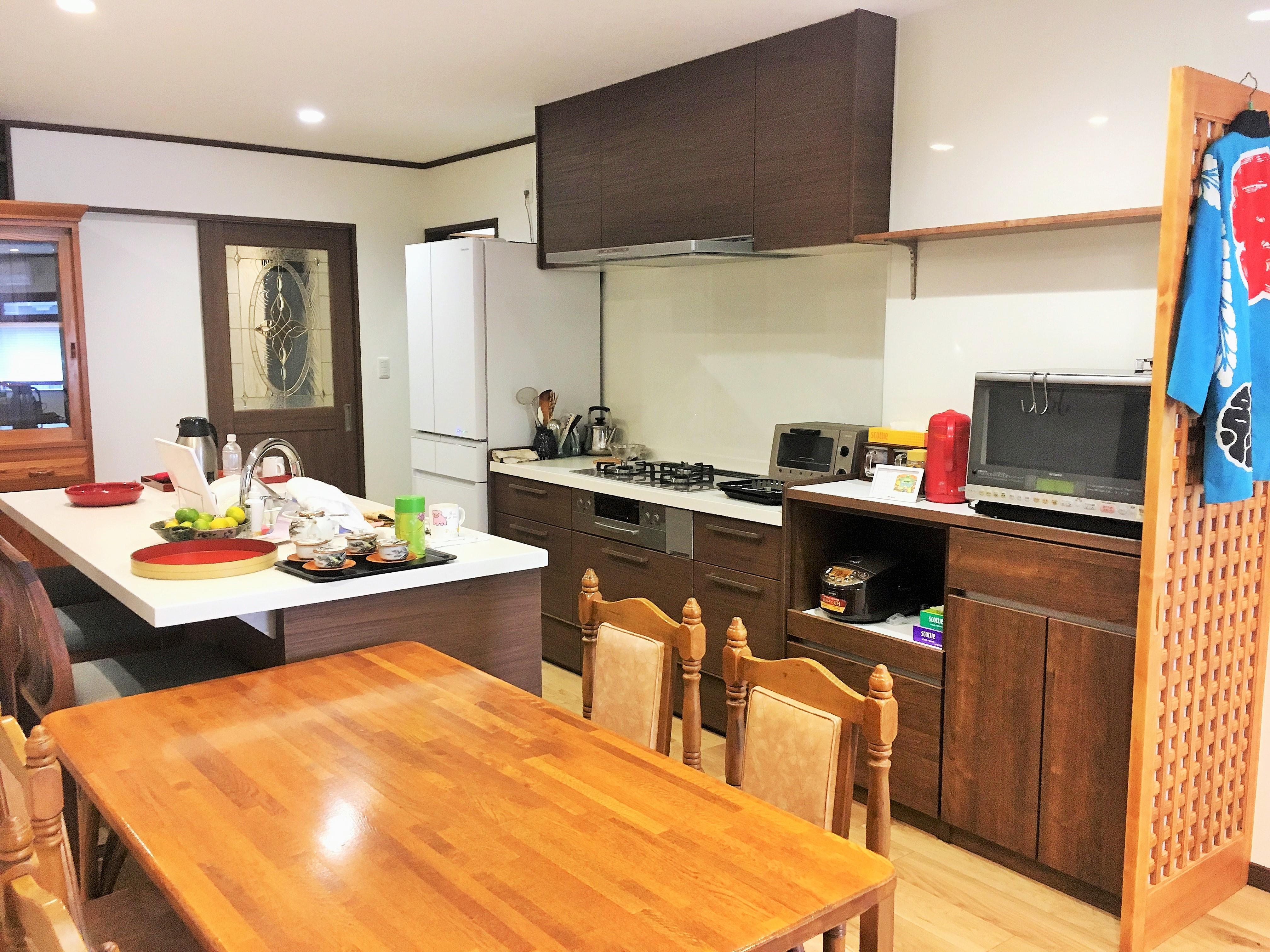 コンロキャビネットを壁付け、シンクキャビネットをアイランド配置に。並列型キッチンは最短の移動で調理が可能。奥様はもちろん、料理人のご主人様も一緒に調理をされます。この配置なら2人で厨房に立っても広々と作業ができる。割烹屋さんだったご主人様も奥様も、慣れているガスコンロでの調理をご希望。アイランド型に設置したシンクキャビネットは奥行の広い天板で、半分はカウンターテーブルとして使います。右奥に見える組子格子のパネルはリビングからの目隠しなのですが、実はこれ、店舗に使っていた引戸なんです。思い入れのあるものをリノベ後のお住まいに生かせるのはとても嬉しいこと。ほかにお客様用にしていた靴箱、ケヤキ無垢の食器棚も使ってます。※今まではお店の厨房で自分たちのご飯も作り、その場で食事することも多かったM様ご夫妻。 2階にダイニングキッチンはあるけど、ほとんどをお店で済ませていた。親戚や近所のお友だちが遊びに来ても会話しながらお茶入れ・調理ができるように、リビング・ダイニング・キッチンを並べました。