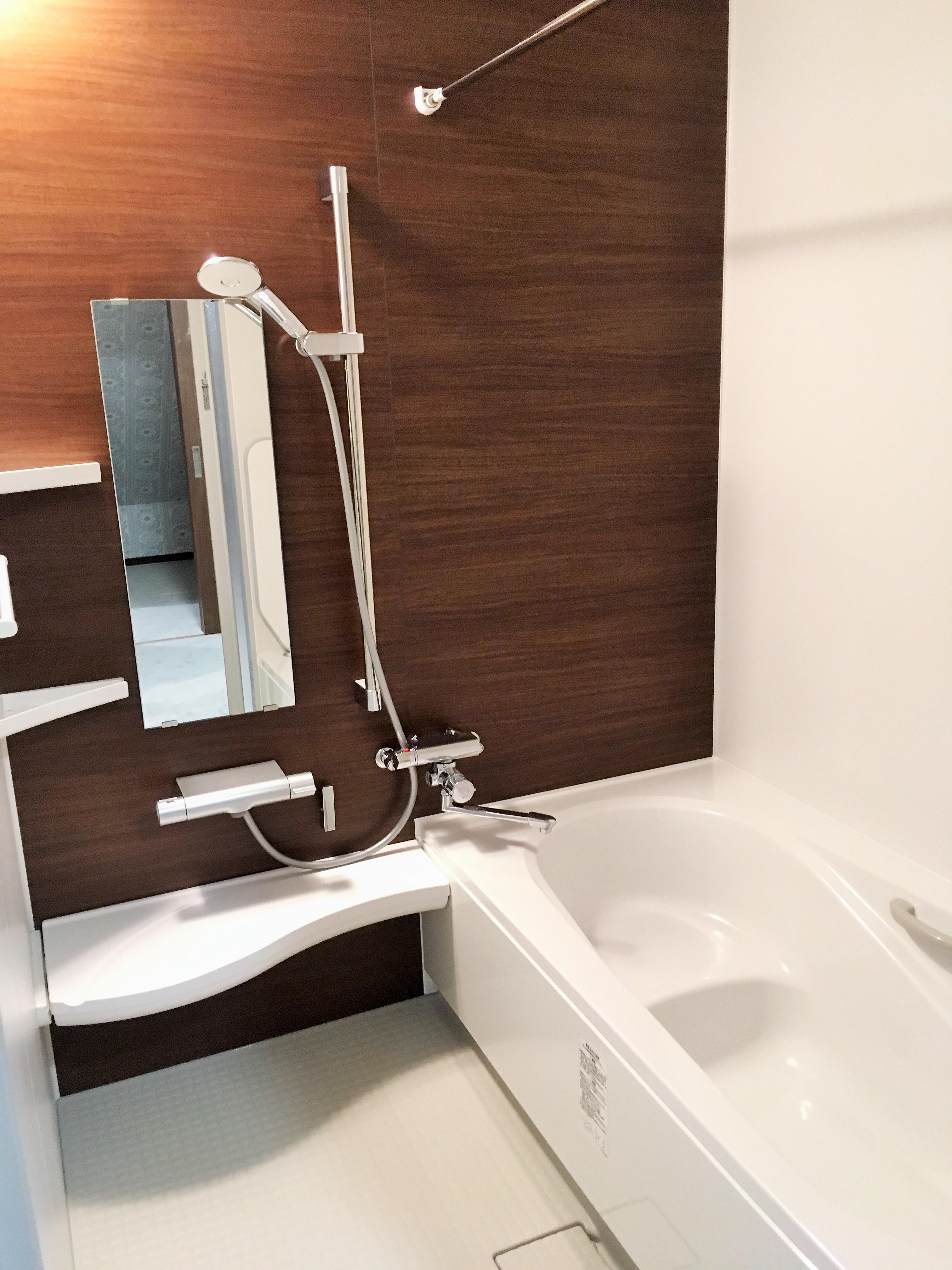 冷たいタイルのお風呂から、断熱性が高く掃除のしやすいシステムバスへ。深い浴槽から洋風の浅く広い浴槽へ。出入りも楽だし、エコベンチ浴槽で足を延ばして半身浴も楽しめます。シャワーフックバーと兼用の手摺も安心ですね。浴室換気乾燥暖房機を設置し、冬には浴室内を温めてから入ります。ヒートショック防止。建物中央の浴室のため、窓がありません。乾燥機で湿気を飛ばせるからカビ防止にもなります。年末の大掃除も手間が激減。