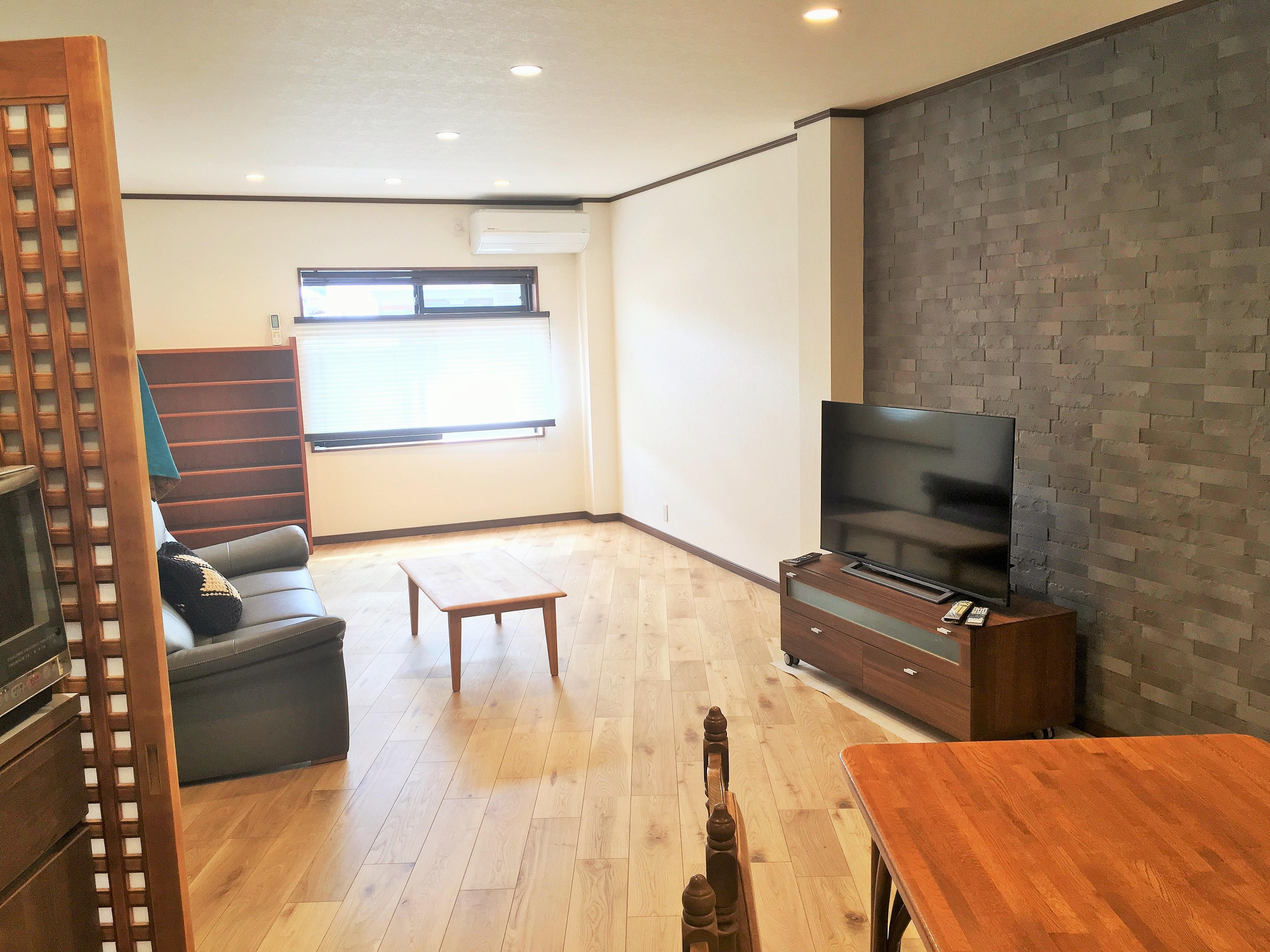 ダイニングからそのままリビングへ。建物がビミョウに折れ曲がっていたことで、空間がつながっていながらも区分けられました。鉄骨の柱型(壁の四角い出っ張り)もエリアを自然に分けるのに一役かってます。テレビの背面壁に、アクセントでもあり空気清浄効果のあるエコカラットを貼りました。「柄物のクロスじゃなくて、やっぱりタイルにしてよかったわ」と奥様。照明器具はできるだけ埋込み型や薄型を選択し、凸凹をなくすことでスッキリと空間をつなげるようにしました。M様邸は商店街にあり、すぐ表側が歩道。けっこうな人通りがあるので、窓には目隠しもでき採風もできる特殊なロールスクリーンを取付け。店舗の玄関は来客用の玄関に、裏口は車庫へ直接出られる家族専用玄関に。私もたまに遊びに行くのですが、「自分はお客様か家族か?」と一瞬考えてから、裏玄関から入ります。