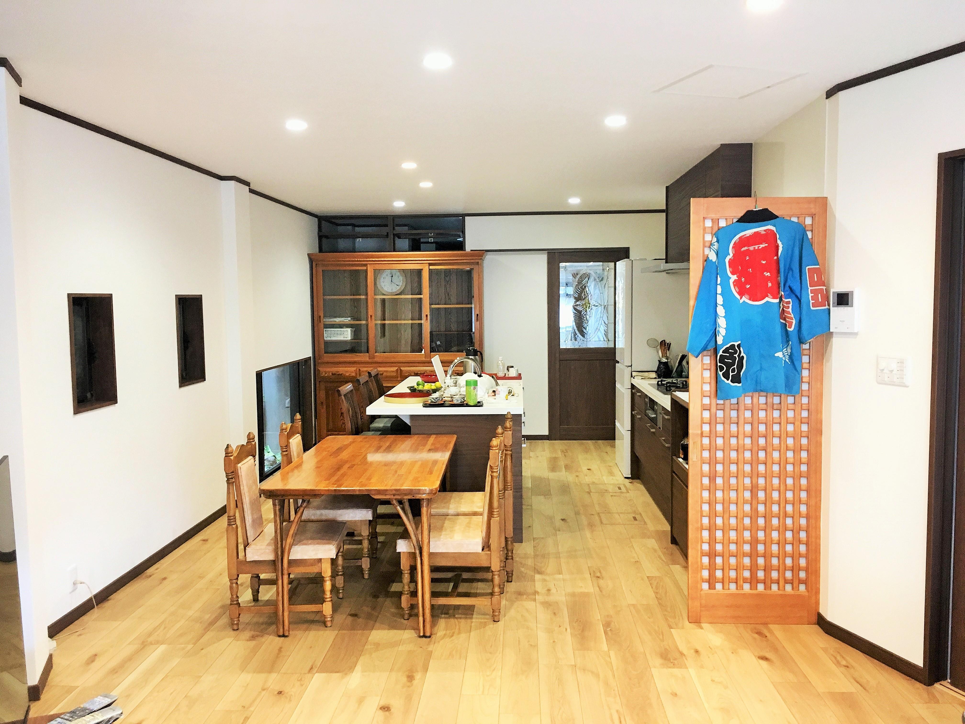 調理中でもこんなに近い!声を張り上げなくても、普通に会話できる。 忙しそうな様子がわかるから、お手伝いにも参加しやすい距離ですね。お友だちもダイニングテーブルに招いておもてなしする、リビングダイニング的な配置です。ただ空間が広いので、エアコンが大きいものになってしまいました。それでも空調の効率を上げるため、断熱材は追加して充填。
