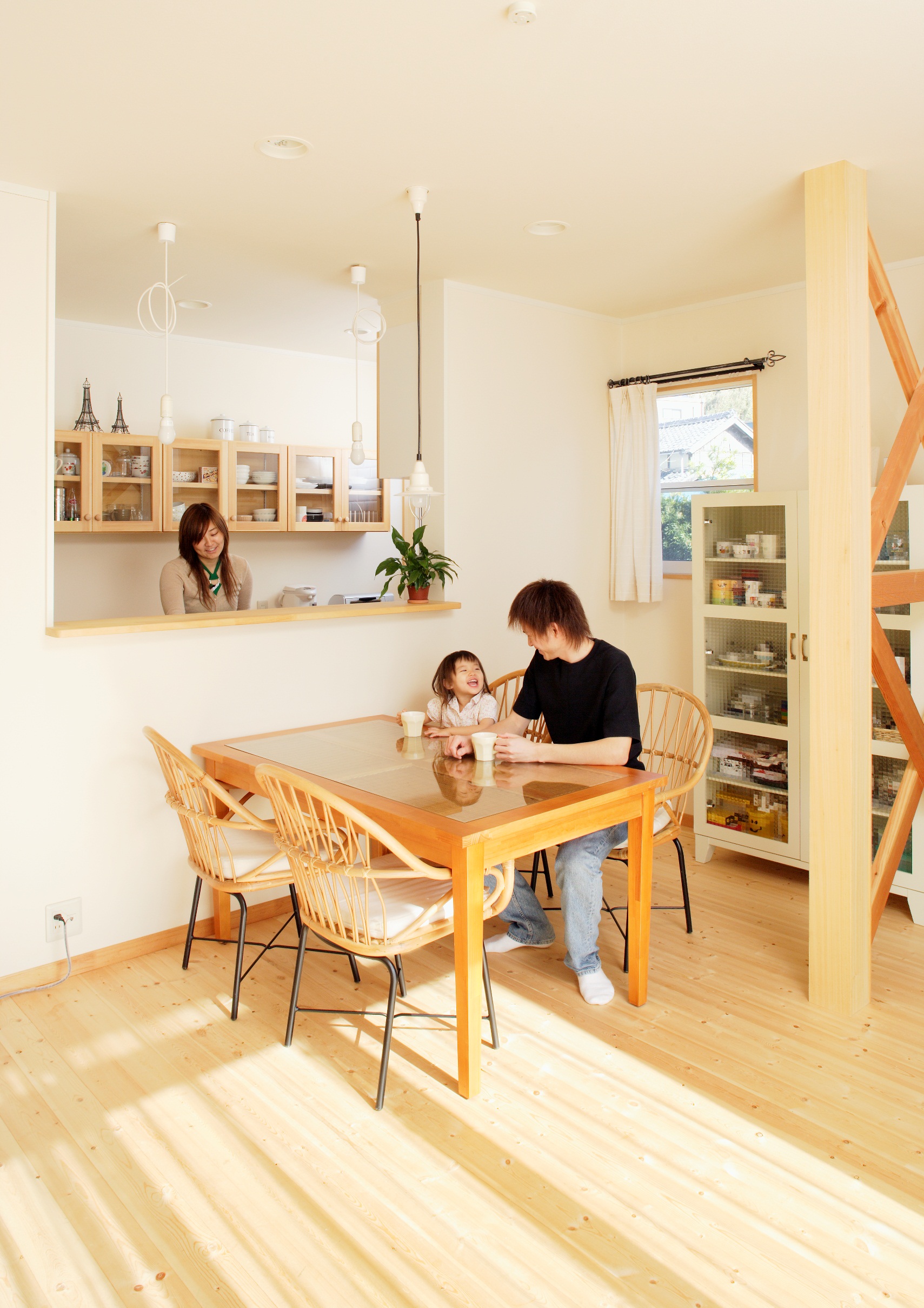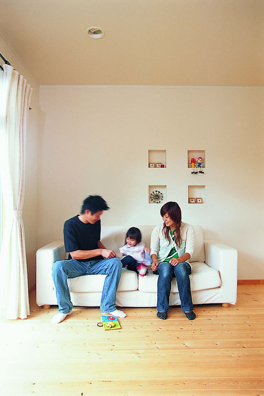 担当者と話し合ってきめた無垢材の床も、奥様の大のお気に入り。『足ざわりが良くて、スリッパがあるのに履かなくなっちゃったくらい』いつも心地よいリビングで、ご家族のおしゃべりもはずんでいるようです。