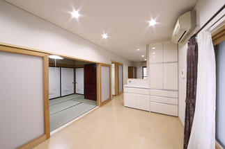 お客様は最初は水まわりのリフォームをご検討していらっしゃいましたが、お話を伺っていくと、理想は、もう少しゆったりとした空間でのんびりと暮らして行きたいとのことでした。 台所を含む3部屋が壁などで区切られていた住まいは、壁を取り払い、引き込み戸を使用するなどしてスペースを開放的に楽しむことができるようになりました。 また、すっきり住まうために収納もしっかり確保。そのため普段使わないものが見えない空間で時間を優雅に楽しむことができます。 リフォームで壁を取り払った際、あわせて耐震工事もしました。築40年近い住まいは、耐震のための工事がされていなかったので、これを機にしっかりと構造計算をし、耐力壁等を使って補強しました。 外観もリフレッシュ。外観は壁やトイ、ブロック等を塗り替えて明るい雰囲気に、玄関ドアも外観に合わせて交換しました。 (玄関ドアは「1dayリフォーム」。サイズを変えずに1日で玄関ドアをリフォームすることができます。) 夫婦それぞれの居場所を確保しつつ一体感のある素敵なリフォームが完成しました。