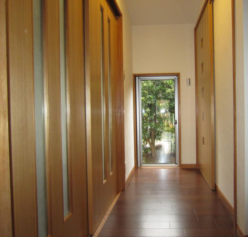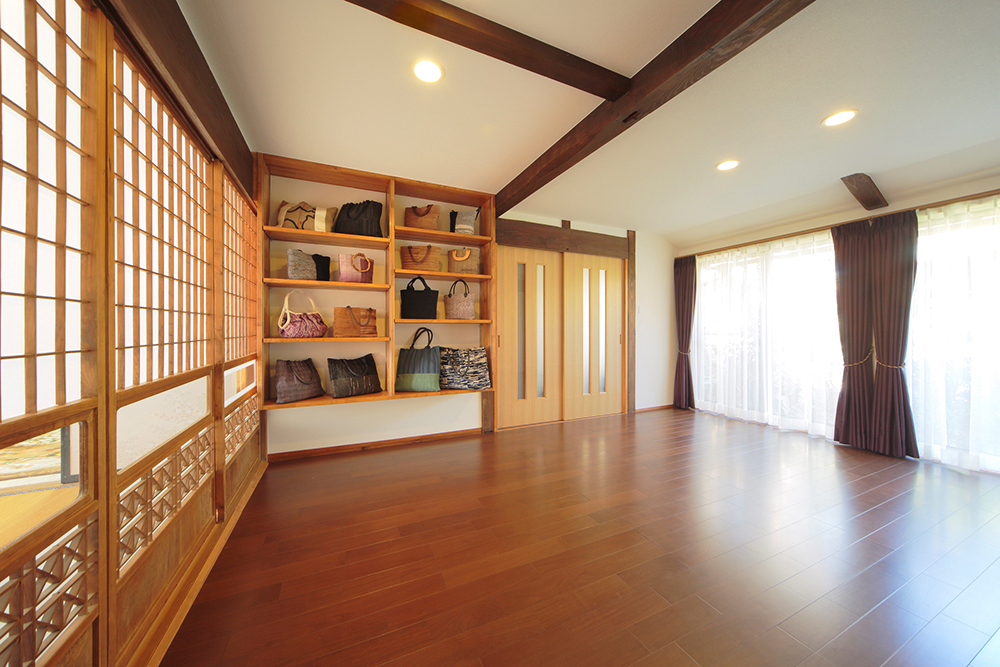 【1】 これからの時間を、ゆったりすごす為に、時には一人の時間を楽しむことができるように機織りの部屋やそのための来客の部屋をつくりました。 【2】 LDKを一部屋にして、全体の色調を白とダークブラウンの濃淡をつけることで明るい印象の部屋となっています。 なるべくスッキリ住まうことが理想だった奥様のためにアイランド型のキッチンを提案。 キッチンの背面には、食器棚と家電収納庫をつくって、料理好きな奥様が、お友達と一緒に料理ができるような空間としました。 キッチンのキャビネットも、扉を引くと、パッと見渡せ、パッと取り出せるように調理中の無駄な動作や段取りを減らして、気持ちよく料理に専念できるキッチンです。 【3】 お料理好きな奥様には、お料理道具も食材をストックできる場所が必要です。 【4】 その為に、食品庫を設けています。 各部屋に、それぞれの収納場所を設けることで、スッキリと住まうことが可能です。 【5】 おばあちゃんのためにと始めたリフォームですが、それは、今後の生活の中で、誰にとっても優しいリフォームになっています。