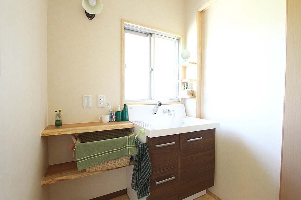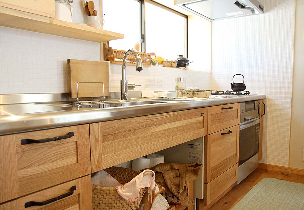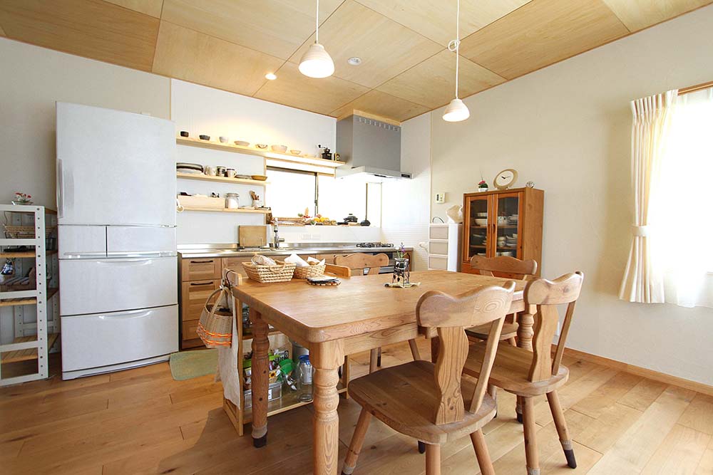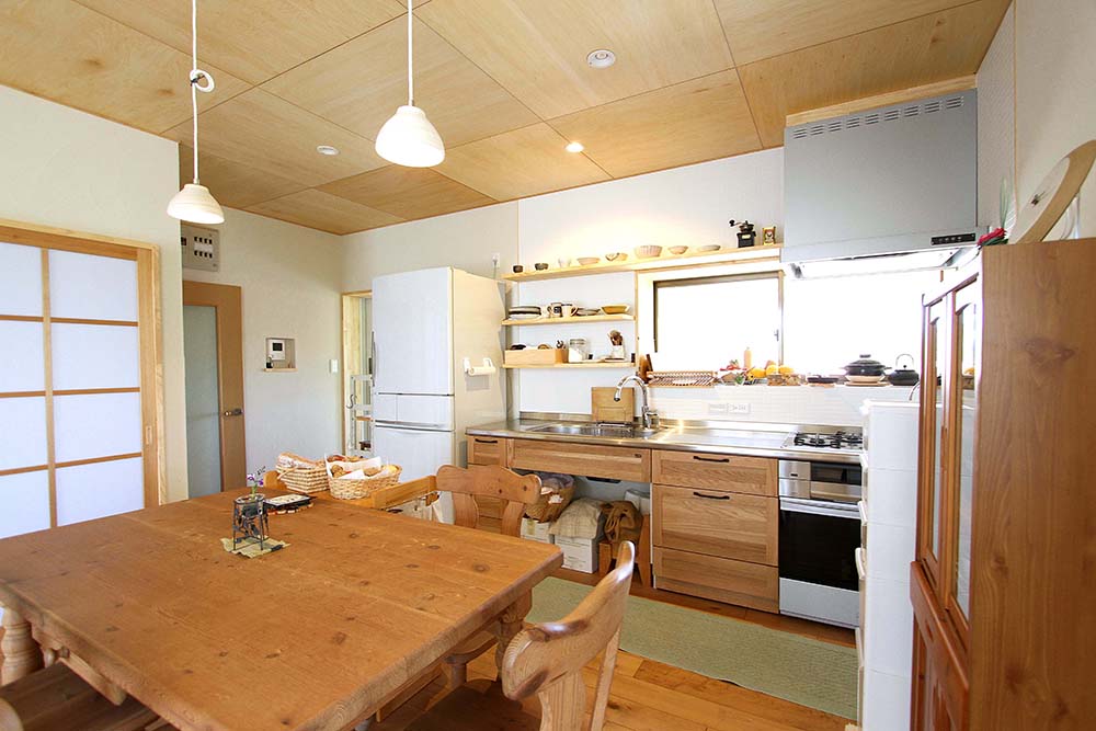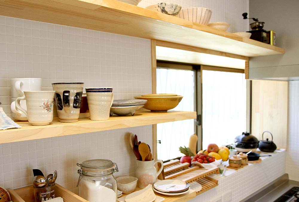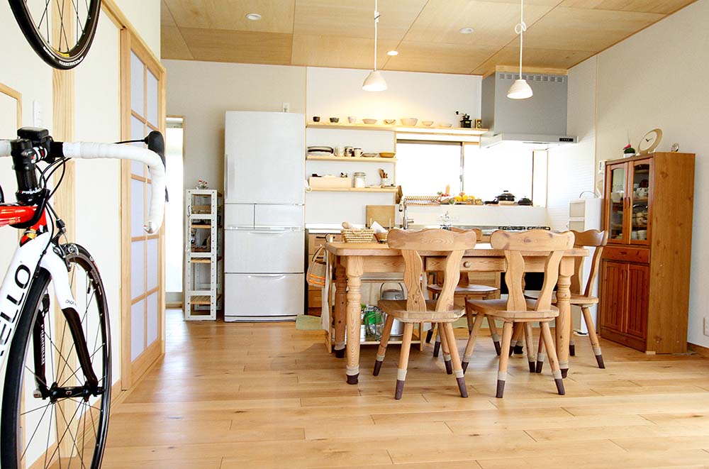 【1】 築41年の住まいを快適に過ごすために、長い時間をすごす部屋を重点的に(LDK・寝室)、断熱材や内窓の施工によって機能性をアップさせ、床材を無垢材・壁には、珪藻土・タイル、カーテンは、綿・麻素材を使い、自然の風合いのある寛げる空間としました。 【2】 既設の家に収納が極端に少ない空間だったため、押入れを有効的に使えるように、一間の押入れも可動棚をD40cmとし、細々と収納できるようにした。 部屋を解体後に階段下を利用して収納箇所を増やすことが可能だったためS様と相談し、収納箇所を増やしました。 【3】 夫婦の時間も趣味の時間も大切にするお二人の為に、部屋の壁にご夫婦の趣味であるロードバイクを飾ることを提案しました。 【4】 LDKの掃出し窓をあけると、道路に面していて、暮らしていくのに道路からの視線が気になるような立地条件だったため、メッシュフェンスの提案をした。 メッシュフェンスを設置することで、趣味の植栽をしながら、道路からの視線が気にならないようにしました。