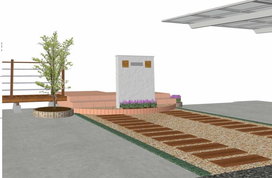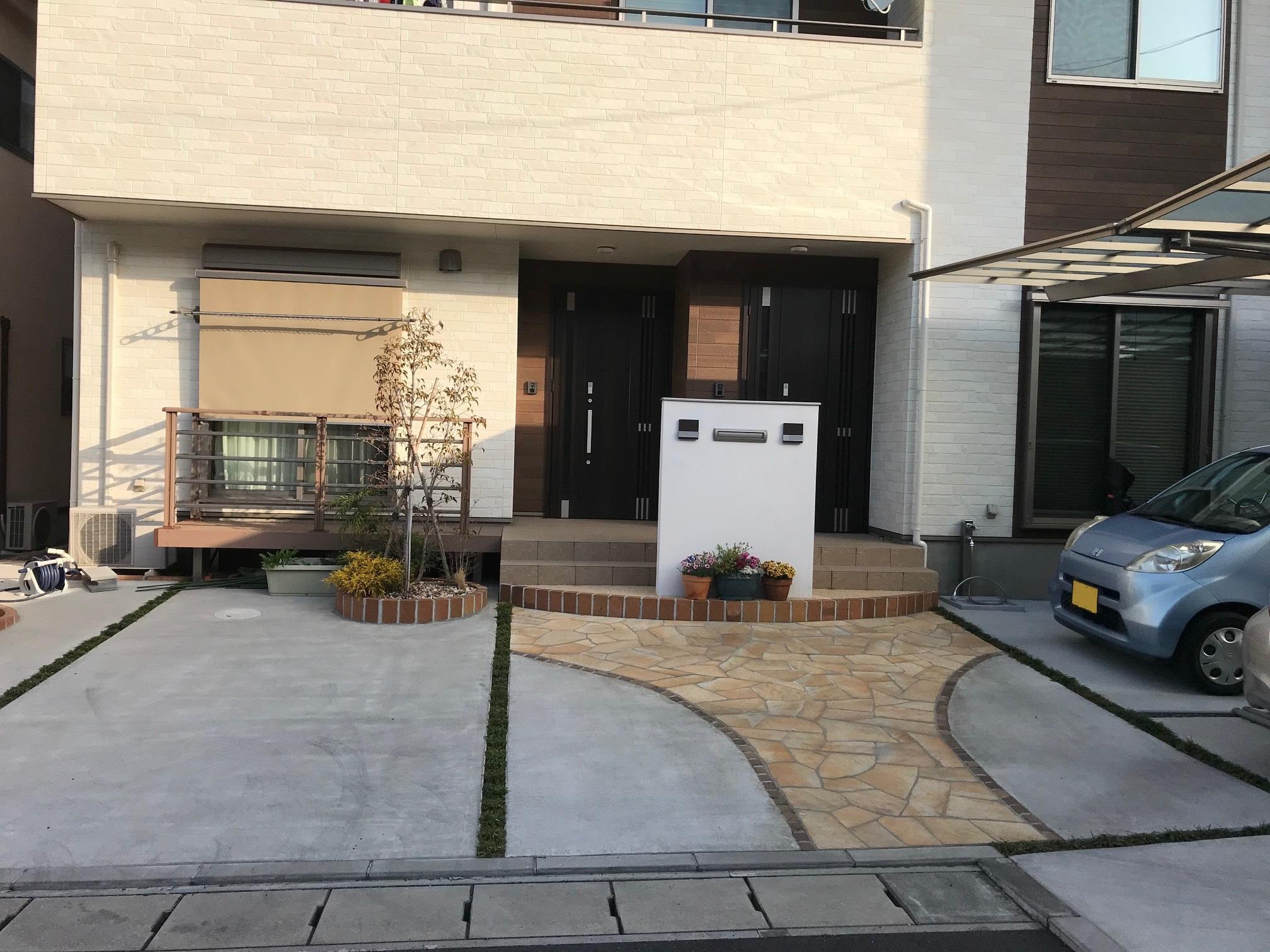 玄関前には目隠しと表札またエリア分けの意味で門柱をセット。またお客様のご希望で家族が成長していく姿を何かべつの物で感じたいとの事から