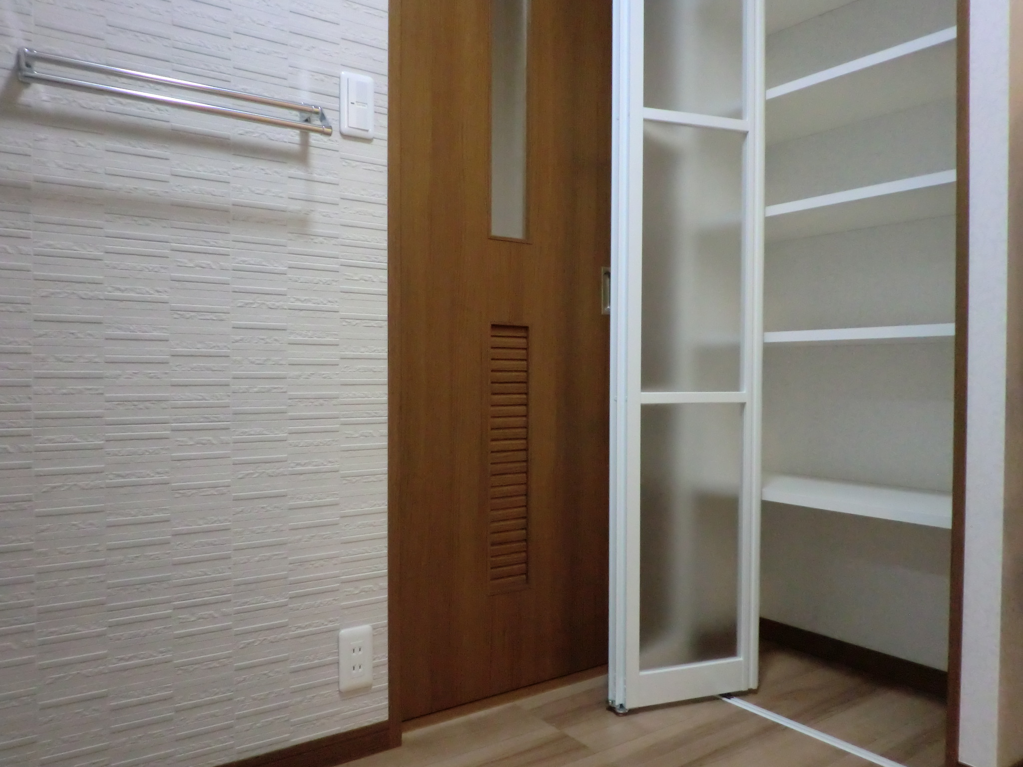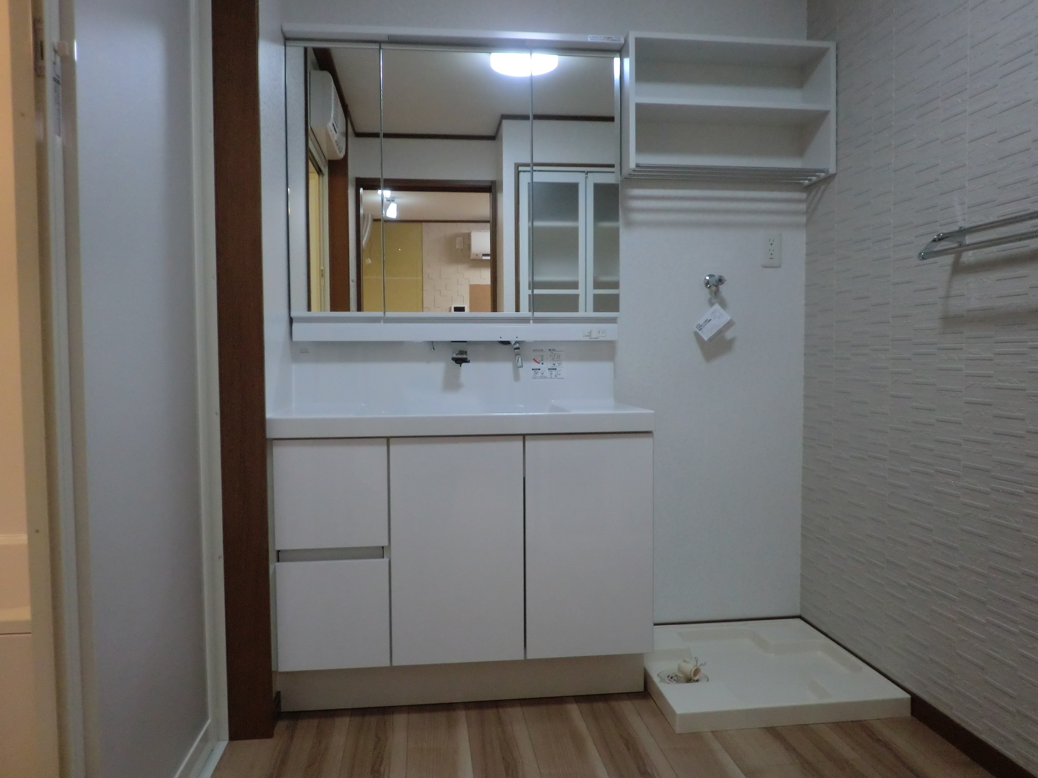 洗面脱衣室です。衣類やタオル、洗剤などのストックも収納できます。