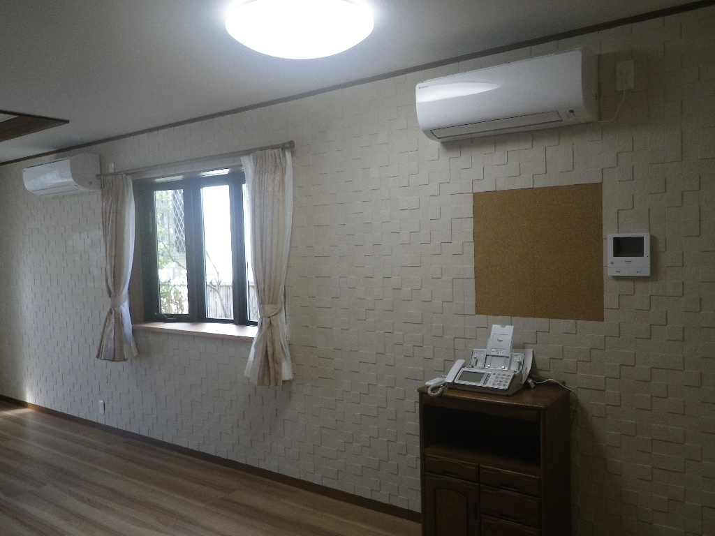 リビングにもエコカラットを貼りました。電話台の上の部分に貼ったコルクボードには、ちょっとしたメモを貼れます。