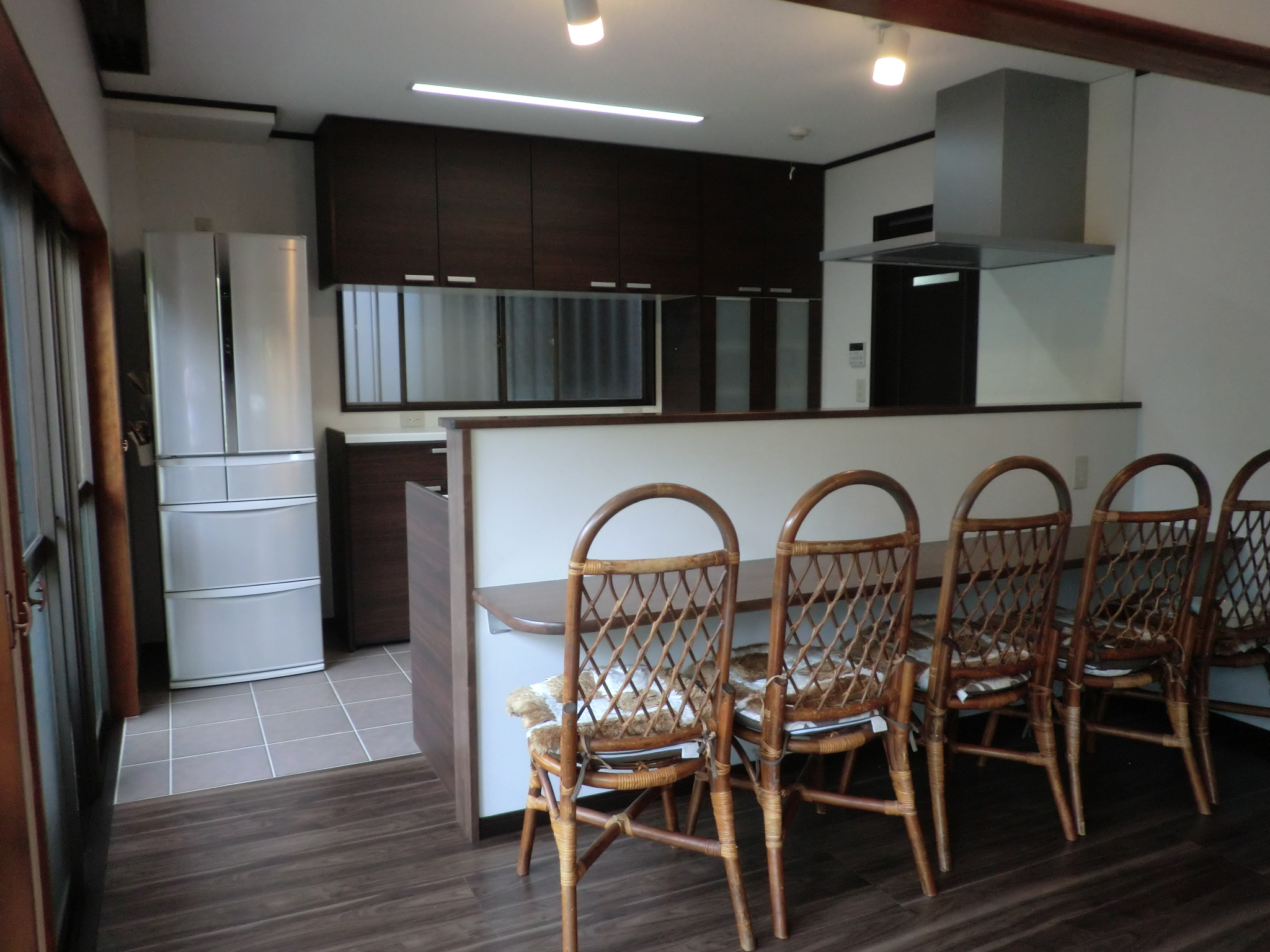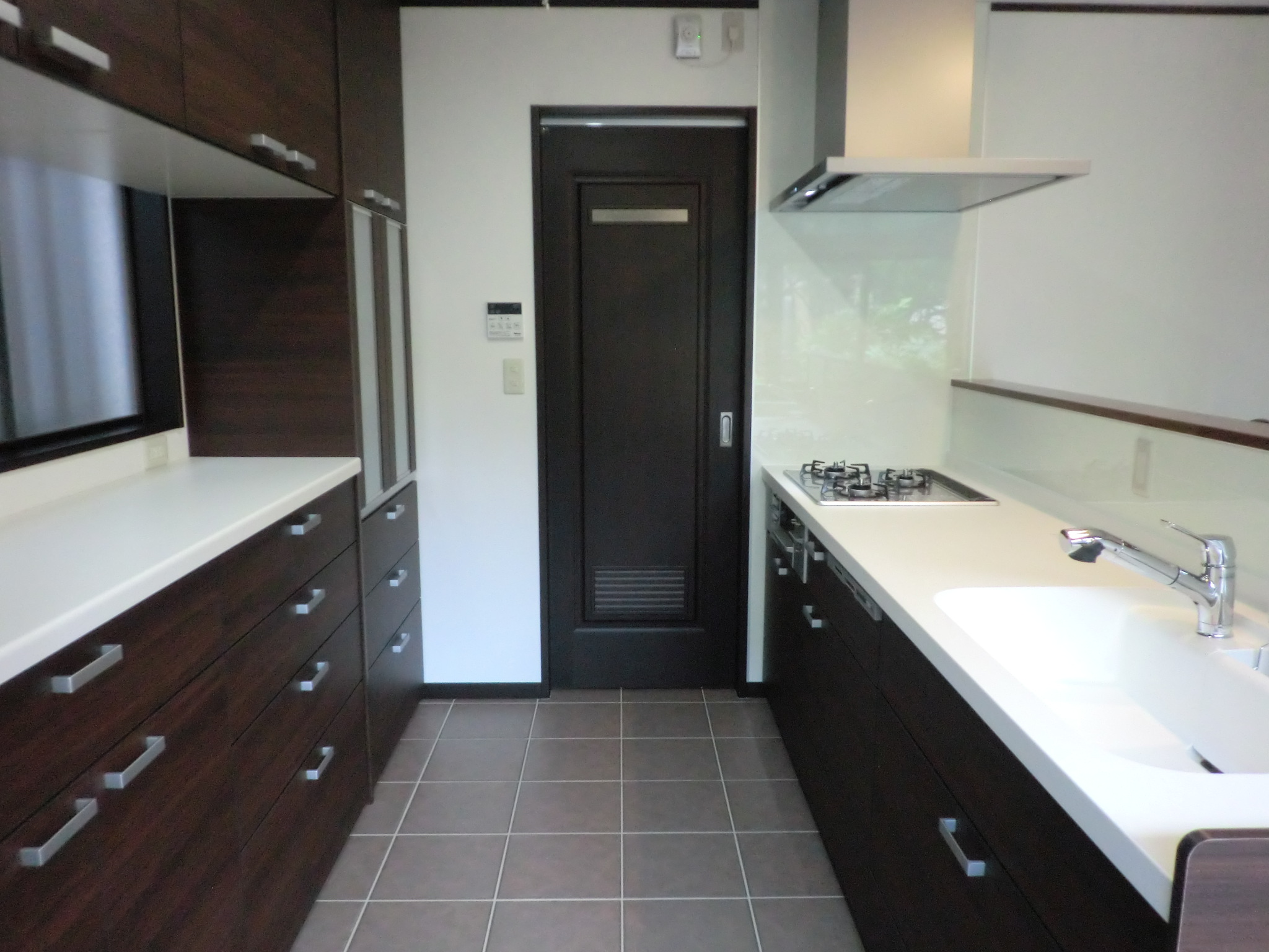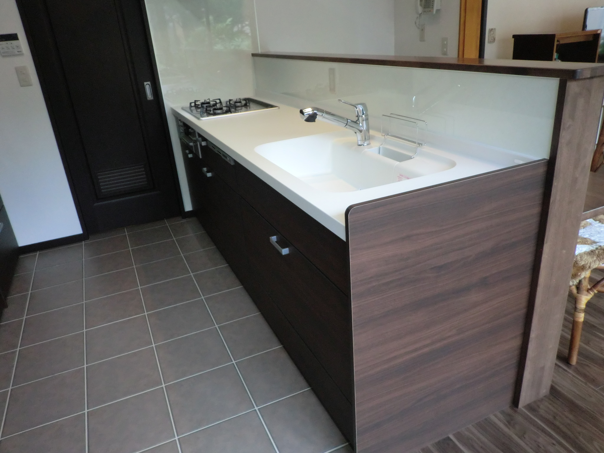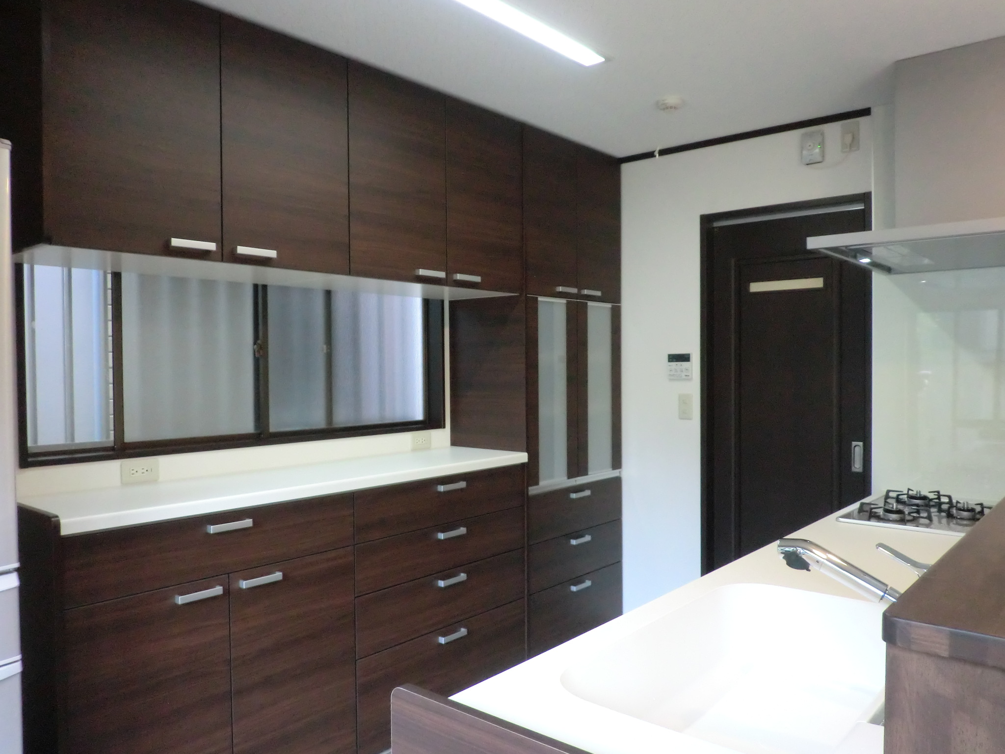 以前は壁付けのI型キッチンでした。打合せの際に、奥様から「出来るのであれば対面式のキッチンにしたい」というお話を伺い、奥さまのイメージに合うようなプランをご提案致しました。また、色々な色を入れてゴチャゴチャさせたくないとのことでしたので、キッチン・洗面・浴室に茶系の色味を選定し、お洒落で落ち着いた雰囲気に仕上げました。