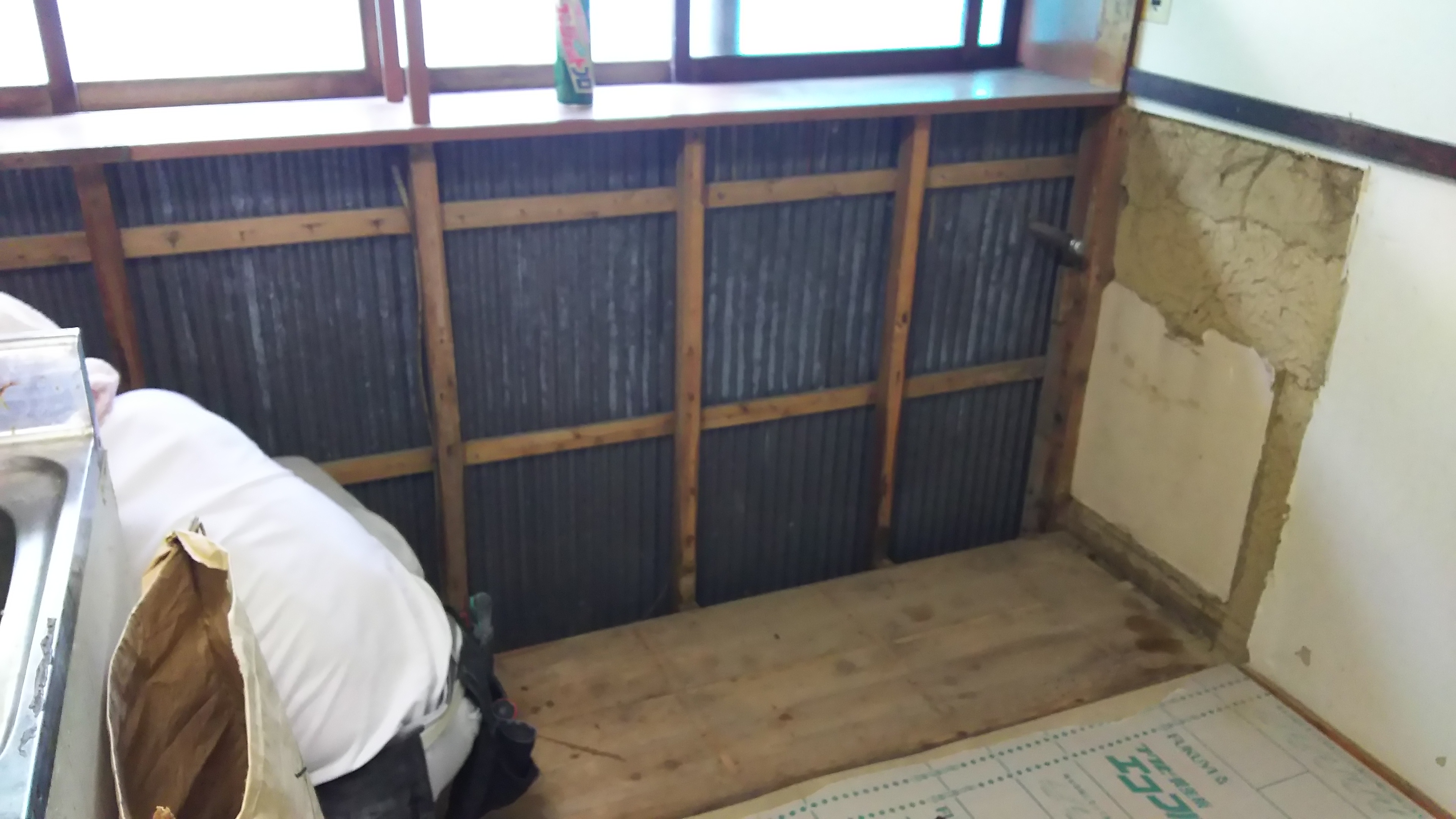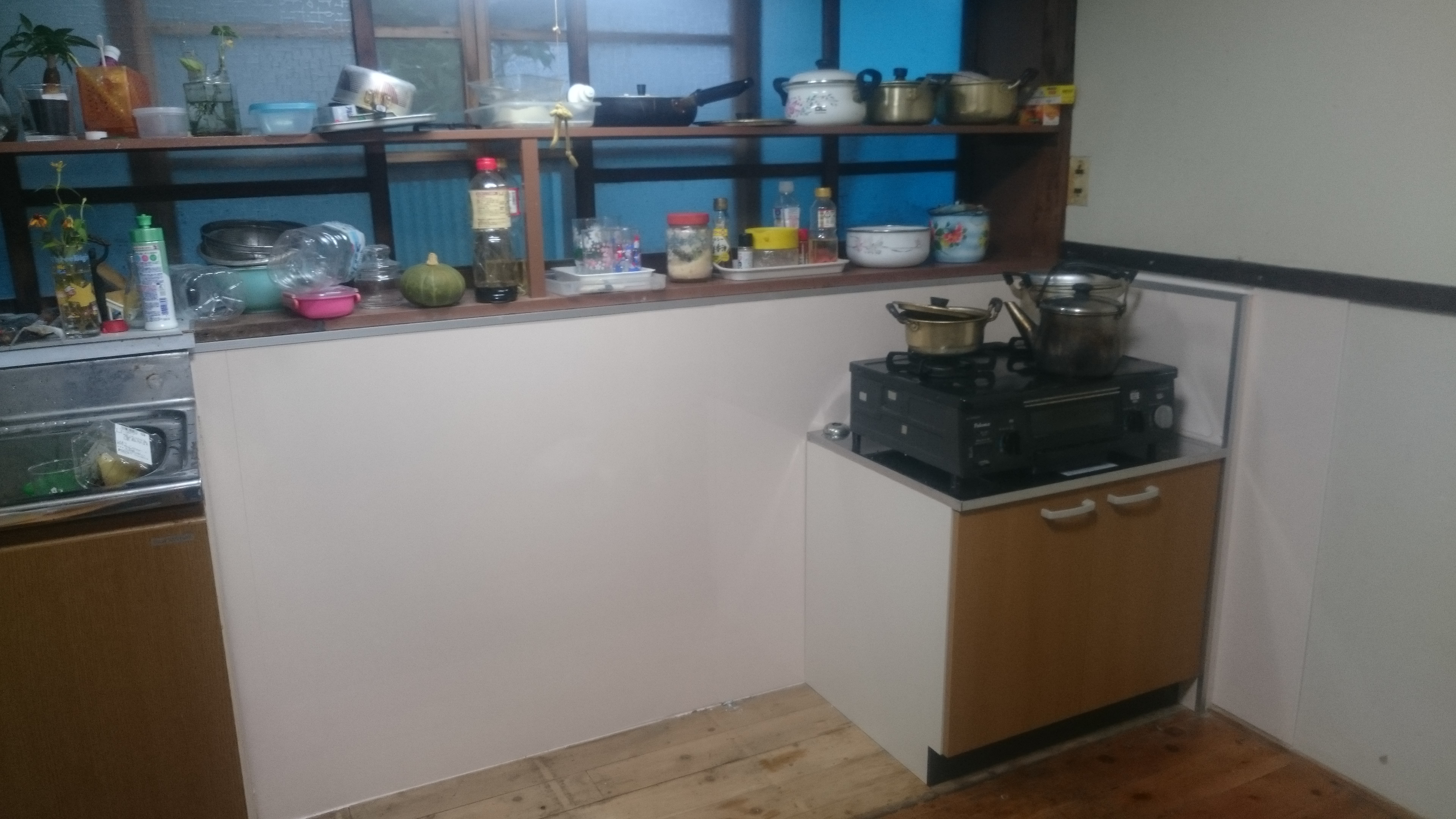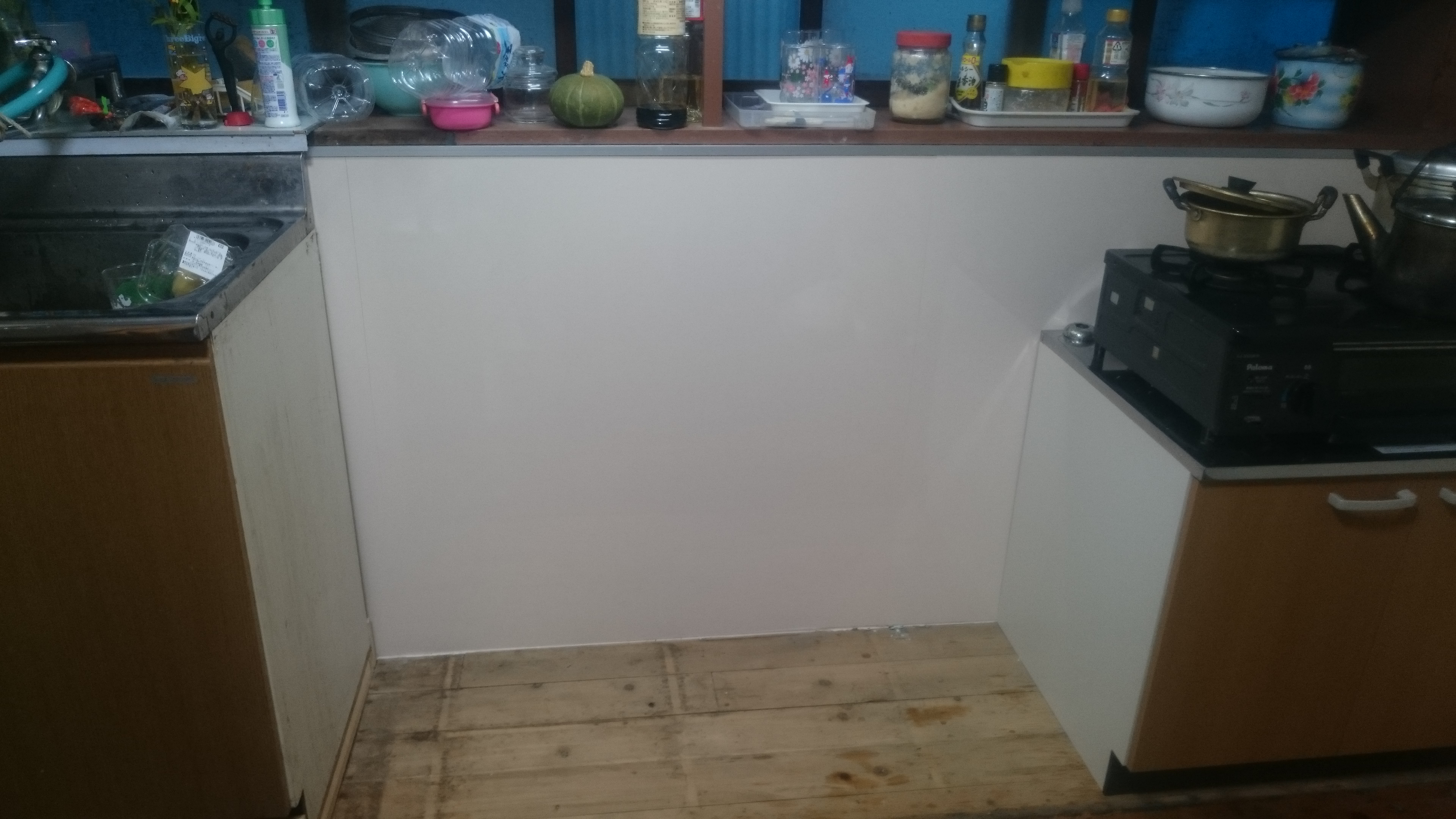 ネズミがでてしまって、調査をしたところキッチンの壁に穴が開いていてそこから出入りしているようだったので、キッチンを撤去し、壁補修をしました。今まではべニアでしたが、ボードにかえてキッチンパネルを貼りました。
