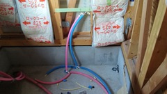 洗面化粧室は洗面台の取り替えに合わせて内装も貼り替えました。洗面化粧台のカウンターとミラーの間にはモザイクタイルを貼り、向かって左の壁には一面エコカラットを貼りました。貼ったのはオレンジ色の可愛いガラスモザイクタイルです(^^♪エコカラットは、水廻りに貼れるエコカラットプラスを。デザインは布柄のホワイトです。
