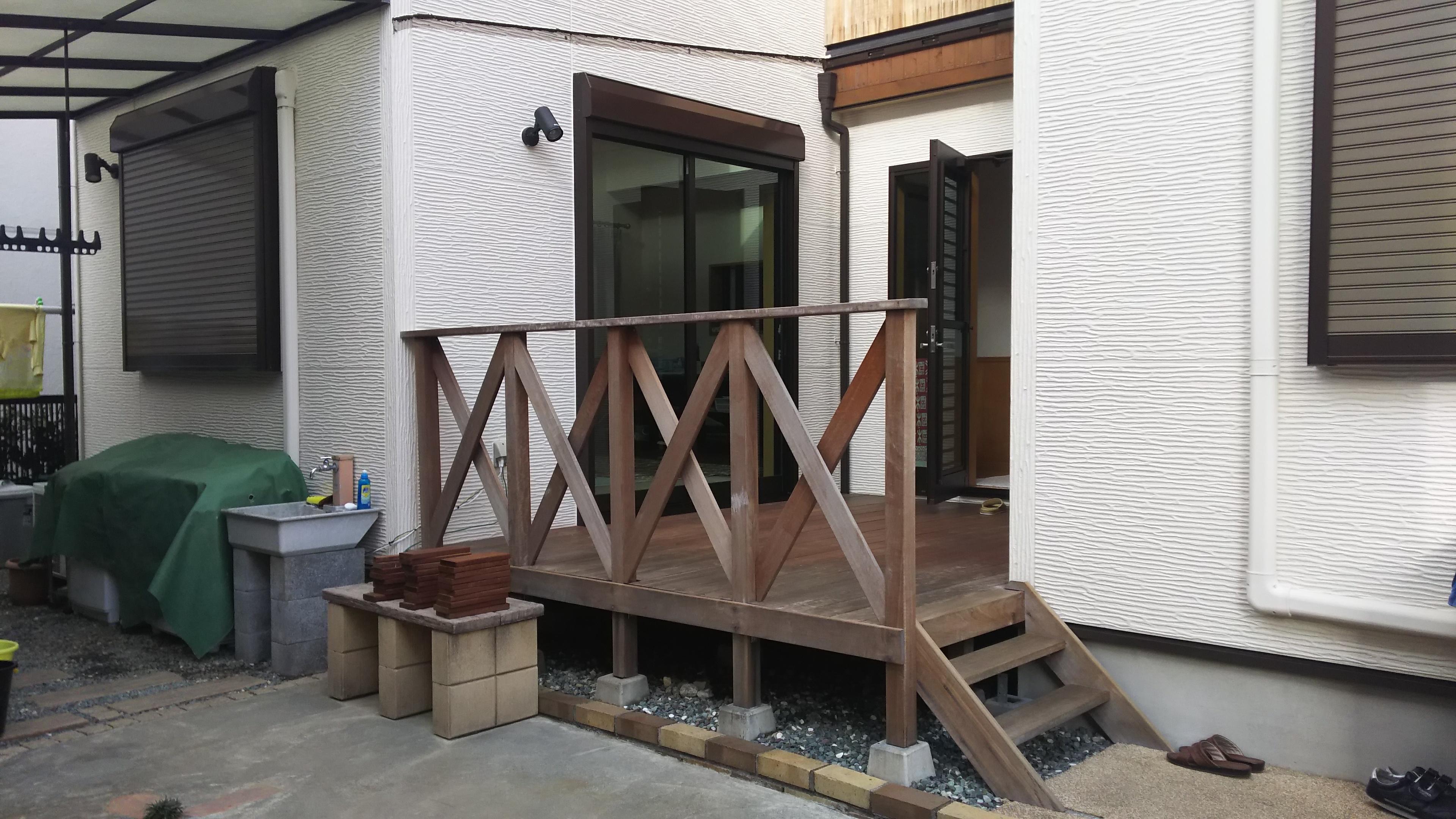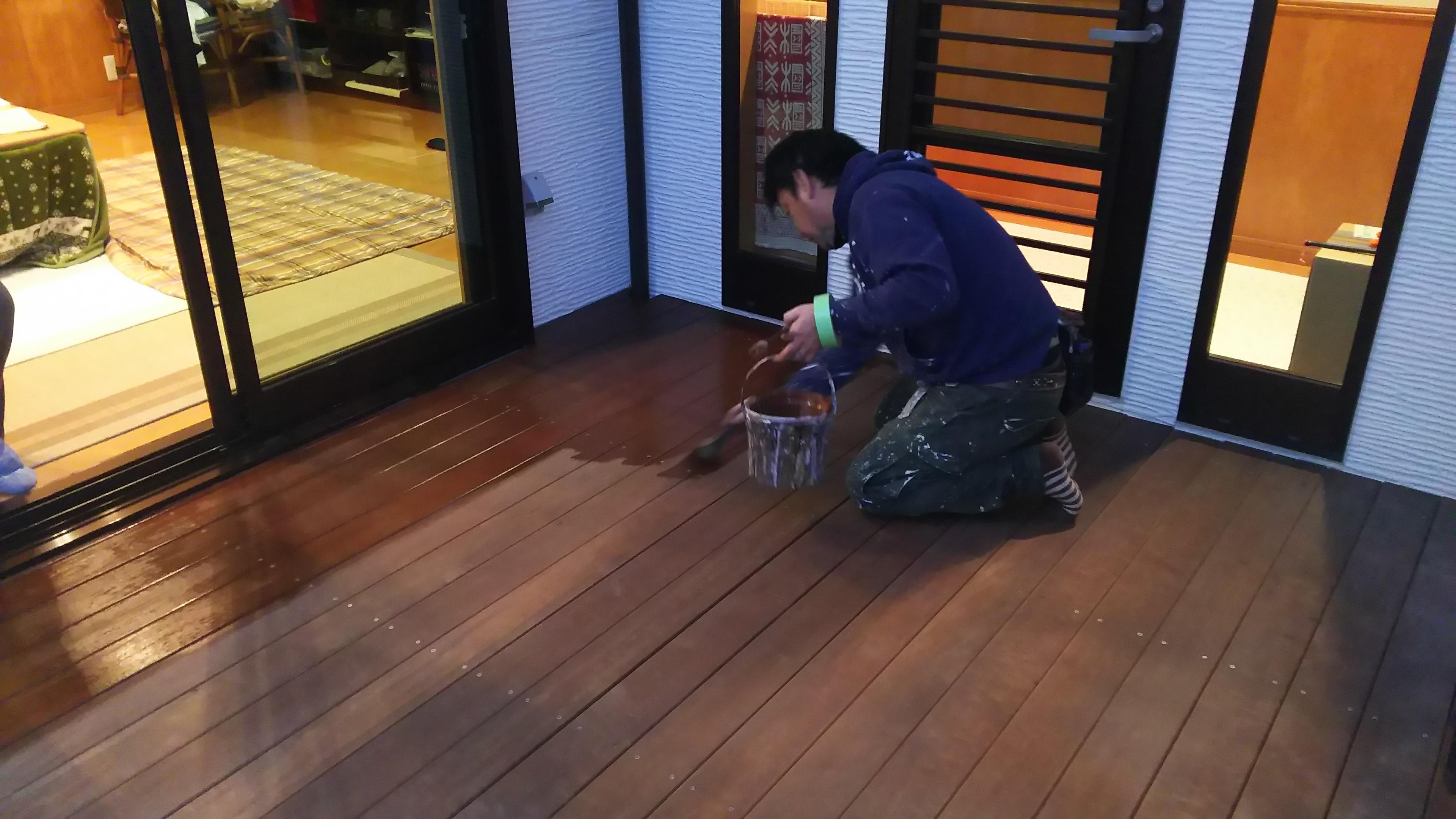 木の種類や場所(室内外)によって使用する薬品も変わる為、洗い出しやしみ抜きなど色々な方法を試しながら一番きれいに仕上がる方法を模索しながらの施工でした。薬品や塗料を塗った後は乾かすための時間が必要で、半日ずつの工事が続き予定よりも工期が長引いてしまいましたが、完成後キレイになったウッドデッキを見ながらお客さまから『大変満足です!』とお言葉を頂き、嬉しく思いました(*^_^*)